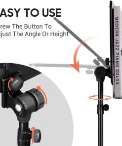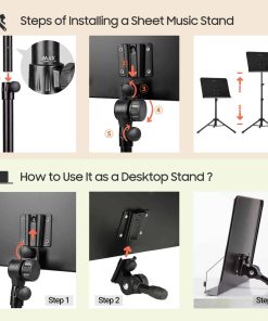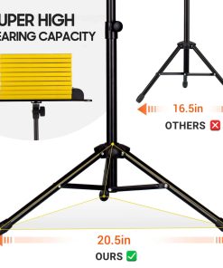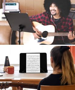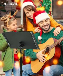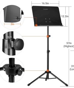 Por qué elegir este soporte para partituras El soporte de música CAHAYA es plegable y fácil de llevar. Además, está diseñado con un material bueno y sólido que sin duda le da la sensación profesional. Extensible y ajustable: ideal tanto para actores sentados como de pie (la altura se puede ajustar de 31.5 in a 57.0 in). Pomos fáciles de usar para ajustar la inclinación: la bandeja de música se puede inclinar hasta 180 grados, lo que facilita el ajuste del ángulo. También la bandeja de música puede soportar una capacidad de hasta 12 libras para un máximo manejo del peso (como un libro, un montón de hojas o tabletas). Trípode estable para una excelente estabilidad: las patas del trípode se pueden extender ampliamente para un propósito estable. Las patas de trípode están hechas de goma antideslizante para una máxima estabilidad. Fácil de transportar: ya que este producto es portátil, fácil de montar y plegar, viene con una bolsa de transporte a través de la cual los viajeros pueden llevarlo donde quieran. Accesorios adicionales: una bolsa de transporte y una carpeta de partituras. Carpeta de partituras A4 con 40 bolsillos para 80 hojas de música. Contenido del paquete: 1 bandeja para partituras 1 trípode extensible y plegable. 1 bolsa de transporte. 1 carpeta para partituras