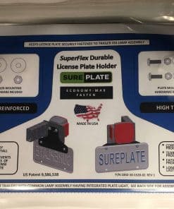 El SurePlate(TM) EM16002 Economy-Max, Fijación) es nuestro producto de menor costo en esta serie que incluye: 1. (1X) Soporte de placa de licencia de neopreno de goma reforzado con tela de 4 agujeros (8.75 x 5.38 x .19 pulgadas). 2. (4X) Tuerca de seguridad de acero inoxidable, nylon-inserto, 0.250-20, 0.4375 W, .3125 H pulgadas. 3. (4X) Arandela plana de acero inoxidable, 0.250 ID X 0.625 OD pulgadas. 4. (2X) Arandela plana de acero inoxidable, 0.250 ID X 0.875 OD pulgadas, 5. (2X) Tornillo de acero inoxidable-Cabeza de pan, Phillips 3, 0.250-20, 0.750 L pulgadas. Este producto utiliza la cantidad mínima de goma para proporcionar un montaje seguro en su remolque. Montura de lámpara no incluida. Los productos SurePlate(TM) evitan la pérdida de la placa de licencia de su remolque/camión. Este producto mantiene su placa de licencia firmemente fijada a un montaje de lámpara de freno/cola DOT estándar del lado izquierdo con luz integrada. El producto simplemente se monta entre el soporte existente de montaje de luz trasera del remolque y la montura de lámpara existente. Este producto fue diseñado para remolques de botes, motos de agua, motos de nieve, ATV y de servicios públicos. El producto es duradero, flexible e impermeable para evitar la corrosión y garantiza la seguridad duradera de su placa de licencia. Este producto está hecho de goma de neopreno de 0.188 pulgadas de grosor reforzada con tela de alta resistencia. El producto es lo suficientemente rígido para presentar adecuadamente la placa de licencia mientras se mueve y lo suficientemente flexible para evitar daños durante un encuentro accidental con obstrucciones menores. Los productos SurePlate(TM) fueron diseñados para ofrecer longevidad. No apriete demasiado los sujetadores, puede dañar la goma. Obtienes lo que pagas. ¿Cuál es el valor de lo barato cuando los competidores están produciendo productos de metal que se corroen y productos de plástico que fallan ¿Nuestros clientes saben que los productos SurePlate(TM) valen la pena para prevenir el tiempo y el dinero en obtener un reporte policial de placa perdida y un viaje posterior al DMV. ¿No vale la pena la acción preventiva y el costo de los productos SurePlate(TM) 2 horas de tu tiempo más las tarifas del DMV por una placa perdida Fabricado en EE. UU. Nº de patente 9,586,538.