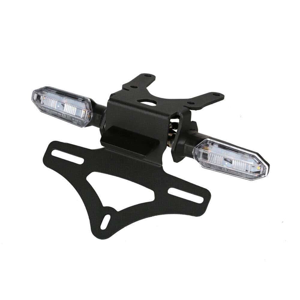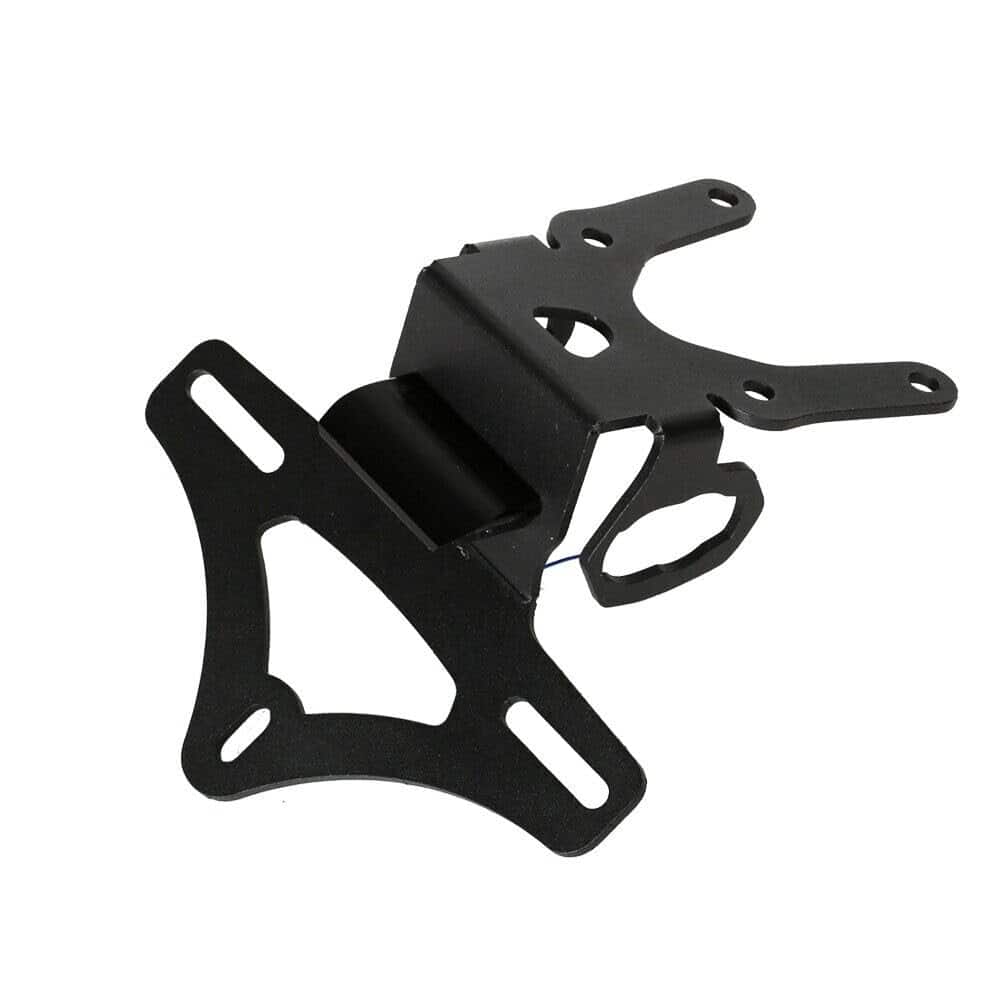 Soporte de placa de matrícula con eliminador de guardabarros trasero e indicador LED para VERSYS-X300 VERSYS-X250 2017-2024. Este marco de matrícula trasera tiene un diseño compacto, hecho de lámina de aluminio de 3 mm cortada con láser, superficie recubierta, equipado con una lente acrílica transparente y cubierta de ABS, duradero y de alta calidad. La luz de la matrícula consta de tres LEDs ultra brillantes blancos, alimentados a 12V / 1-2W. Las luces LED pueden iluminar claramente la matrícula por la noche, mejorando la seguridad de la conducción. Las luces intermitentes tienen dos cables (positivo y negativo) que deben conectarse manualmente y no son plug-and-play.