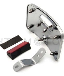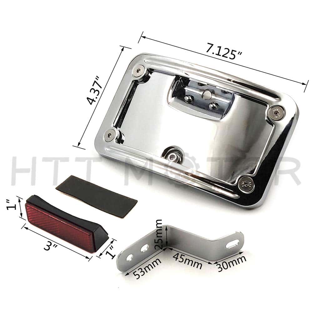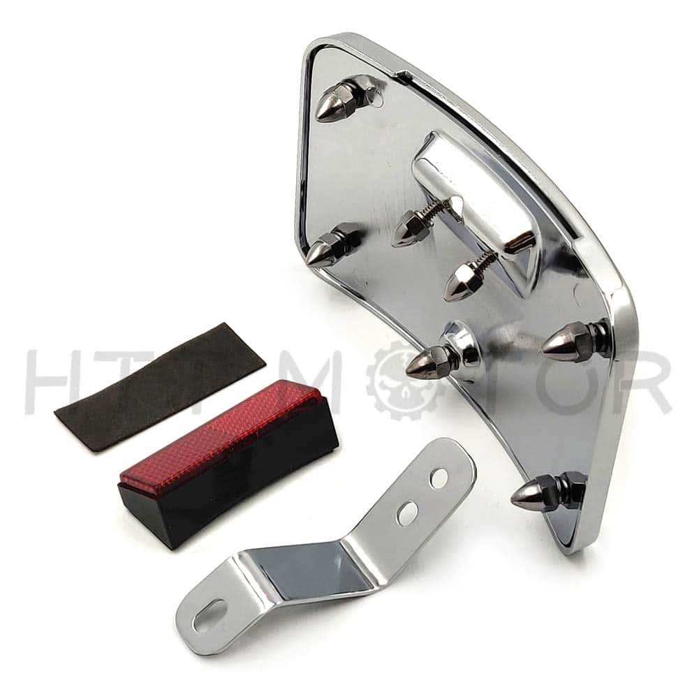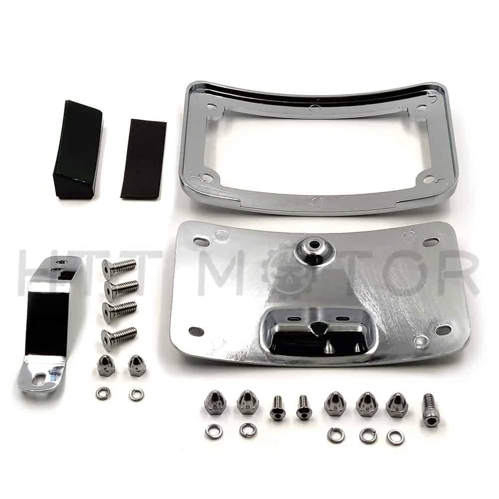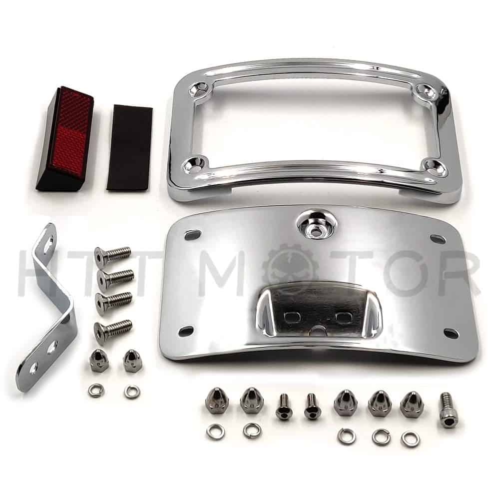 Soporte de placa de matrícula curvo cromado con kit de montaje postventa. Moderno, elegante y funcional. Aplicación personalizada completa, puede requerir modificaciones. Se ajusta perfectamente al contorno curvado del guardabarros trasero. Puede funcionar con la luz trasera/barra de luz para reubicar la posición de montaje de la luz trasera/intermitente. Viene con un reflector cuadrado rojo para advertencia de seguridad por la noche. Tamaño: aprox. 174mm x 104mm. Condición: 100% nuevo de postventa. Cantidad: 1 unidad. Color: igual que la imagen. Material: aluminio billet. Instrucciones: no incluidas. Preperforado para una instalación fácil. Muy fácil de instalar. Simplemente desatornille el perno del eje, deslice esto en su lugar y vuelva a instalar el perno del eje. Compatible con modelos Harley Davidson FLSTN ’05-posterior y FLSTSC ’05-’07.