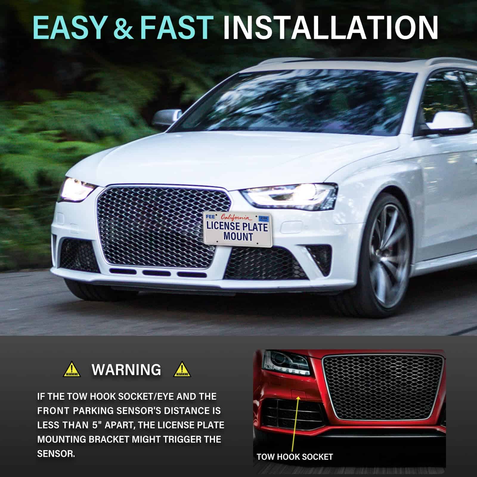 3. NO SE REQUIERE MODIFICACIÓN: El marco de la placa de matrícula cuenta con 4 ubicaciones de montaje para evitar que la placa bloquee las tomas de aire / luces / sensores, No se requiere taladrar o modificar, simplemente atornille en el área/agujero del gancho de remolque.