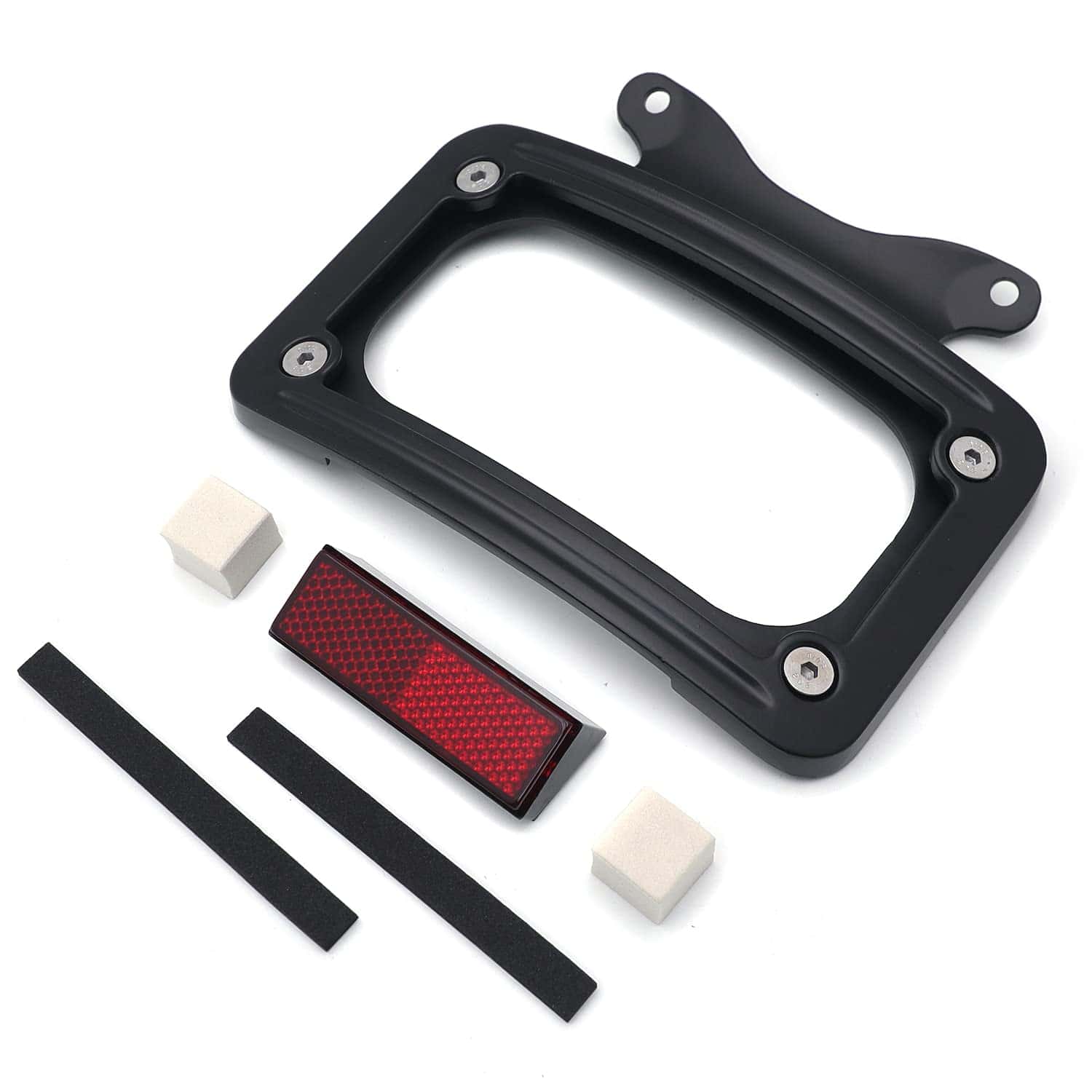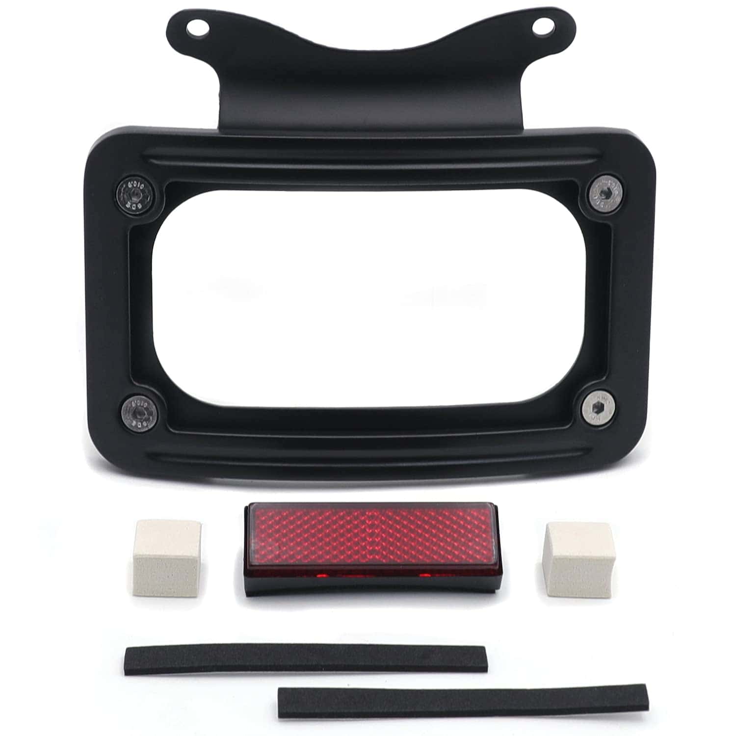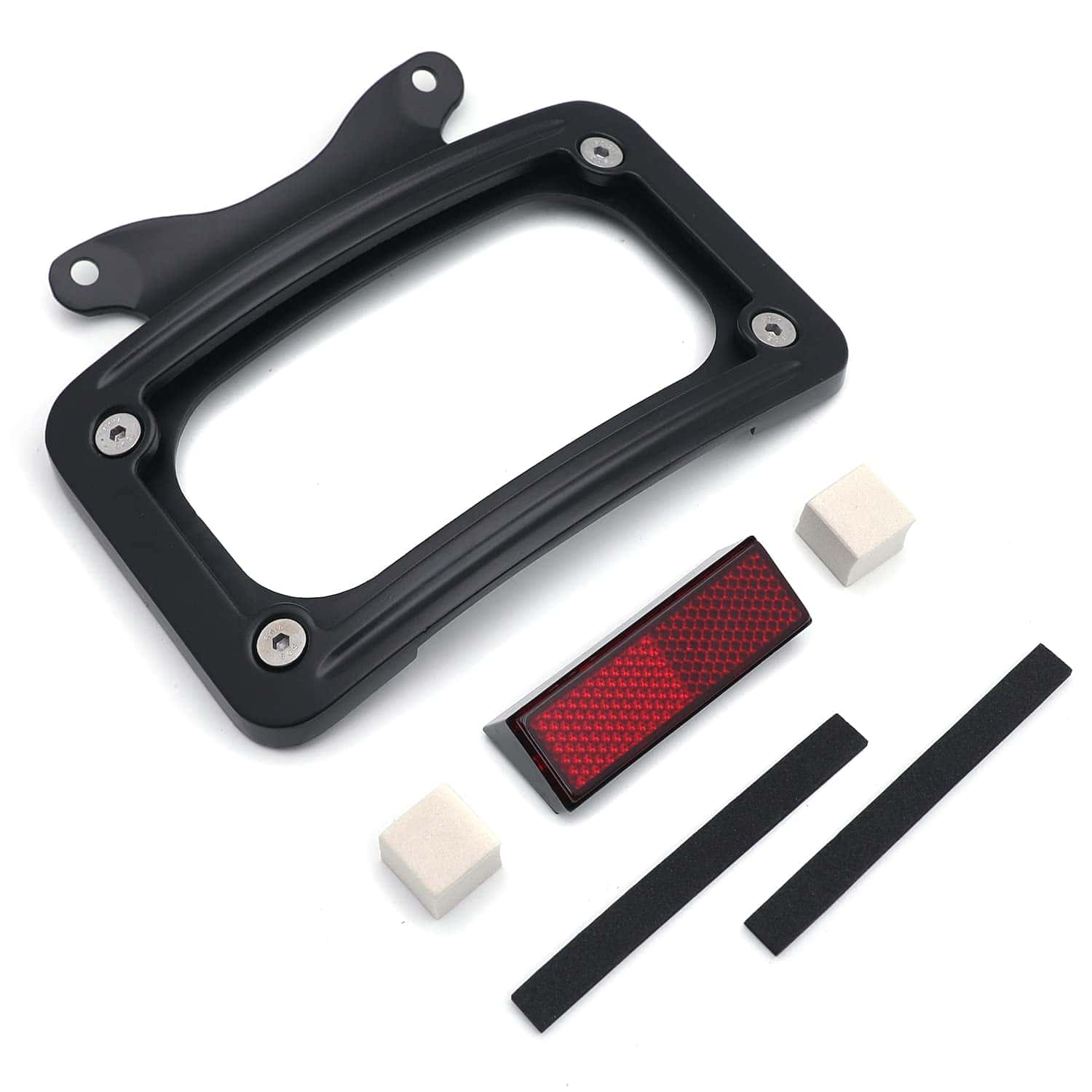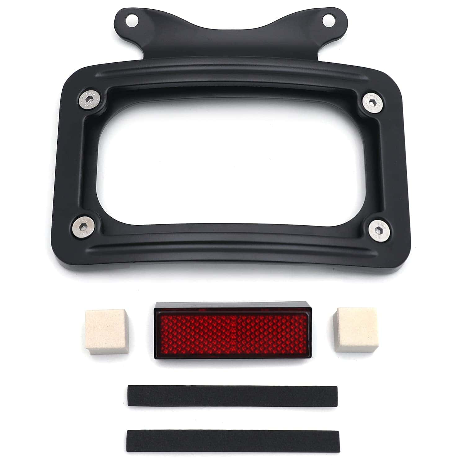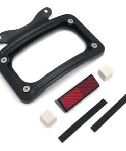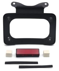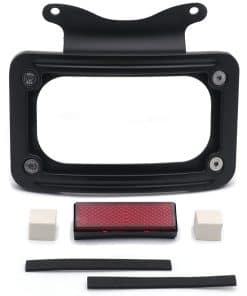 Soporte de placa de matrícula curvada inclinada de mercado de accesorios con kit de montaje. Aplicación personalizada completa, puede requerir modificaciones. Se adapta perfectamente al contorno cambered de la guardabarros trasero. Puede trabajar con la luz trasera/barra de luz para reubicar la posición de montaje de la luz trasera/indicadora. Viene con reflector cuadrado rojo para advertencia de seguridad por la noche. Material: Aluminio billet. No incluye instrucciones. Perforado previamente para una instalación sencilla. Muy fácil de instalar. Simplemente desatornille el perno del eje, deslice esto en su lugar y vuelva a instalar el perno del eje. Compatible con modelos ’10-later FLHX, FLHXS, FLHXSE, FLTRX, FLTRXS y ’10-’12 FLHXSE. Consulte la lista de ajuste para los modelos específicos correspondientes a los años del vehículo.