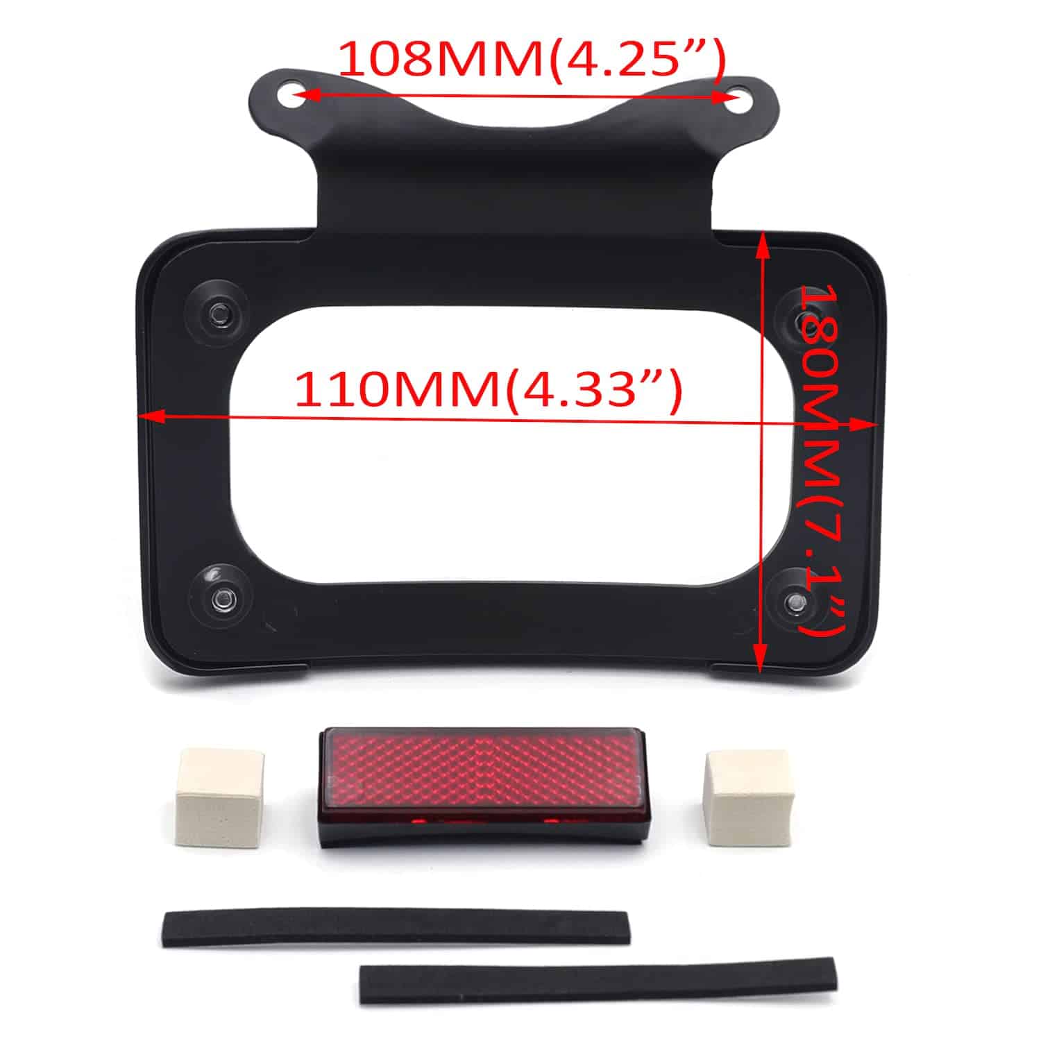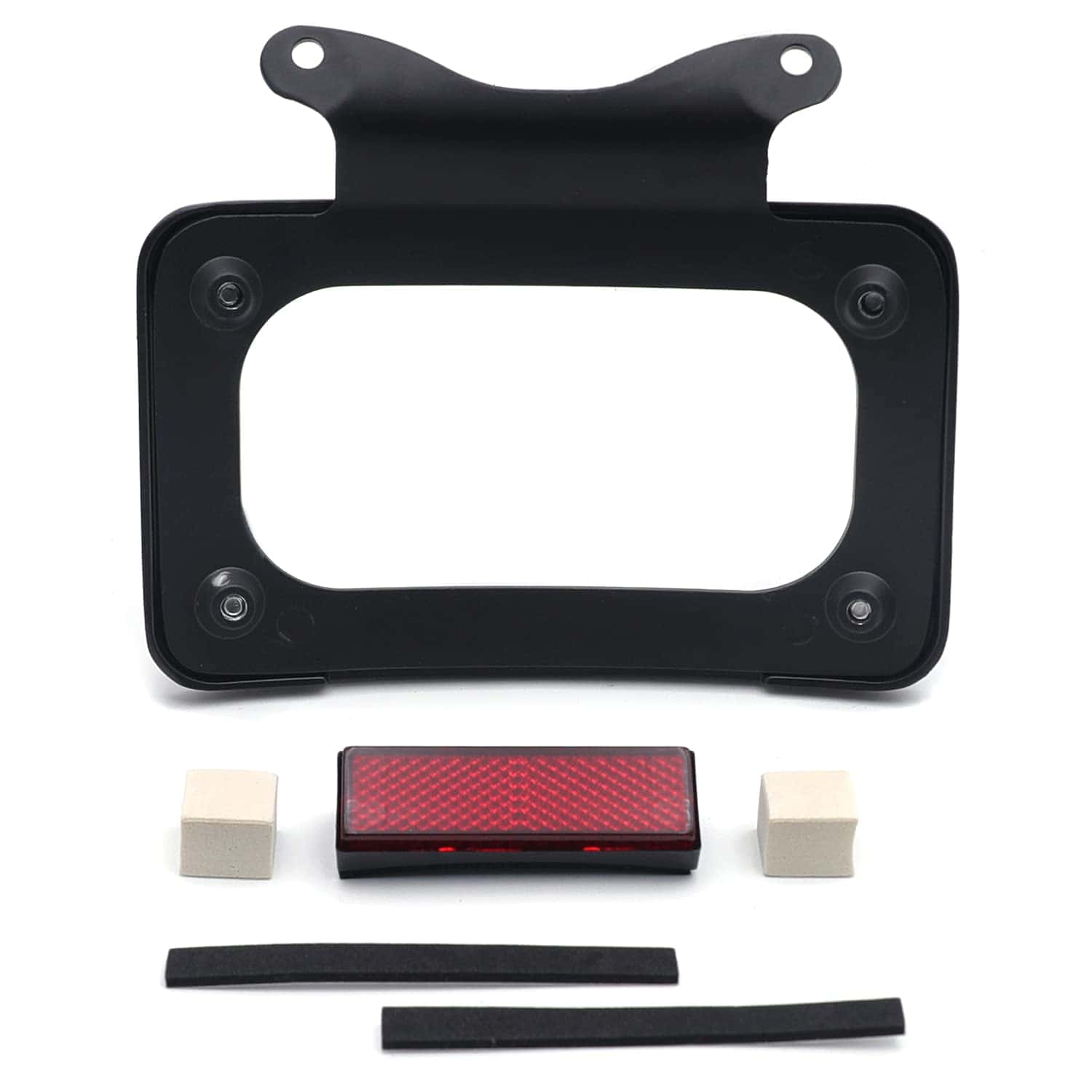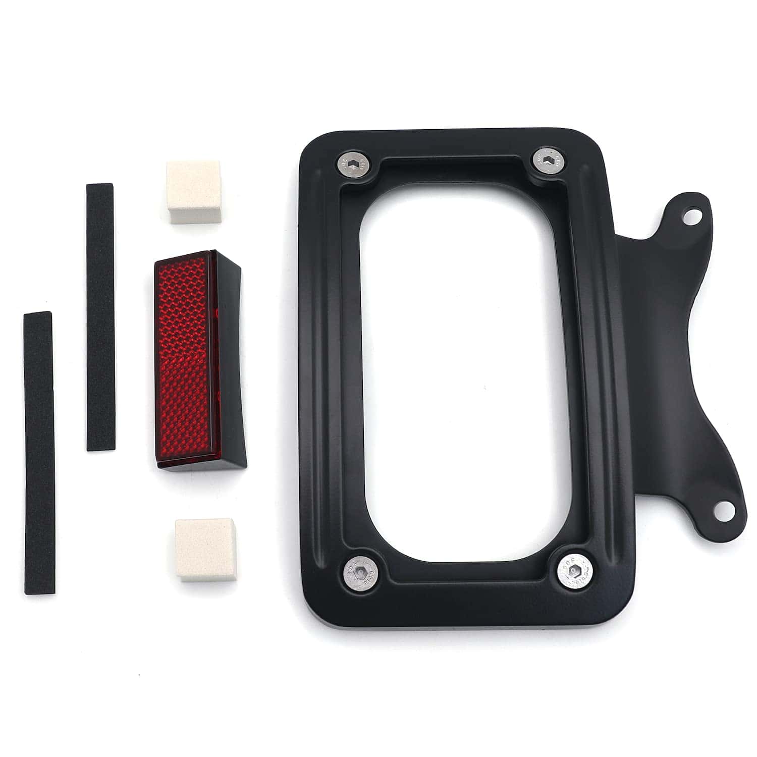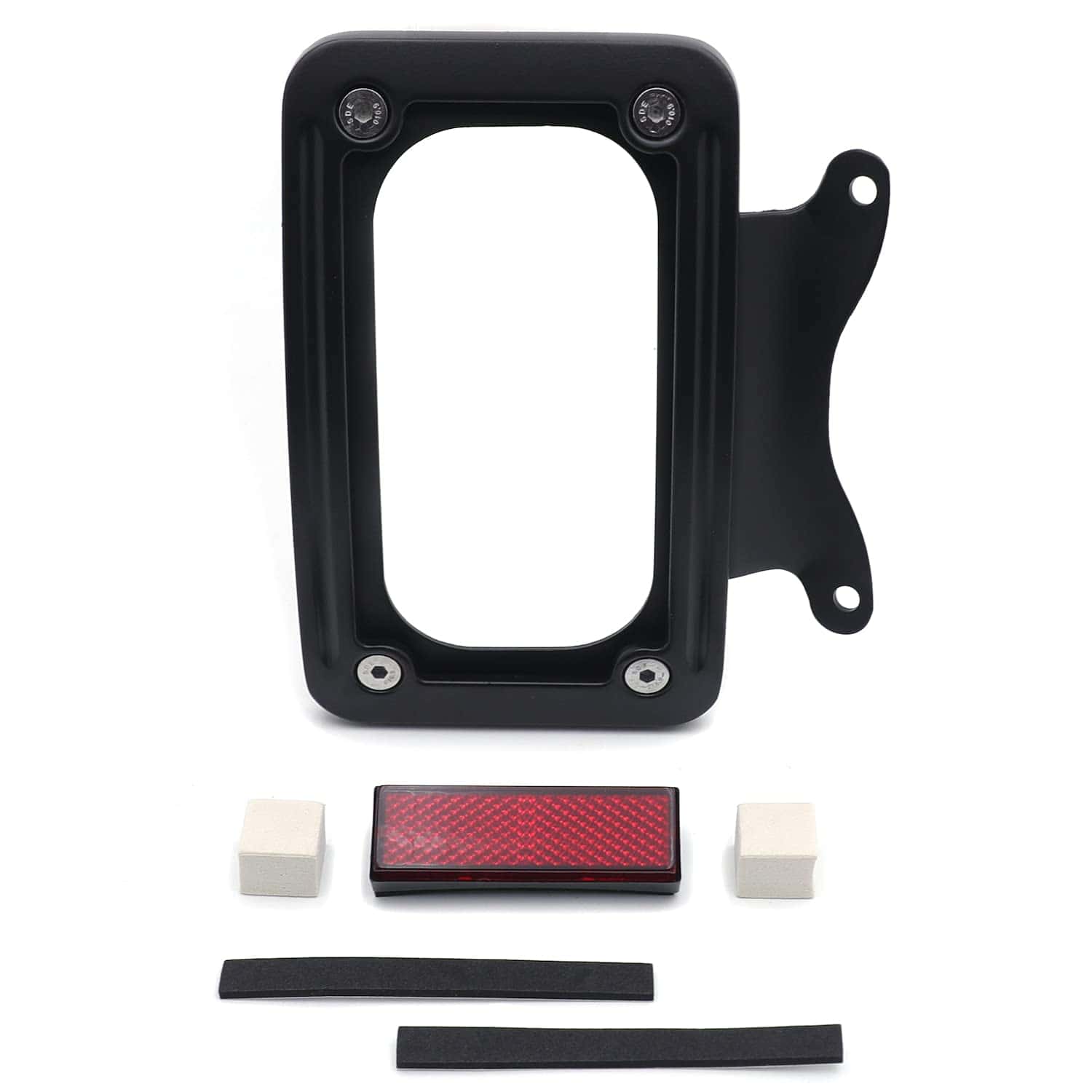 Soporte de placa de matrícula curvada inclinada de mercado de accesorios con kit de montaje. Aplicación personalizada completa, puede requerir modificaciones. Se adapta perfectamente al contorno cambered de la guardabarros trasero. Puede trabajar con la luz trasera/barra de luz para reubicar la posición de montaje de la luz trasera/indicadora. Viene con reflector cuadrado rojo para advertencia de seguridad por la noche. Material: Aluminio billet. No incluye instrucciones. Perforado previamente para una instalación sencilla. Muy fácil de instalar. Simplemente desatornille el perno del eje, deslice esto en su lugar y vuelva a instalar el perno del eje. Compatible con modelos ’10-later FLHX, FLHXS, FLHXSE, FLTRX, FLTRXS y ’10-’12 FLHXSE. Consulte la lista de ajuste para los modelos específicos correspondientes a los años del vehículo.