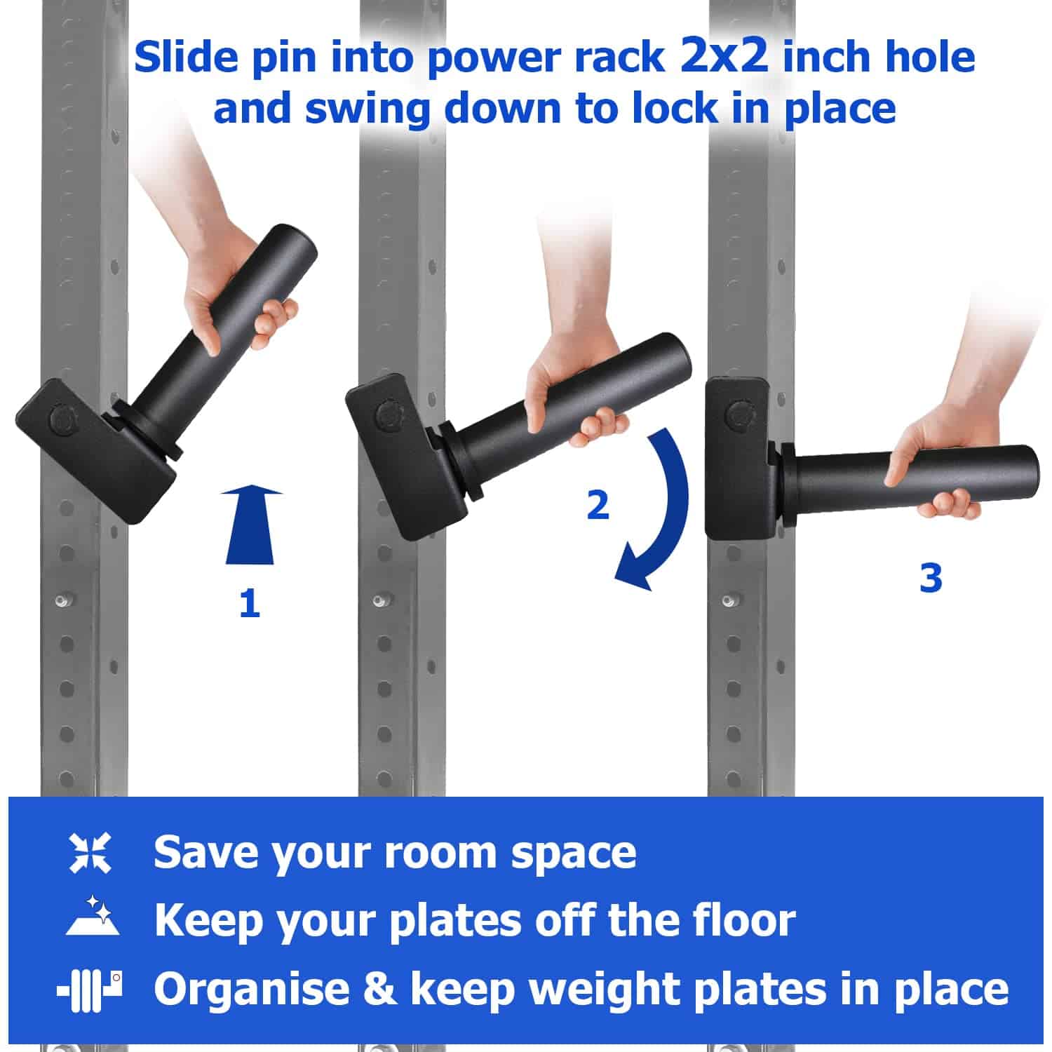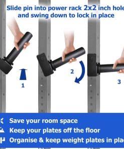 4. FÁCIL DE INSTALAR Y USAR: El Soporte de Placas de Peso A2ZCare se puede insertar fácilmente con un diseño de bloqueo. Simplemente deslice el pasador en el agujero de la jaula de fuerza y bájelo para bloquearlo en su lugar. El diseño es especialmente ideal para cargar y descargar las placas de peso. Se adapta a la mayoría de los racks de tubos cuadrados de 2 x 2 pulgadas y 1 orificio, pero no a todos.