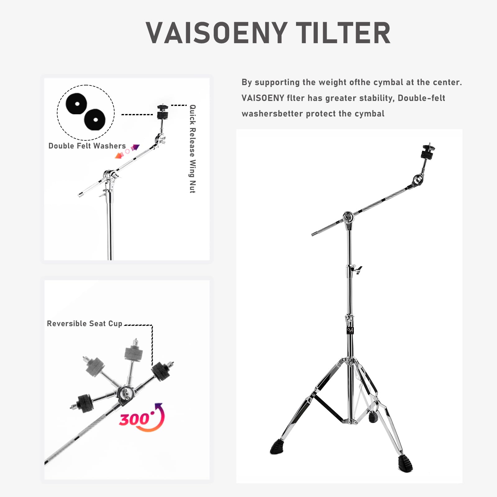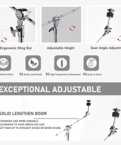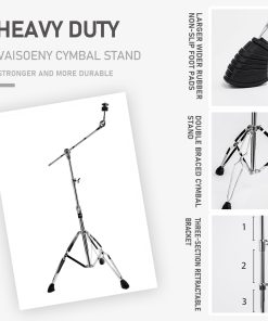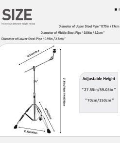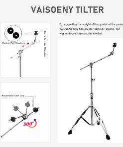 1. FÁCIL DE AJUSTAR: Los soportes de platillos Vaisoeny con trípode de doble refuerzo se pueden ajustar (29.5″ – 59″ pulgadas / 75-150 cm). El inclinador ajustable de 360 grados le permite establecer el ángulo de juego deseado del platillo. Ajustes completados fácilmente en pocos segundos. Perfecto para platillos de 14″, 16″, 18″ y 20″.