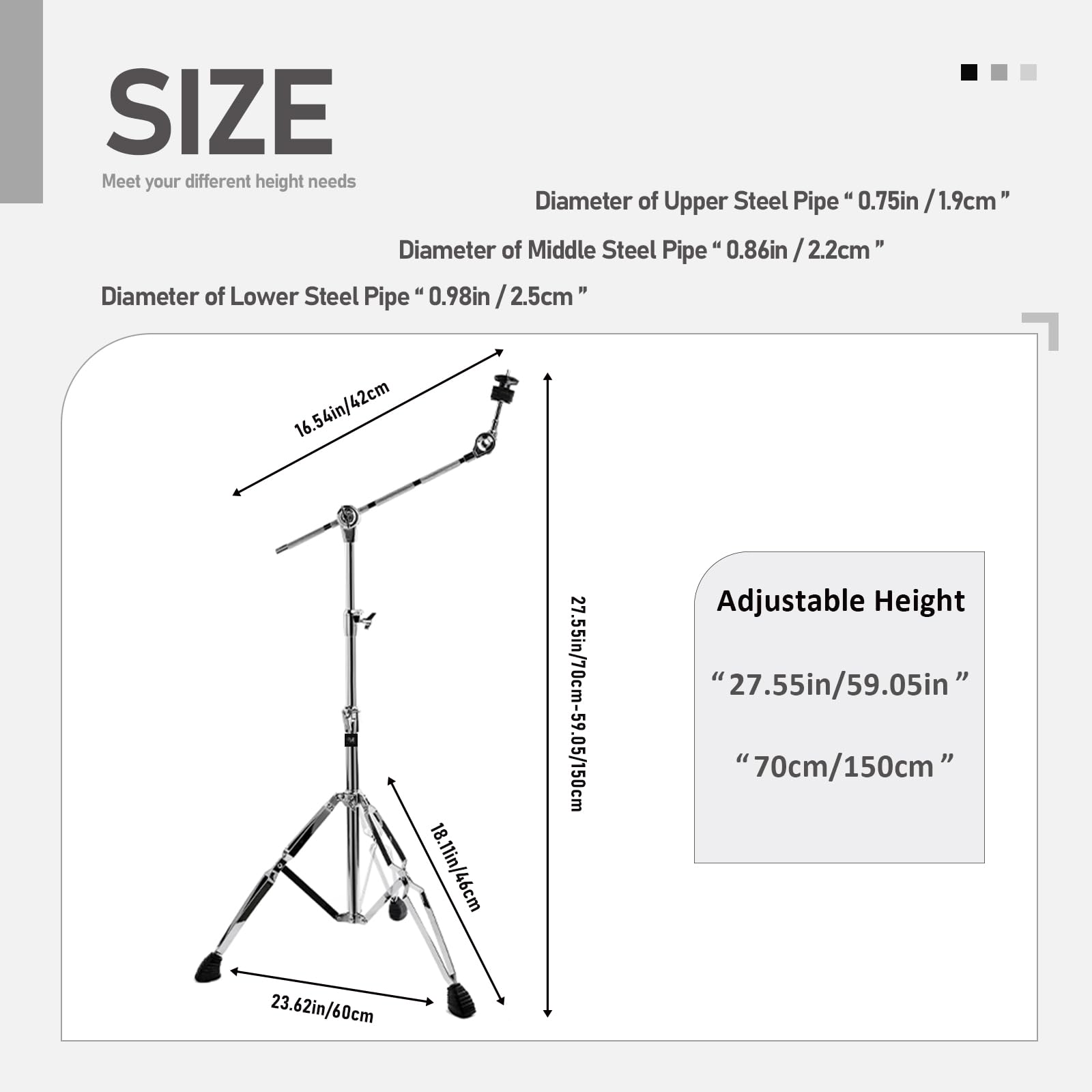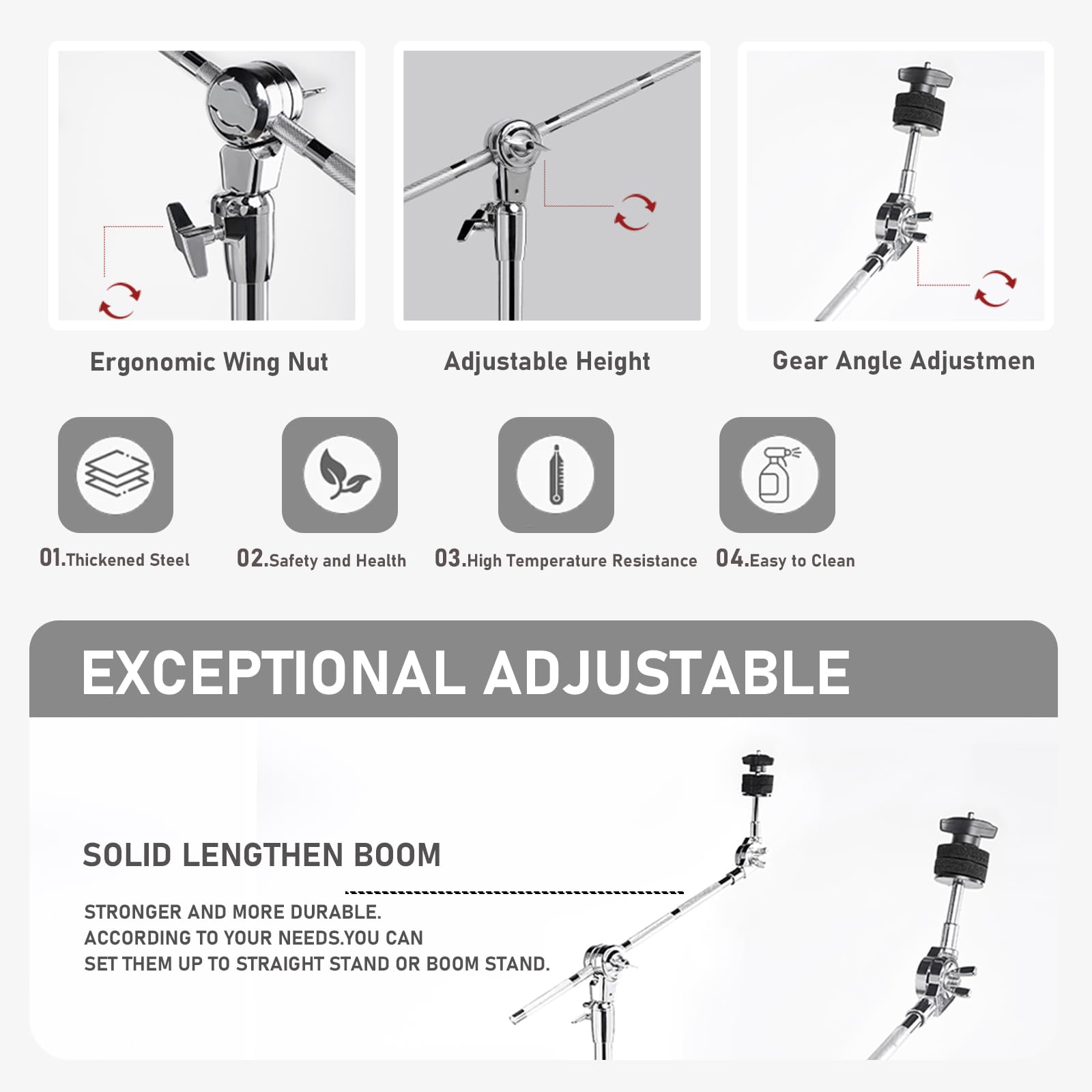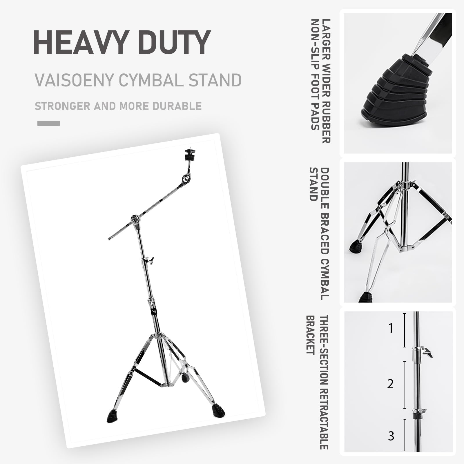 4. PUNTAS DE BRAZO DE GOMA ENSANCHADAS: El diseño de patas de goma engrosadas y ensanchadas hace que el soporte de boom de platillos sea más estable.