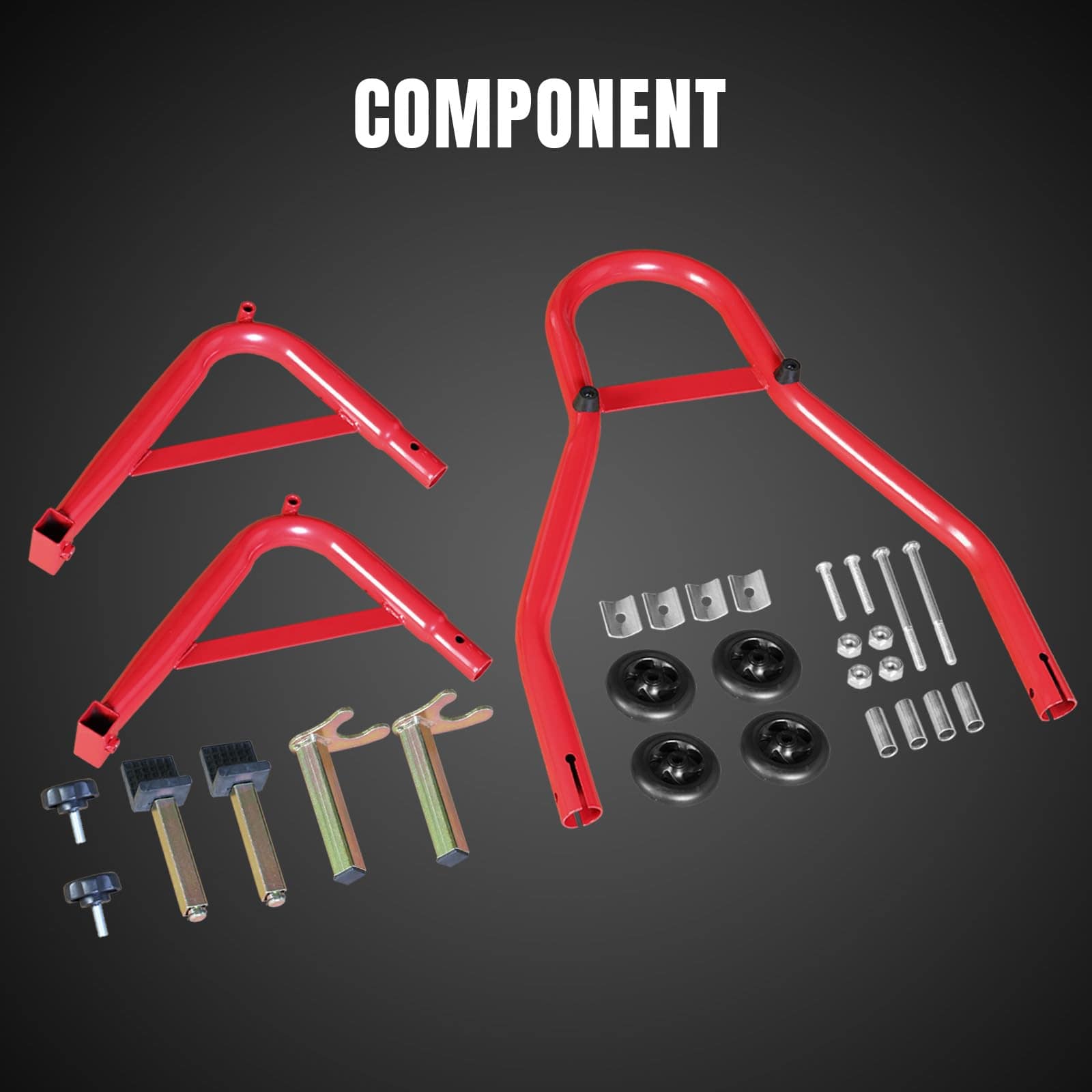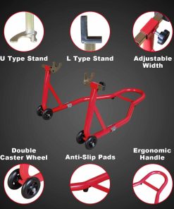Soporte de Rueda Delantera y Trasera Jack Boss para Motocicleta, Combo de Soportes Elevadores de Rueda, Capacidad de 500 lb, Soportes Paddock de Espalda de Brazo Oscilante para Deportivas, Compatible con Yamaha Honda Kawasaki. Este soporte de motocicleta está construido con acero industrial premium y acabado en polvo rojo que garantiza resistencia a la corrosión y durabilidad a largo plazo. Con una capacidad de 500 lb, ofrece suficiente palanca para levantar motocicletas del suelo de manera segura. Con un diseño ajustable en el ancho, este soporte es adecuado para una variedad de motos y motocicletas, incluyendo marcas como Yamaha, Honda, BMW, Kawasaki y Suzuki. Además, las ruedas de PP de alta calidad aseguran estabilidad y facilidad de uso. Este conjunto incluye un soporte delantero para rueda y un soporte trasero de brazo oscilante, ideal para realizar tareas de mantenimiento como limpieza de cadenas, cambio de neumáticos y aceite. Montar y desmontar el soporte es sencillo y conveniente, lo que facilita su almacenamiento. ¡Haz que tus reparaciones en casa o en el taller sean mucho más fáciles con el Soporte de Rueda Delantera y Trasera Jack Boss para Motocicleta!