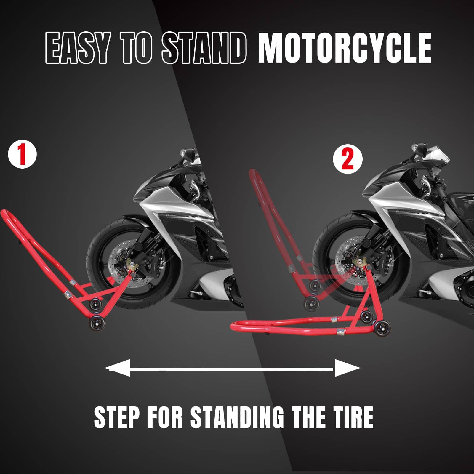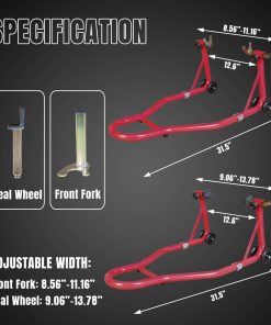 3. Diseño de Ancho Ajustable: El soporte elevador delantero para motocicletas deportivas se adapta a horquillas de rueda de 8.56″ a 11.61″ de ancho. El soporte elevador trasero se adapta a espárragos del brazo oscilante trasero de 9.06″ a 13.78″ de ancho y contiene almohadillas de goma. Adecuado para la mayoría de las motos y motocicletas debido al diseño ajustable, como Yamaha, Honda, BMW, Kawasaki, Suzuki, etc.