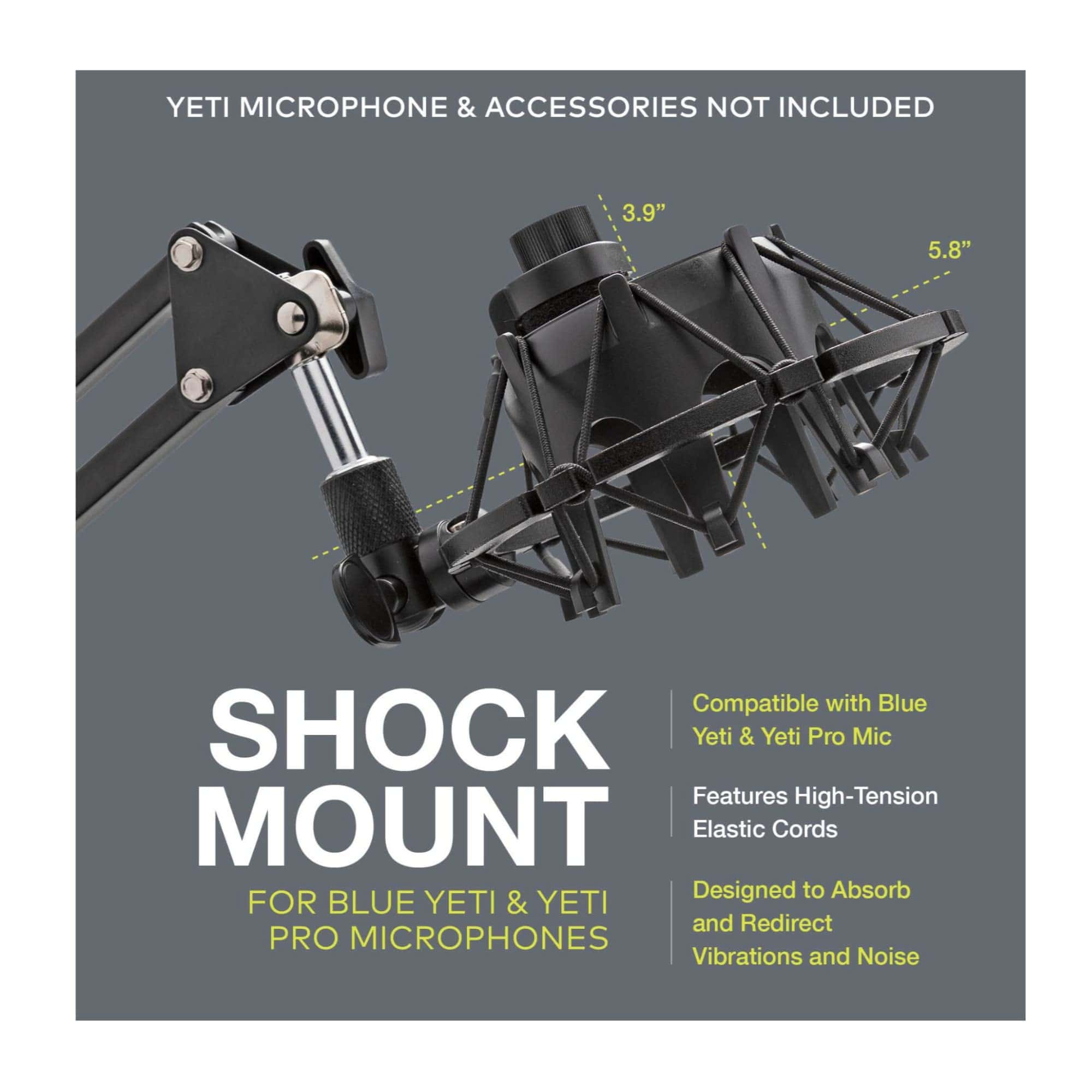 El Soporte de Suspensión Knox Gear está hecho de metal y presenta cuerdas elásticas de alta tensión que aíslan el micrófono Yeti. Este soporte está diseñado para absorber y redirigir vibraciones lejos del Yeti para reducir las interferencias de audio que pueden arruinar las grabaciones. También hay un tope trasero acolchado para sostener el Yeti en la posición perfecta mientras está en el soporte.