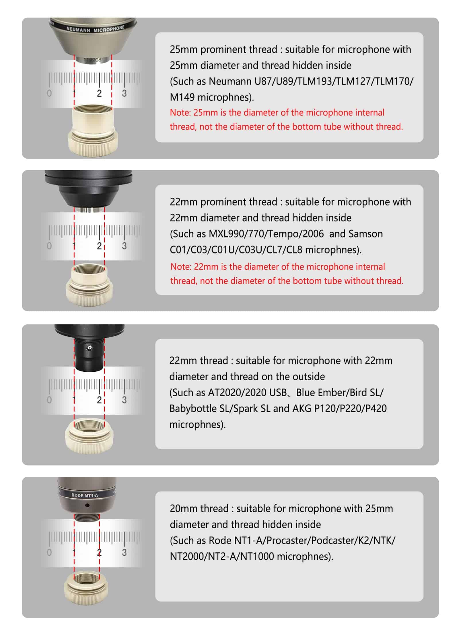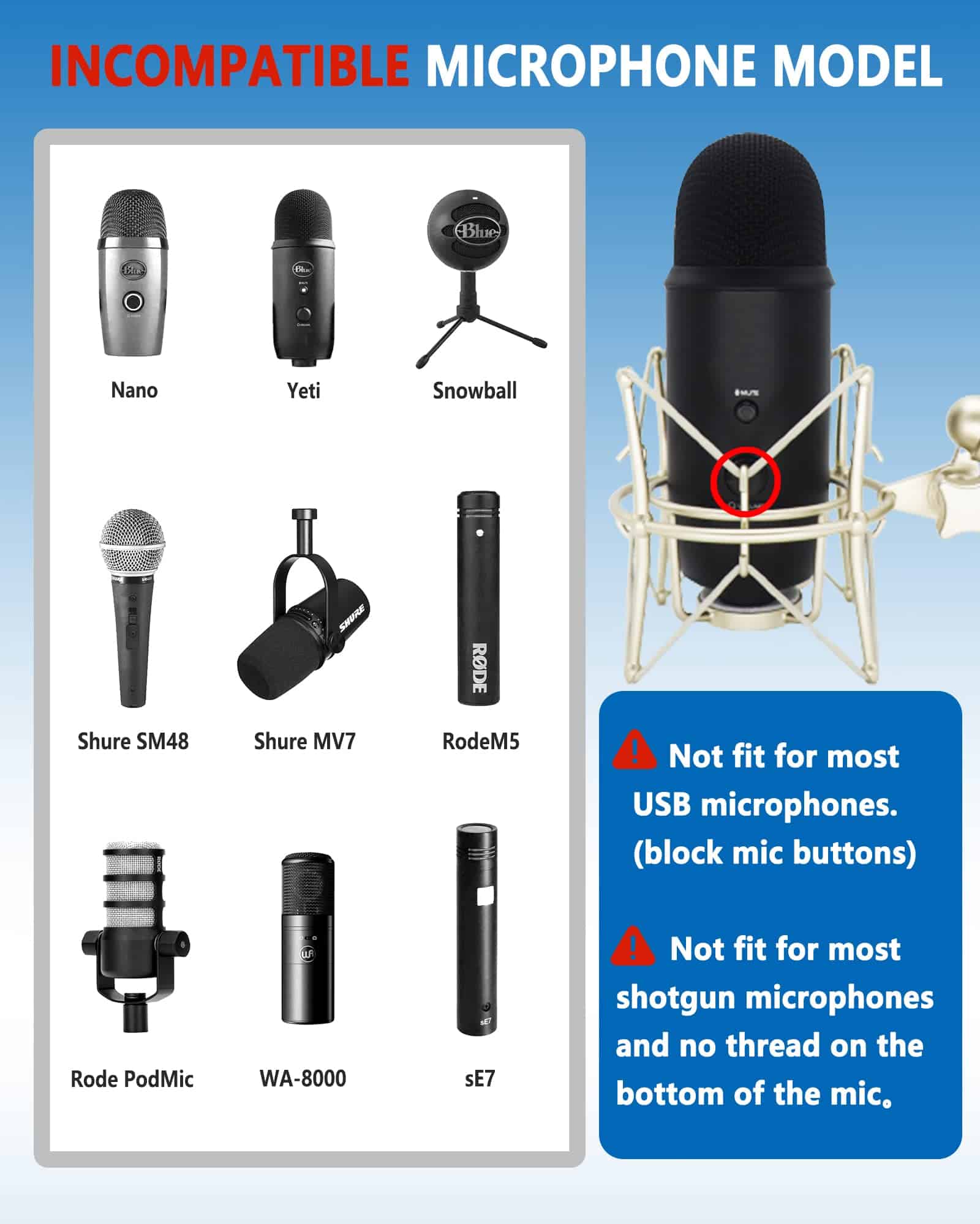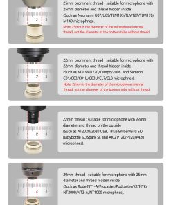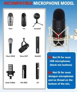 5. Nota NO COMPATIBLE con micrófonos de sonido en vivo de mano (como SM58 Q2U) y micrófonos sin rosca en la parte inferior (como AT2035 2050). Si tienes alguna pregunta, puedes contactarnos en cualquier momento, te atenderemos las 24 horas del día.