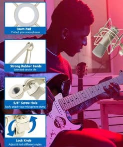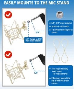 1. Anti-Vibración Este soporte de micrófono está diseñado para montar micrófonos de condensador de grabación con el fin de aislar o reducir de forma efectiva la vibración física, el ruido del suelo y el soporte. Es ideal para grabaciones, podcasting. Hará que el efecto de grabación sea más apropiado y tendrás una mejor experiencia.