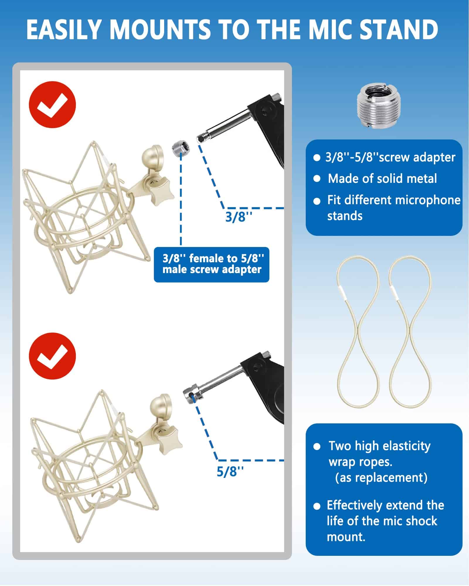 4. Resistente y Duradero Completamente construido en metal sólido con superficie pintada para una capacidad de carga sólida y resistente al desgaste. El cordón elástico en bucle está conectado al gancho de metal en la parte inferior del micrófono, lo que puede reducir efectivamente el vibrato causado por la vibración.