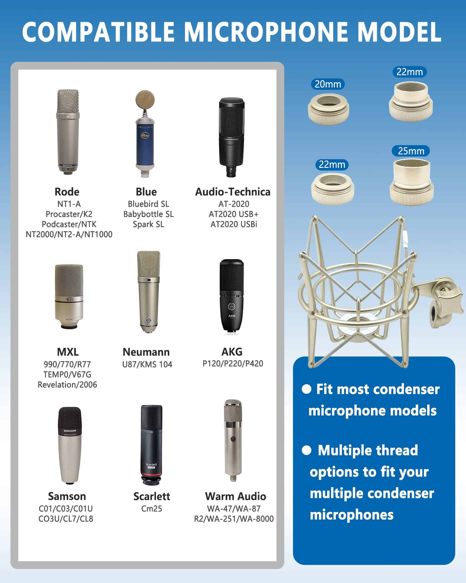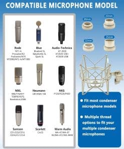 2. Gran Compatibilidad Nuestro soporte de micrófono de choque está equipado con 4 tornillos inferiores diferentes, que podrían ser compatibles con muchos micrófonos de condensador, como AT (2020, 2020USB); Rode (NT1-A, K2, NTK, NT2000, NT2-A, NT1000); Samson (C01, C03, C01U, C03U, CL7, CL8), Blue (Bird SL, Babybottle SL, Spark SL), MXL (990, 770, R77, TEMPO, V67G, Revelation, 2006); AKG (P120, P220, P420); y Neumann U87.