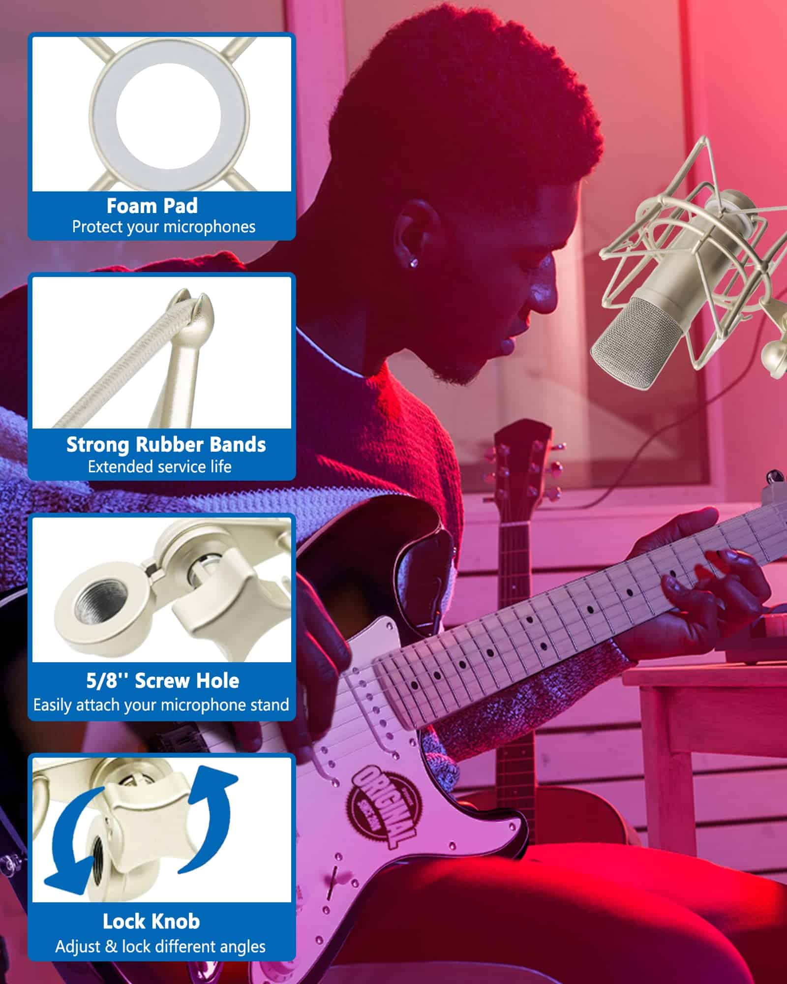 3. Ajustabilidad Cuenta con un mango de bloqueo ajustable en ángulo, el soporte a prueba de golpes se puede ajustar hasta 180 , lo que es conveniente para diversas direcciones de captación del micrófono. Y proporcionamos un adaptador de 5/8��-3/8��, que se puede conectar fácilmente a cualquier brazo o soporte de micrófono.
