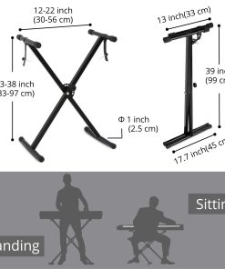Puede utilizarse para sostener pianos electrónicos de tamaño completo. El soporte para teclado ofrece 7 alturas de juego diferentes para su elección con un mecanismo de bloqueo circular y perilla de cambio rápido. Además, su ligereza, portabilidad y plegado le brindarán mucha conveniencia para un fácil almacenamiento y transporte. Las mangas de brazo de goma ajustables se pueden posicionar para adaptarse virtualmente a cualquier ancho de teclado. Realmente será ideal para uso en el hogar, iglesias, exhibiciones y presentaciones!