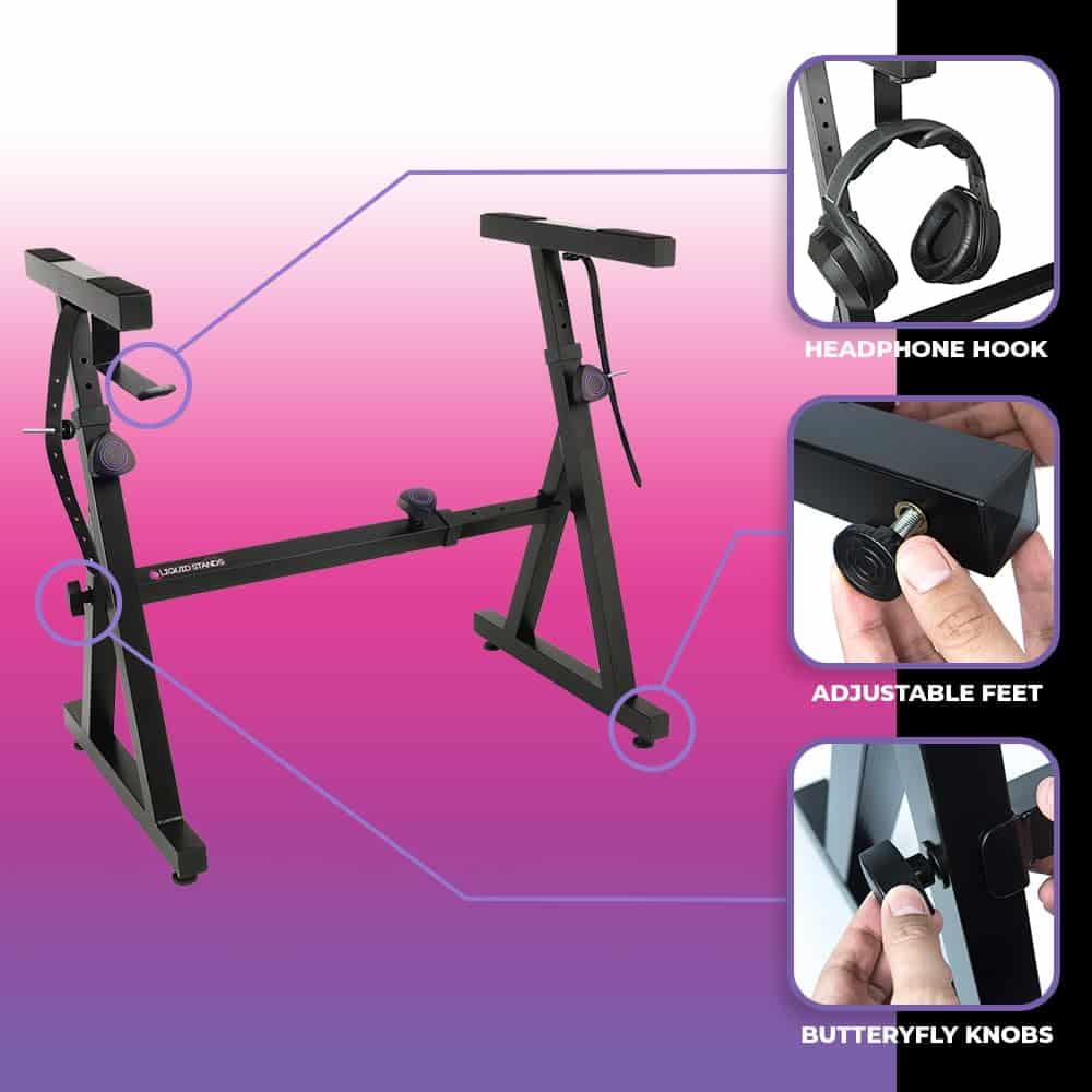1. Ajustable para adaptarse a la mayoría de los teclados: Nuestro soporte de teclado de piano universal es completamente ajustable, lo que le permite alinear adecuadamente su piano, mezcladores DJ, giradiscos, sintetizadores y teclados midi. El soporte de teclado de Liquid Stands es compatible con todas las principales marcas de teclados.