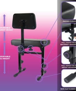 5. Fácil de configurar, transportar y ajustar las dimensiones: La altura del soporte se ajusta entre 22.5 y 33.5 pulgadas (en incrementos de 1.5); el ancho se ajusta entre 19.5 y 33.5 pulgadas (en incrementos de 2). La altura del banco se ajusta entre 17.5 y 22 pulgadas (en incrementos de 1) mientras que la altura del respaldo se puede ajustar entre 27.2 – 36.2 pulgadas. Este banco viene con un respaldo que es adecuado para aquellos que sufren de dolor de espalda.