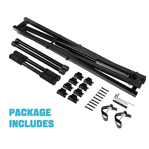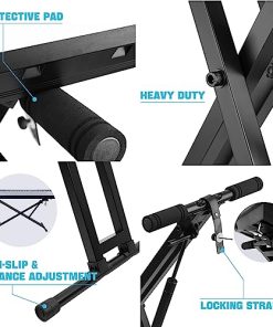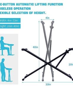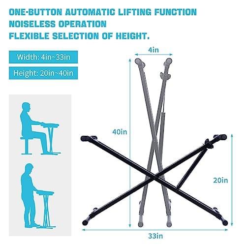 Soporte de teclado de piano GUITTO con función de elevación suave y fácil de un botón, controlado por resorte de gas, con ancho y alto ajustables (4-33in y 20-40in respectivamente). El proceso de elevación del marco de soporte es muy suave, casi silencioso y sin ruidos molestos. Cuatro almohadillas de goma giratorias aseguran la estabilidad de los teclados y vienen con una correa de bloqueo. La base estable y ajustable con cuatro almohadillas antideslizantes aseguran la estabilidad del soporte. Fabricado con materiales de alta calidad y duraderos con soportes de acero soldados.