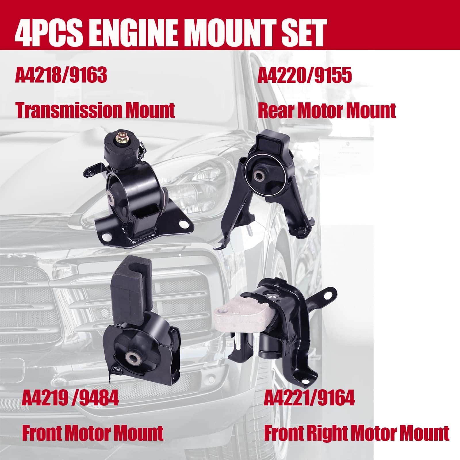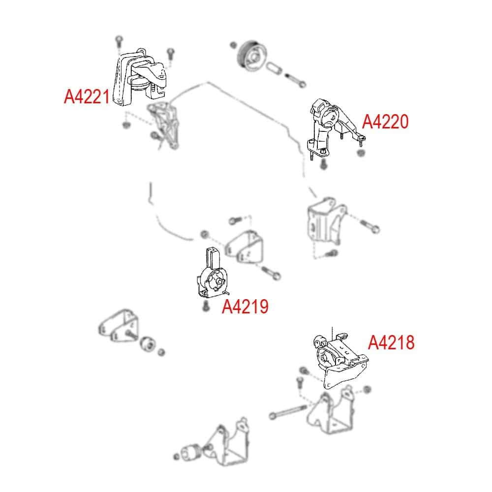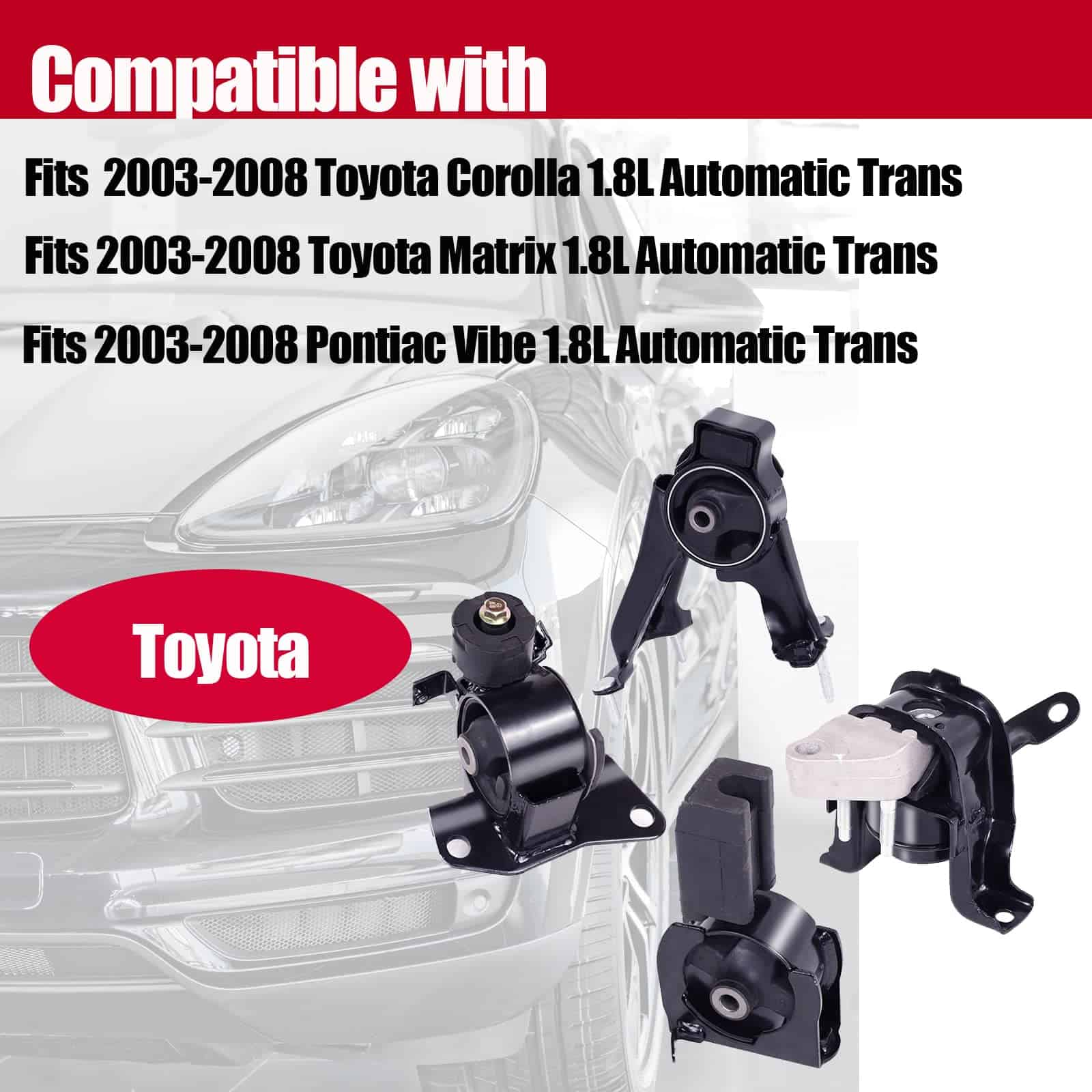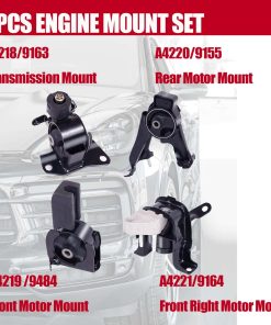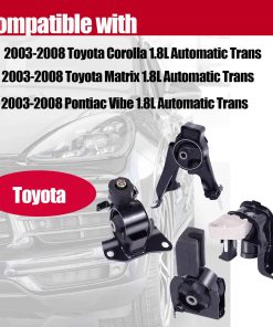 Fitment: Para Toyota Corolla 1.8L 2003-2008 con transmisión automática. Para Toyota Matrix 1.8L 2003-2008 con transmisión automática. Para Pontiac Vibe 1.8L 2003-2008 con transmisión automática. Colocación en el vehículo: A462063/9158/EM-9158: Soporte del motor delantero. A4221/9164/EM-9164: Soporte del motor delantero derecho. A4220/9155/EM-9155: Soporte del motor trasero. A4218/9163/EM-9163: Soporte de transmisión. Número de referencia de la parte: Delantero: 12361-0D040, 12361-0D100. Trasero: 12371-0D050, 12371-0D100. Derecho: 12305-22110, 12305-0D023. Transmisión: 12372-0D050, 12372-0D110.