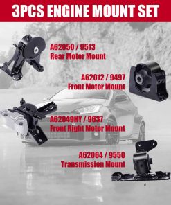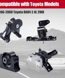 Incluye: 3 soportes de motor y 1 soporte de transmisión para Toyota RAV4 2.4L 2WD 2006-2008. Ajuste del vehículo: Toyota RAV4 2.4L 2WD 2006-2008. Para obtener información de ajuste más detallada, consulte la Tabla de Compatibilidad anterior o envíenos un mensaje con el número de VIN de su vehículo. Números de pieza del fabricante de repuesto: 1C9497 / A62012 / EM9497: Soporte de motor – Delantero 1C9637 / A62049HY / EM9637: Soporte de motor – Delantero Derecho 1C9513 / A62050 / EM9513: Soporte de motor – Trasero 1C9549 / A62064 / EM9549: Soporte de transmisión