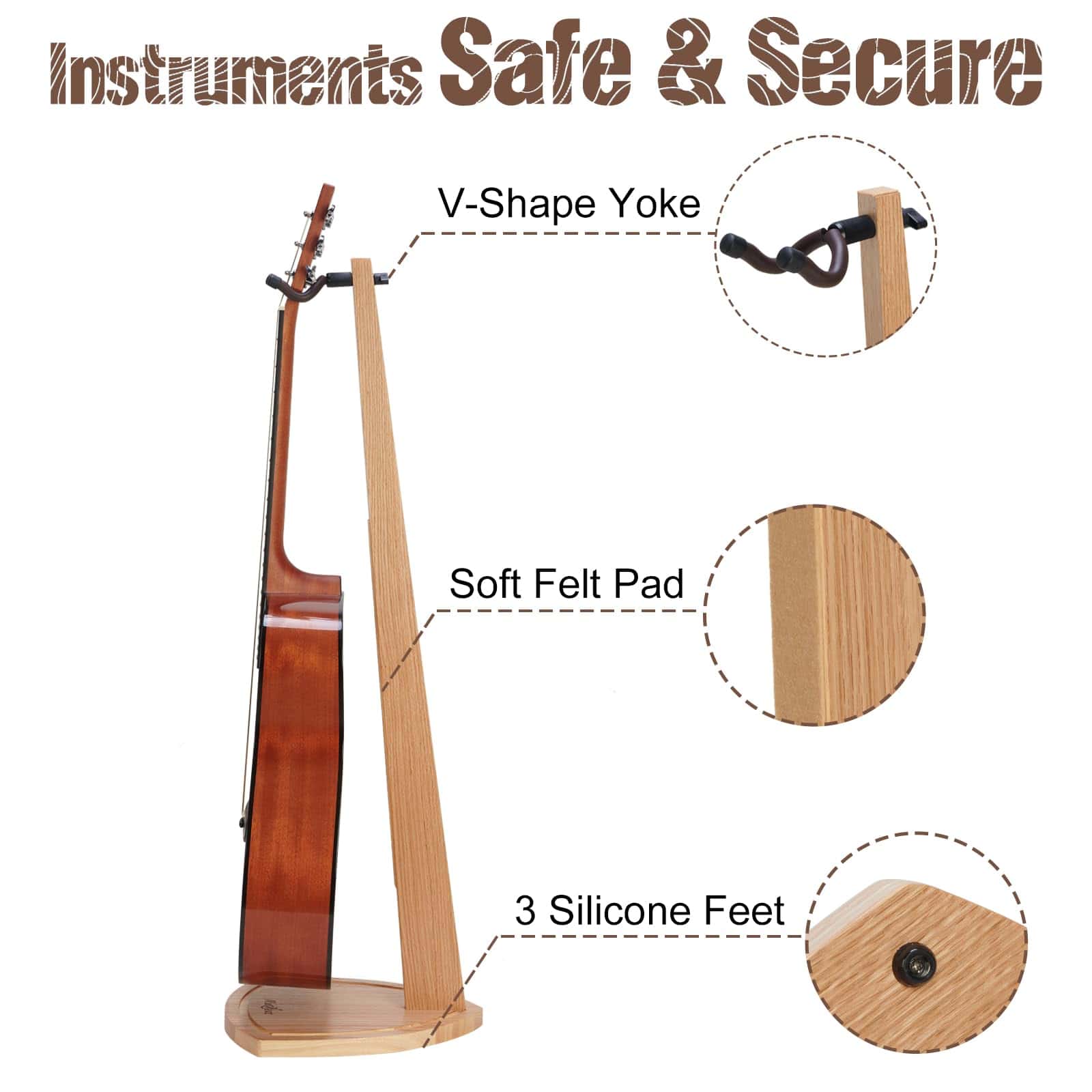 3. Instrumento Seguro y Protegido: Junto con el soporte en forma de espada, toda la superficie de contacto que pueda tocar el acabado del instrumento está cubierta con una almohadilla de fieltro que proporciona un buen amortiguador y protección. Teniendo en cuenta el suelo de moqueta suave, la parte trasera de la base está atornillada con 3 pies de silicona para evitar que el soporte se vuelque por el golpe de amigos peludos como perros y gatos e incluso las aspiradoras.