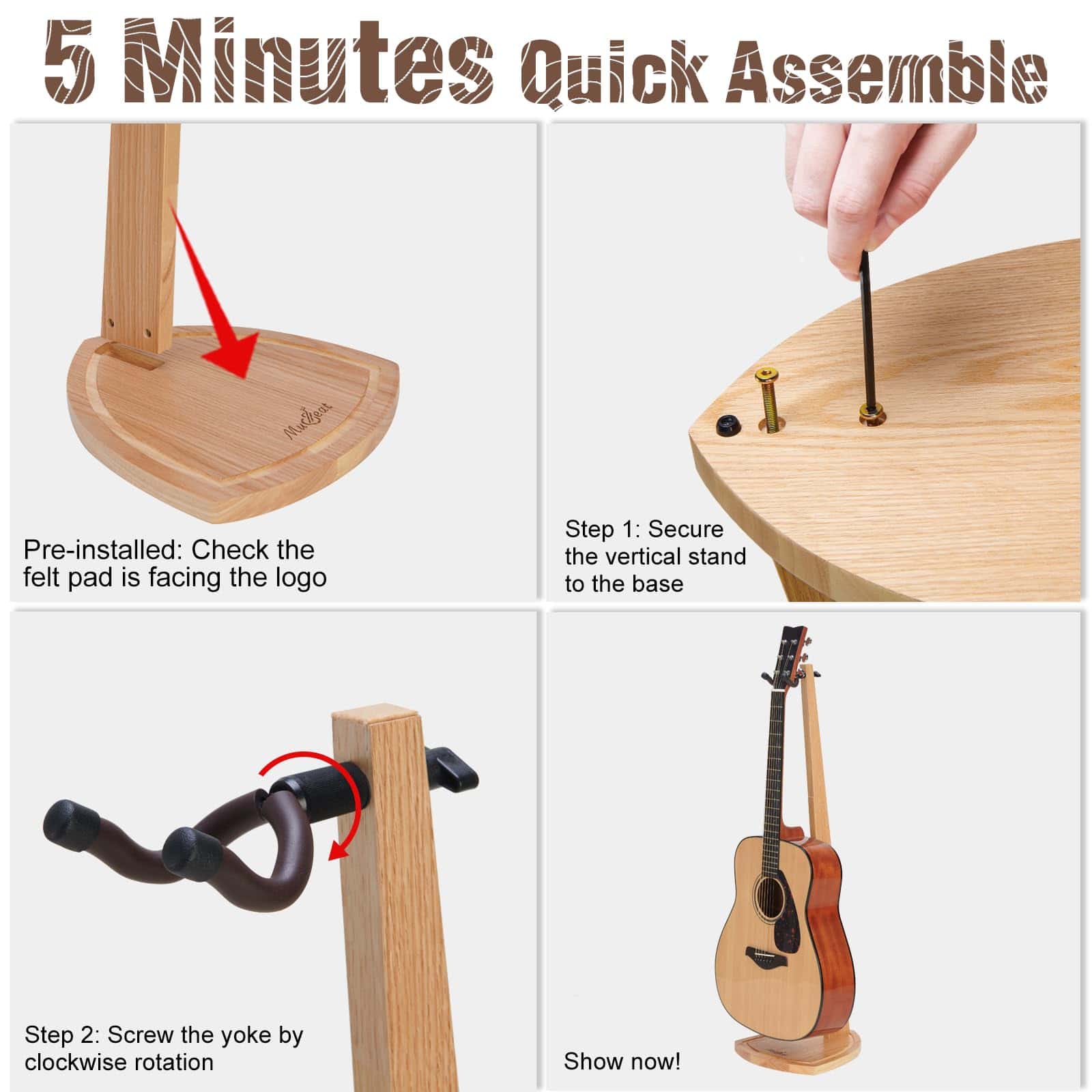 5. Ensamblaje Rápido en 5 Minutos: Siguiendo el folleto de instrucciones adjunto, este soporte de guitarra colgante se puede instalar rápidamente con solo 2 pasos en 5 minutos. Paso 1: fijar la base al soporte vertical con 2 tornillos de cabeza hexagonal incluidos (Llave hexagonal incluida). Paso 2: atornillar el yugo en sentido horario en la parte superior del soporte. El soporte para guitarra acústica sería un regalo ideal para guitarristas, hombres, mujeres, esposos, esposas, amigos a los que les gustan los instrumentos musicales en Navidad, Acción de Gracias.