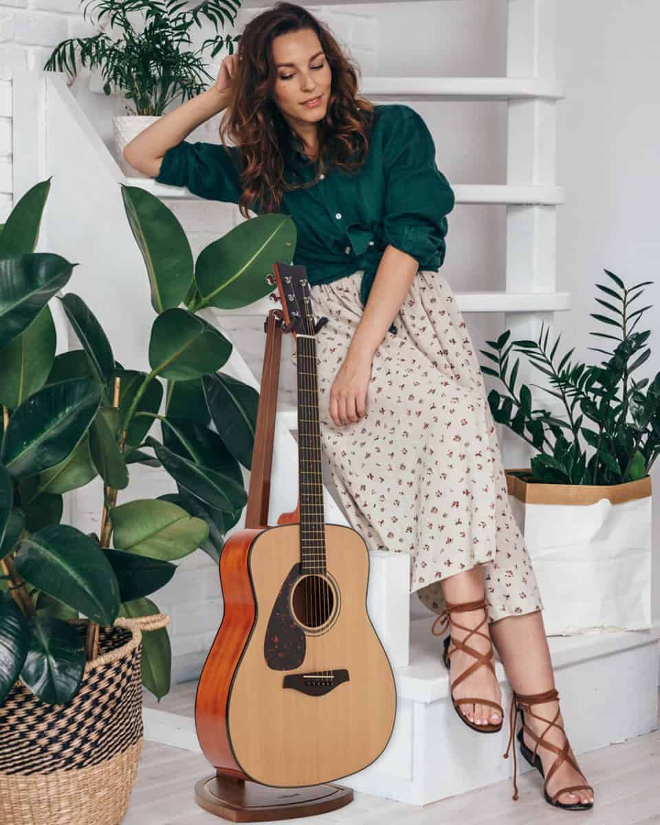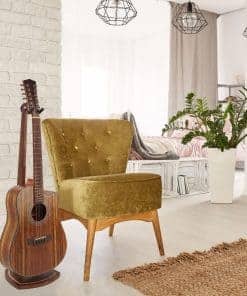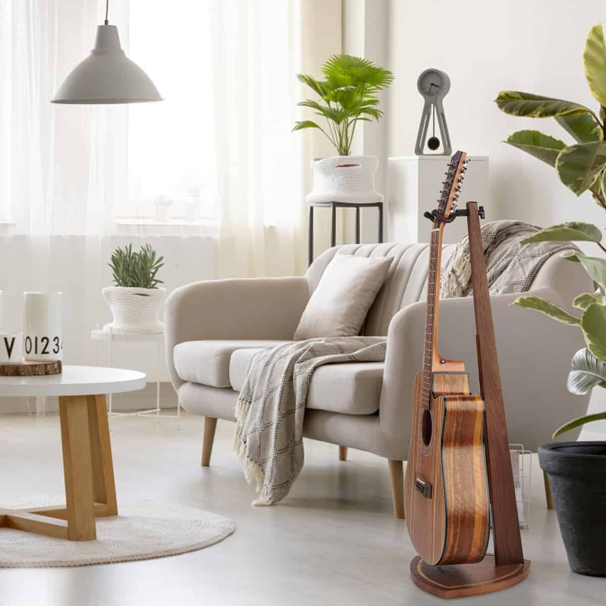 1. Elegante y Funcional Estéticamente: ¿Harto de soportes para instrumentos de metal negro invariable? Hecho con madera dura sólida, este soporte de guitarra de madera con rica veta natural se presenta de manera elegante y clásica que llamará la atención de cualquier visitante en tu hogar y dirá, «¡wow – eso es!». La línea bien elaborada y pulida de este soporte para guitarra lo hace ver como una pieza de mobiliario y convierte tu amada guitarra en una obra de arte decorativa también.