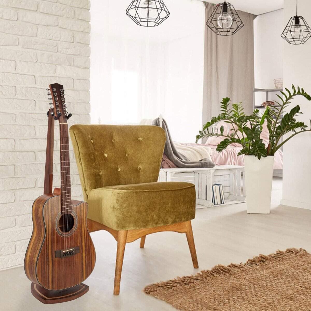4. Fácil de Alcanzar y Practicar: En comparación con un soporte de trípode para guitarra con patas que sobresalen o con soportes típicos inclinados, este soporte doble para guitarra ocupa menos espacio mientras muestra tu guitarra flotando en el aire, permitiendo un acceso rápido para tocar en cualquier momento, y de una manera elegante manteniendo tu guitarra en un espacio compacto para exhibirla, ya sea en la sala de estar, habitación, dormitorio principal, sala de música, estudio y comedor.