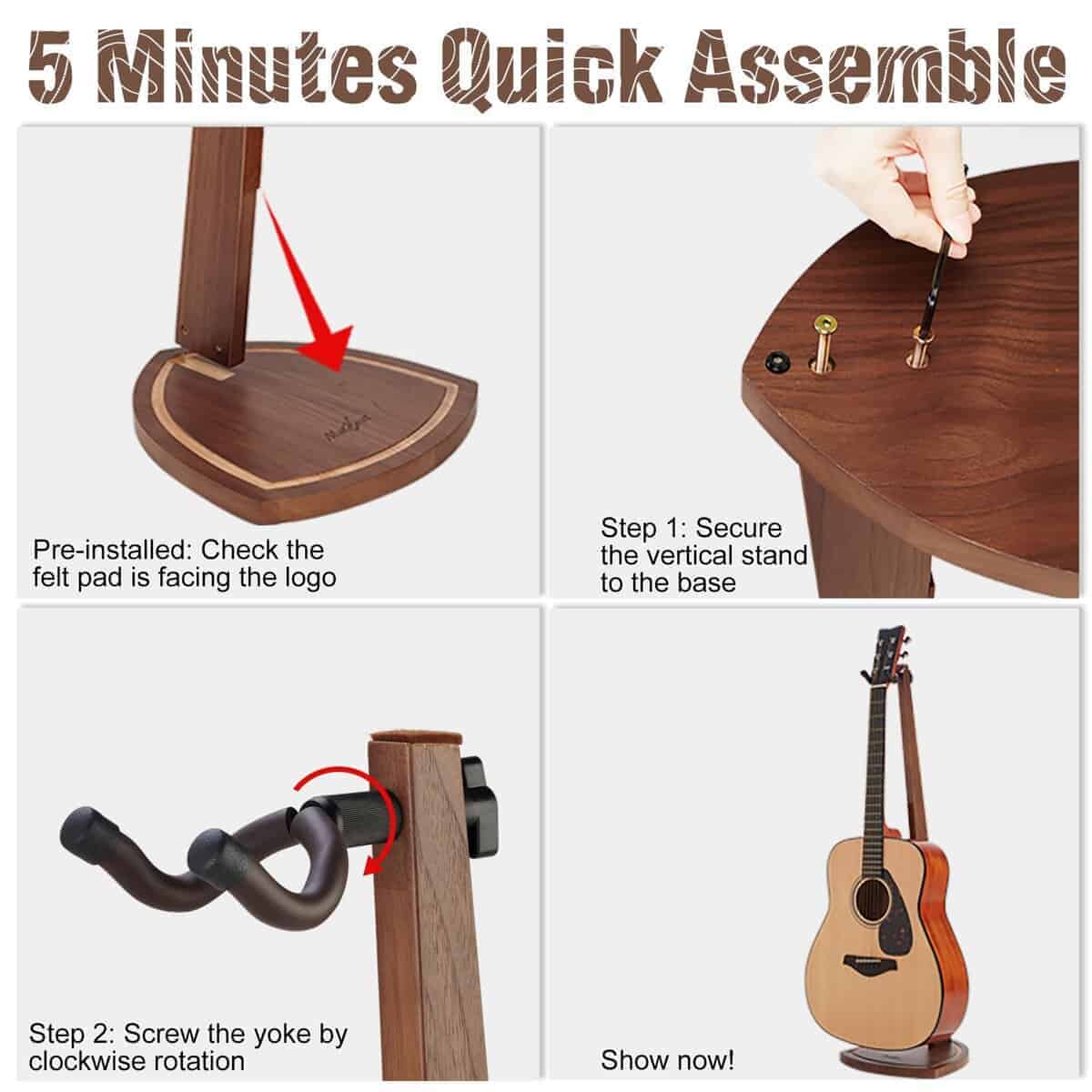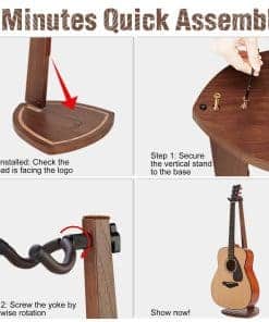 5. Ensamblaje Rápido en 5 Minutos: Siguiendo el folleto de instrucciones adjunto, este soporte para guitarra acústica se puede instalar rápidamente con solo 2 pasos en 5 minutos. Paso 1: Fije la base al soporte vertical con 2 tornillos de cabeza hexagonal en el interior (llave hexagonal incluida). Paso 2: Atornille el yugo en sentido horario en la parte superior del soporte. El soporte para 2 guitarras sería un regalo ideal para guitarristas, hombres, mujeres, esposos y esposas a quienes les gustan los instrumentos musicales en Navidad o Acción de Gracias.
