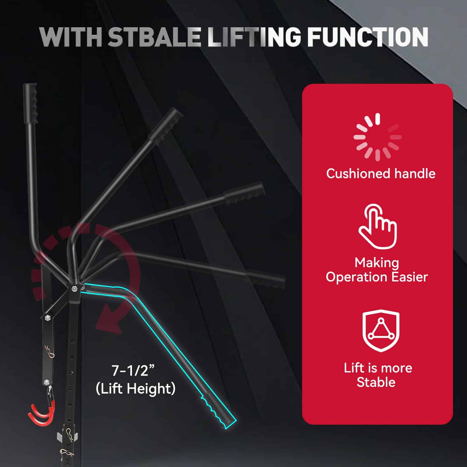 2. Diseño de soporte elevador para motonieve con dimensiones ajustables, los niveles de altura ajustable van desde 18 pulgadas hasta 33.9 pulgadas, el gancho es lo suficientemente ancho como para rodear el enganche de remolque, la altura ajustable facilita encontrar la configuración adecuada para elevarla lo suficiente como para colocar el carrito de manera fácil debajo de la pista.