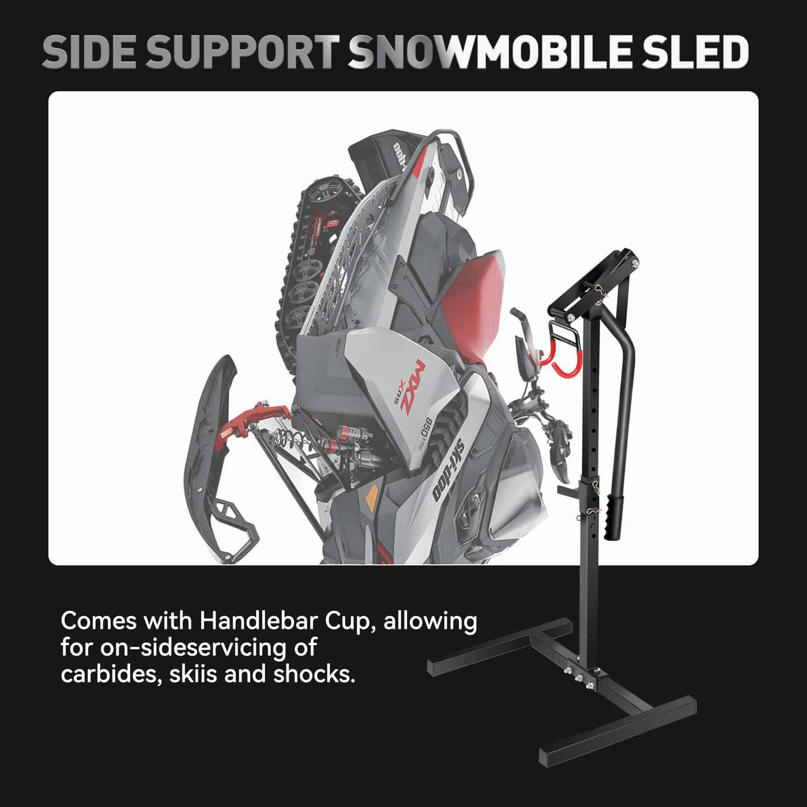 4. 1 juego de Soporte de Elevador de Palanca de Motonieve soporta hasta 600 lb en carga estática y 440 lb en carga dinámica; Viene con copas de manillar para motonieve, usando la Copla de Manillar de Motonieve, la trineo puede ser apoyado en un ángulo de aproximadamente 45 grados, permitiendo el servicio lateral de arbides, esquís y amortiguadores.