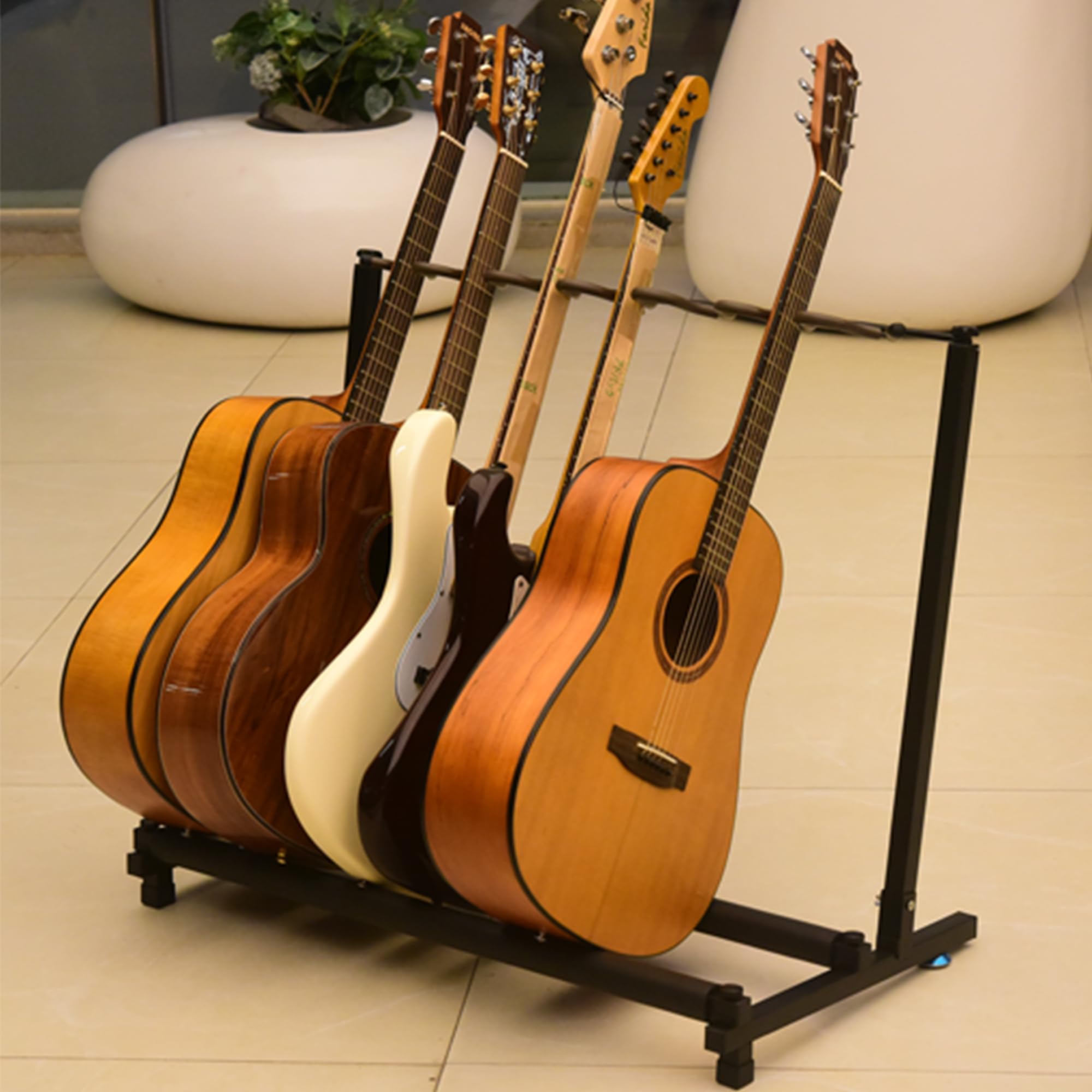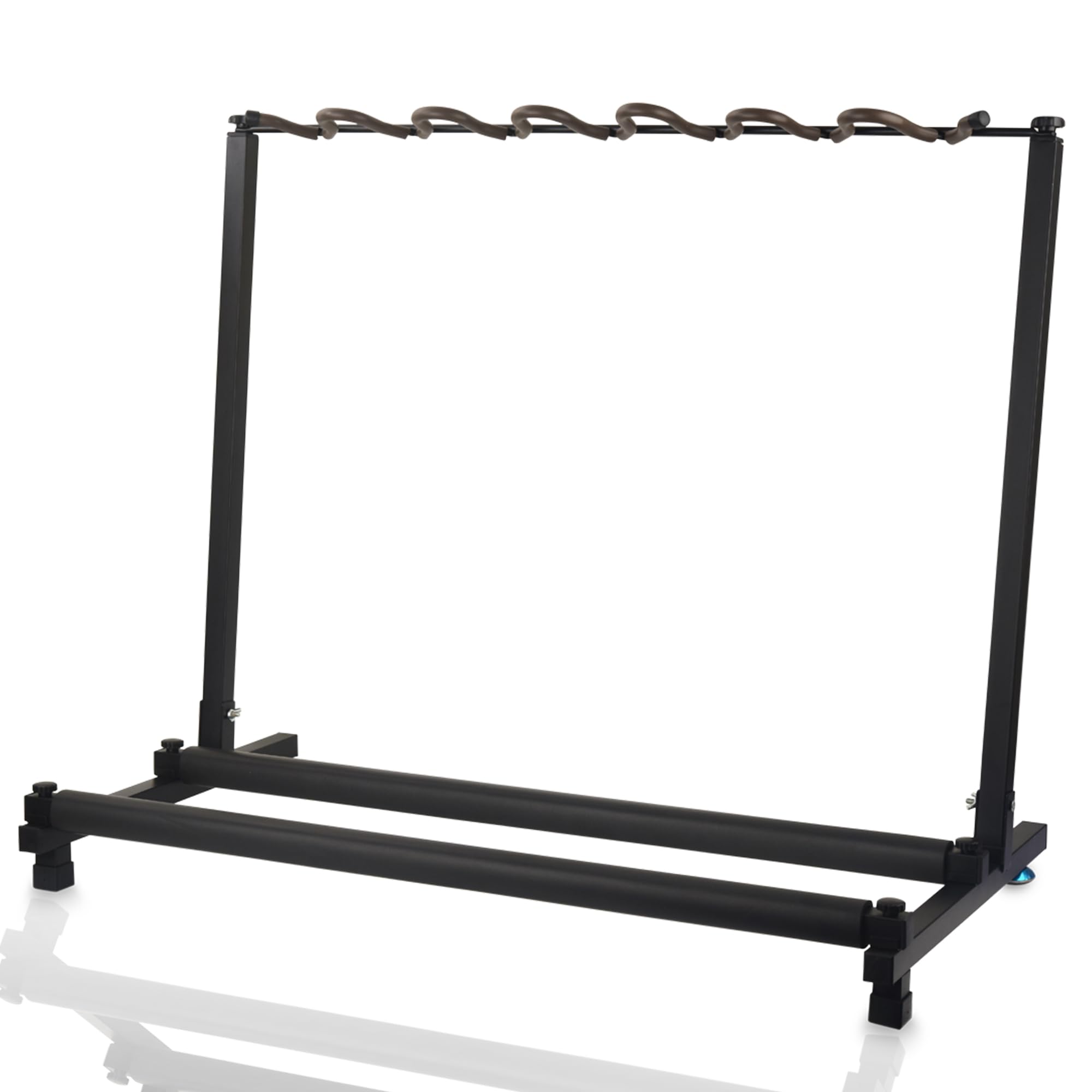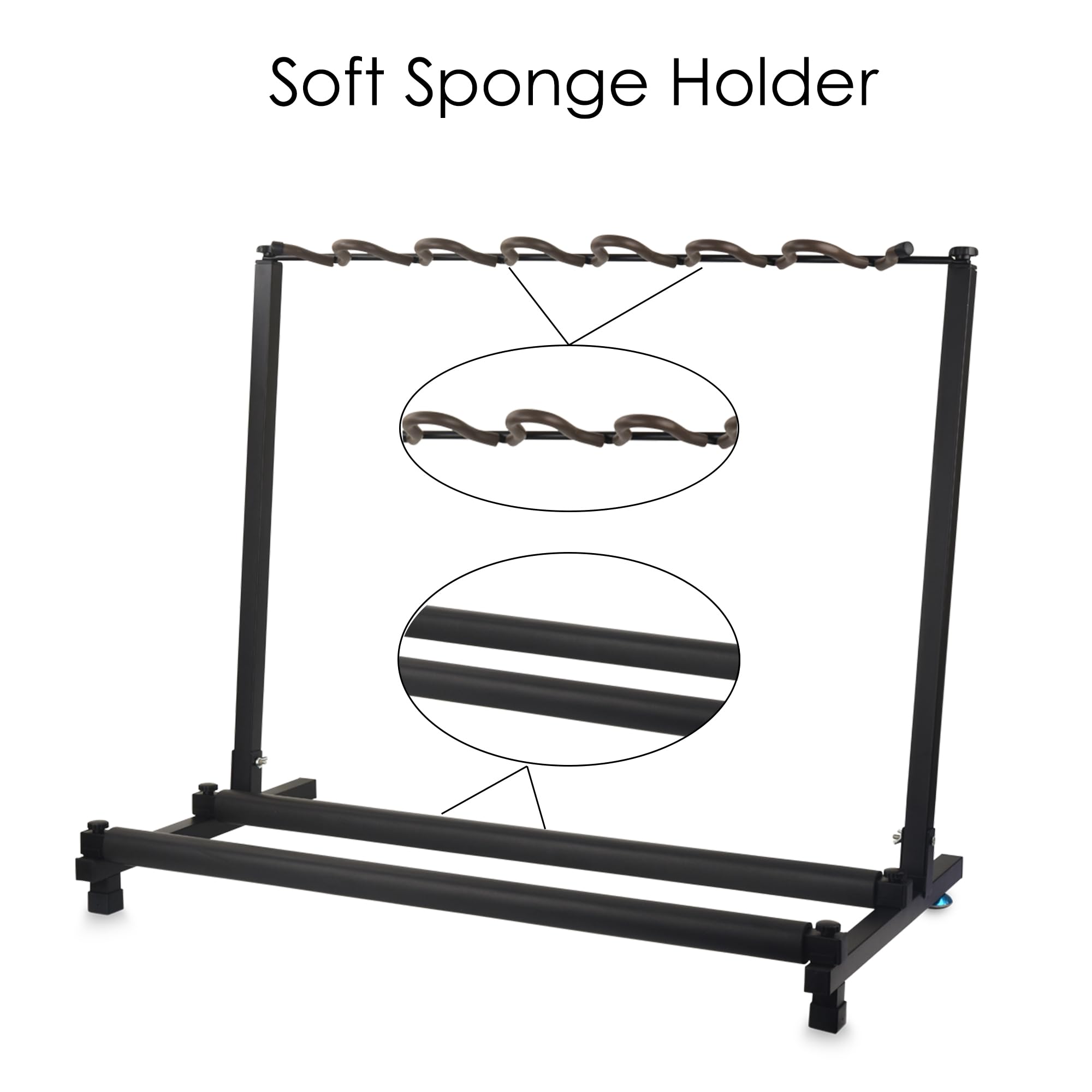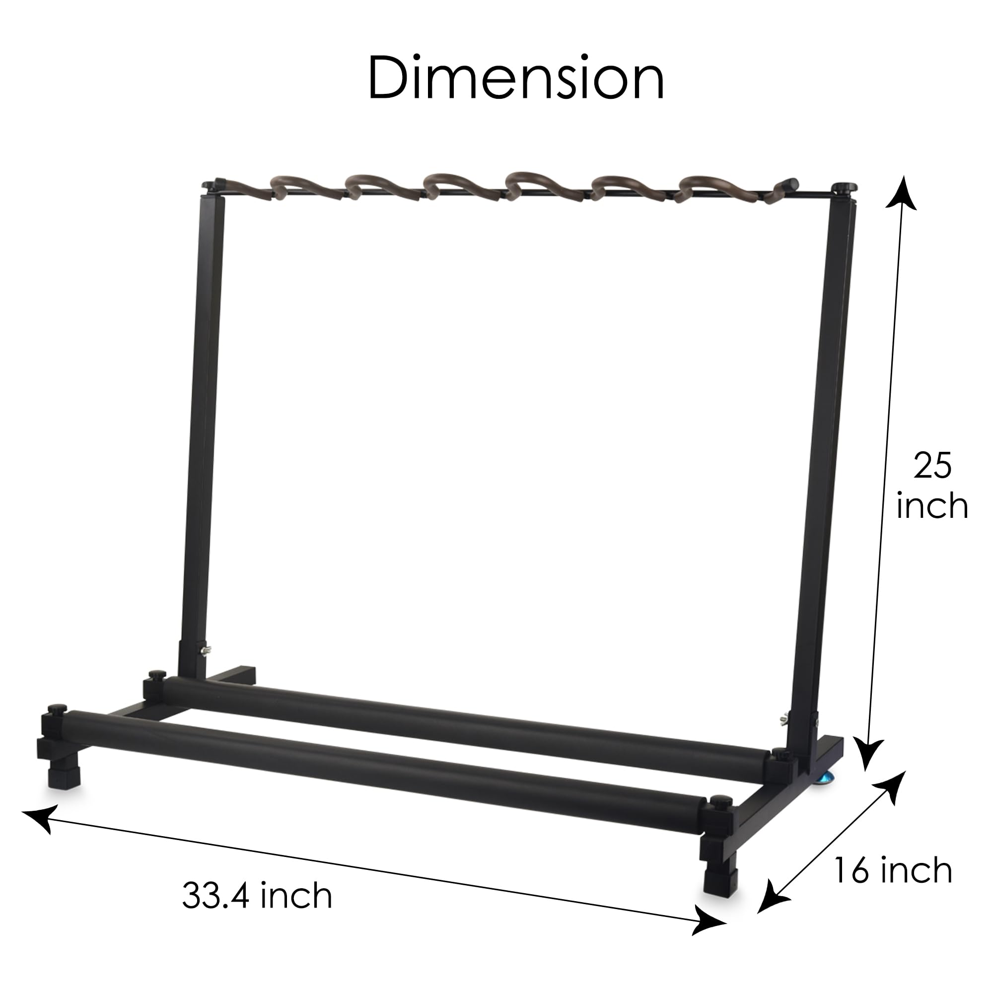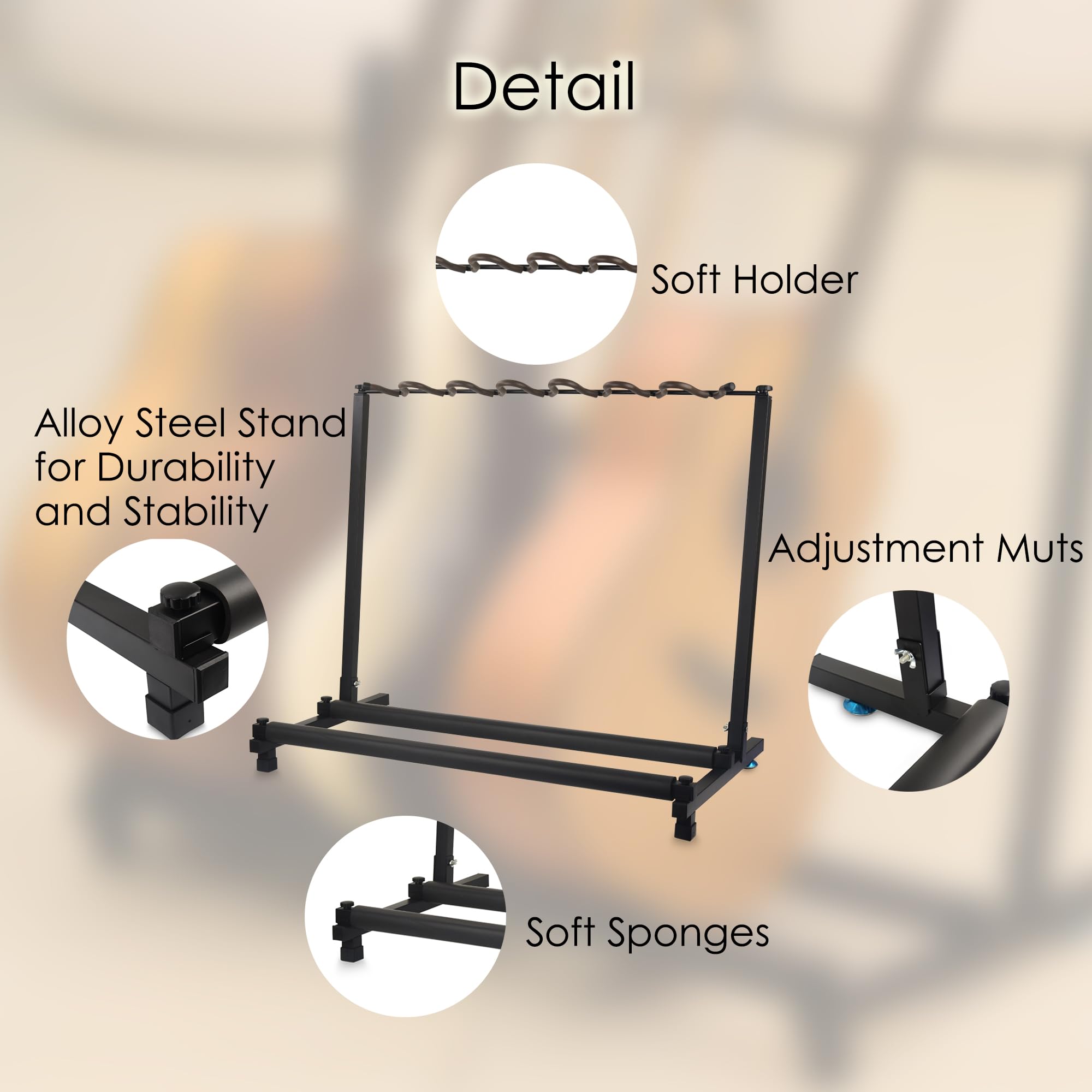 El soporte multi guitarra plegable de Aorom es una solución práctica de almacenamiento con 7 soportes para guitarras acústicas, eléctricas, bajos y clásicas. Es muy fácil de instalar y no requiere herramientas. Fabricado con aleación de acero de alta calidad y goma suave que lo hace duradero y sólido. Puede ser fácilmente plegado para un almacenamiento conveniente y ahorro de espacio. La base tiene goma para proteger el suelo de arañazos y los soportes de esponja suave sostienen las guitarras de forma estable sin rayarlas.