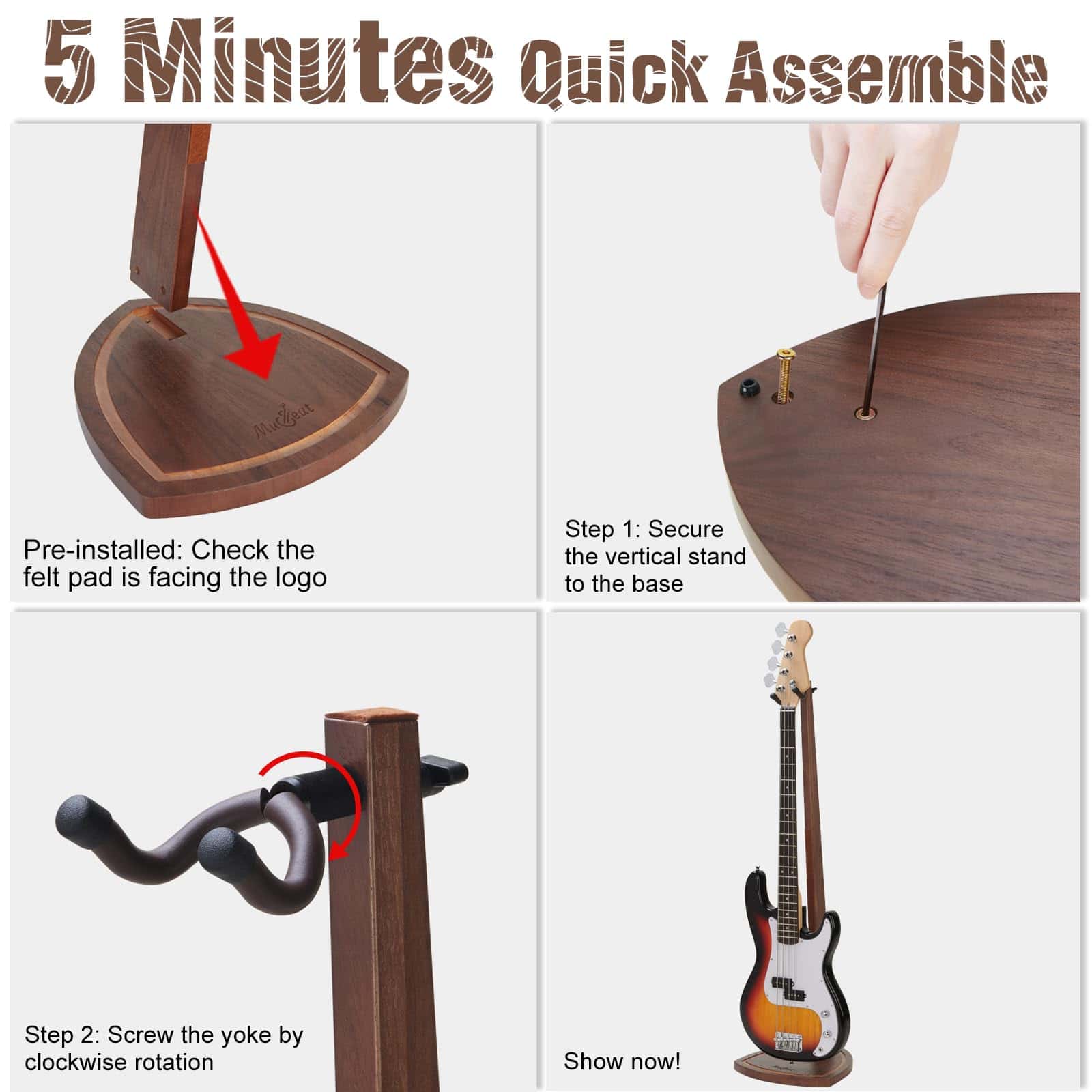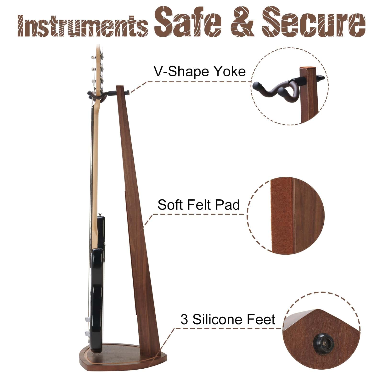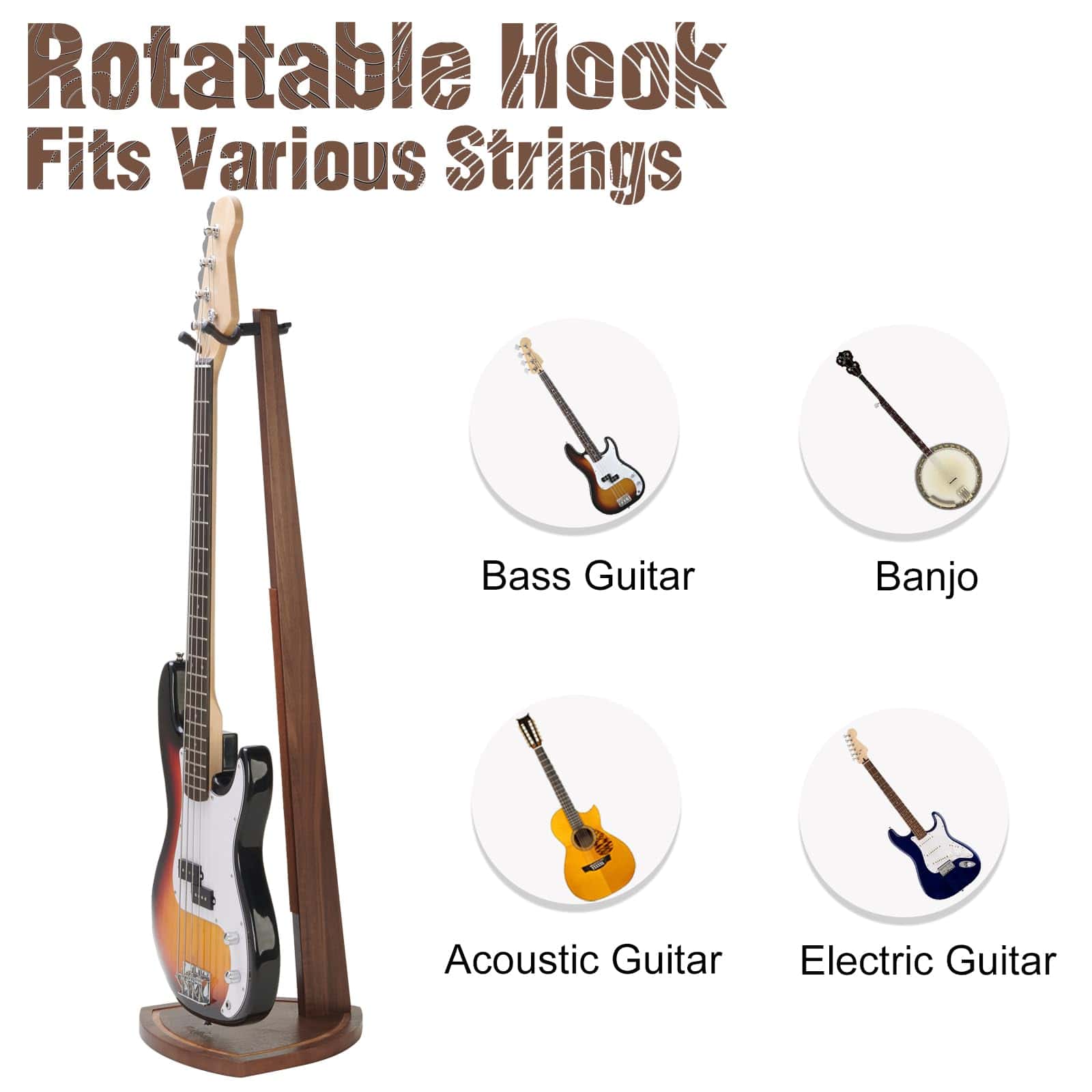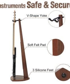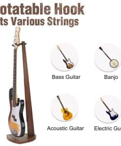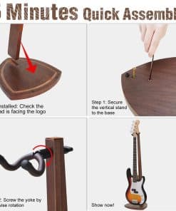 1. Estéticamente Elegante y Funcional: Cansado de los soportes de metal negro invariables. Hecho con madera dura sólida, este soporte de bajo de madera con veta de madera natural presenta su belleza de una manera simple y elegante que llamará la atención de cualquier visitante en tu hogar y dirá: «¡wow, eso es!». La atractiva y pulida línea de este soporte de guitarra eléctrica hace que parezca un mueble y convierte tu querida guitarra en una obra de arte decorativa también. 2. Se Adapta a Varios Instrumentos: La altura desde el yugo hasta la base es de 39 pulgadas, cubriendo la mayoría de los instrumentos de cuerda como el bajo, la guitarra acústica, la guitarra eléctrica, el bajo eléctrico, el banjo y la mandolina. Teniendo en cuenta la compatibilidad de diferentes cabezas de guitarra, como rectas, inclinadas o en espiga, el colgador del soporte de bajo de madera de Musbeat está especialmente diseñado como rotativo 360 grados y se adapta muy bien a todos ellos. 3. Seguro y Protegido el Instrumento: Junto con la forma de espada del soporte, todas las superficies de contacto que puedan tocar el acabado del instrumento están cubiertas con almohadilla de fieltro que ofrece un buen amortiguador y protección. Considerando el suelo de moqueta suave, la parte trasera de la base está atornillada con 3 pies de silicona para evitar que el soporte se vuelque por un golpe de amigos peludos como perros y gatos e incluso las aspiradoras. 4. Fácil de Alcanzar y Practicar: En comparación con un soporte de guitarra trípode con patas sobresalientes o soportes típicos inclinados, este soporte de bajo ocupa menos espacio al mostrar tu guitarra flotando en el aire, permitiendo un acceso rápido para la necesidad urgente de tocar, y de una manera elegante manteniendo tu guitarra en un espacio compacto para exhibirla, ya sea en la sala de estar, sala de dibujo, dormitorio principal, sala de música, estudio y comedor. 5. Montaje Rápido en 5 Minutos: Siguiendo el folleto de instrucciones adjunto, este soporte de guitarra eléctrica se puede instalar rápidamente con solo 2 pasos en 5 minutos. Paso 1: asegurar la base al soporte vertical con 2 tornillos de cabeza hexagonal (llave hexagonal incluida). Paso 2: atornillar el yugo mediante rotación en sentido horario en la parte superior del soporte. El soporte de guitarra de madera sería un regalo ideal para guitarristas, hombres, mujeres, maridos, esposas, amigos a los que les gustan los instrumentos musicales en Navidad, Acción de Gracias.