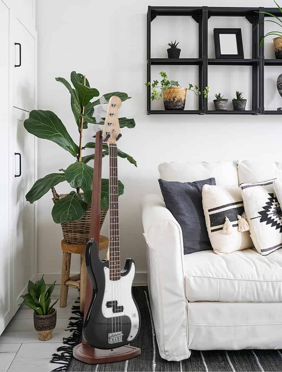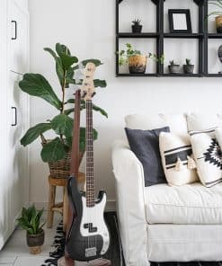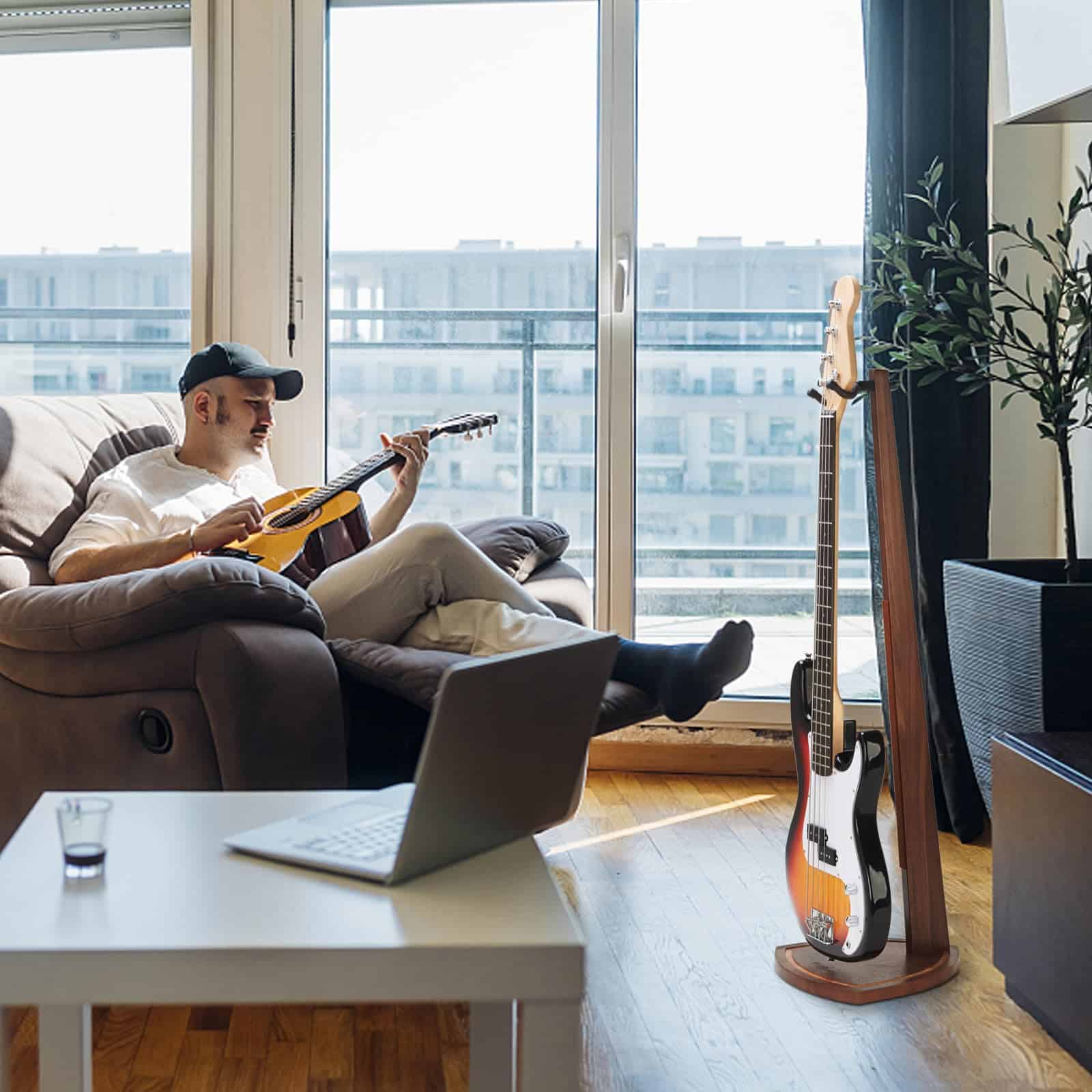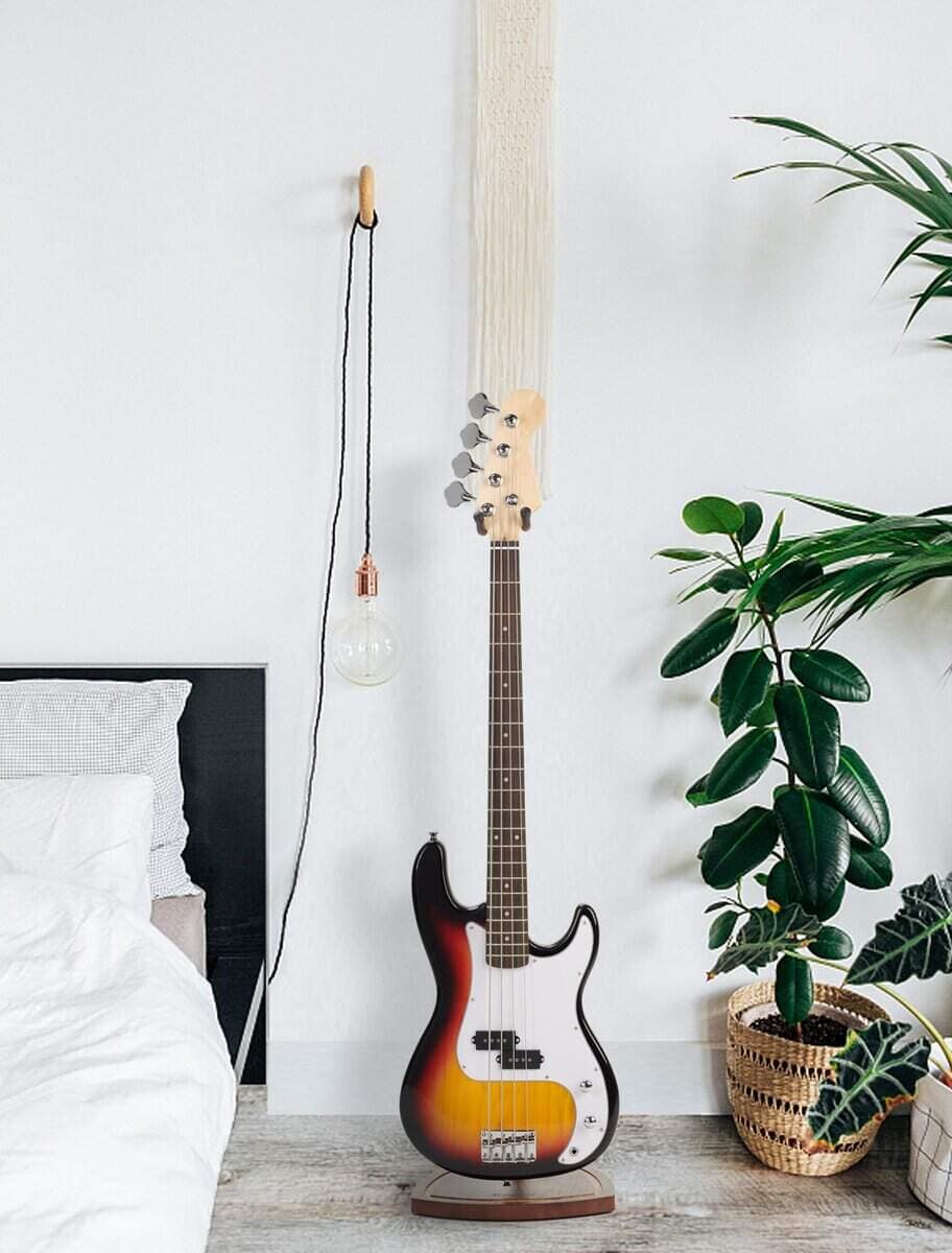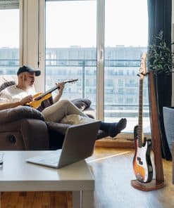 1. Estéticamente Elegante y Funcional: Cansado de los soportes de metal negro invariables. Hecho con madera dura sólida, este soporte de bajo de madera con veta de madera natural presenta su belleza de una manera simple y elegante que llamará la atención de cualquier visitante en tu hogar y dirá: «¡wow, eso es!». La atractiva y pulida línea de este soporte de guitarra eléctrica hace que parezca un mueble y convierte tu querida guitarra en una obra de arte decorativa también. 2. Se Adapta a Varios Instrumentos: La altura desde el yugo hasta la base es de 39 pulgadas, cubriendo la mayoría de los instrumentos de cuerda como el bajo, la guitarra acústica, la guitarra eléctrica, el bajo eléctrico, el banjo y la mandolina. Teniendo en cuenta la compatibilidad de diferentes cabezas de guitarra, como rectas, inclinadas o en espiga, el colgador del soporte de bajo de madera de Musbeat está especialmente diseñado como rotativo 360 grados y se adapta muy bien a todos ellos. 3. Seguro y Protegido el Instrumento: Junto con la forma de espada del soporte, todas las superficies de contacto que puedan tocar el acabado del instrumento están cubiertas con almohadilla de fieltro que ofrece un buen amortiguador y protección. Considerando el suelo de moqueta suave, la parte trasera de la base está atornillada con 3 pies de silicona para evitar que el soporte se vuelque por un golpe de amigos peludos como perros y gatos e incluso las aspiradoras. 4. Fácil de Alcanzar y Practicar: En comparación con un soporte de guitarra trípode con patas sobresalientes o soportes típicos inclinados, este soporte de bajo ocupa menos espacio al mostrar tu guitarra flotando en el aire, permitiendo un acceso rápido para la necesidad urgente de tocar, y de una manera elegante manteniendo tu guitarra en un espacio compacto para exhibirla, ya sea en la sala de estar, sala de dibujo, dormitorio principal, sala de música, estudio y comedor. 5. Montaje Rápido en 5 Minutos: Siguiendo el folleto de instrucciones adjunto, este soporte de guitarra eléctrica se puede instalar rápidamente con solo 2 pasos en 5 minutos. Paso 1: asegurar la base al soporte vertical con 2 tornillos de cabeza hexagonal (llave hexagonal incluida). Paso 2: atornillar el yugo mediante rotación en sentido horario en la parte superior del soporte. El soporte de guitarra de madera sería un regalo ideal para guitarristas, hombres, mujeres, maridos, esposas, amigos a los que les gustan los instrumentos musicales en Navidad, Acción de Gracias.