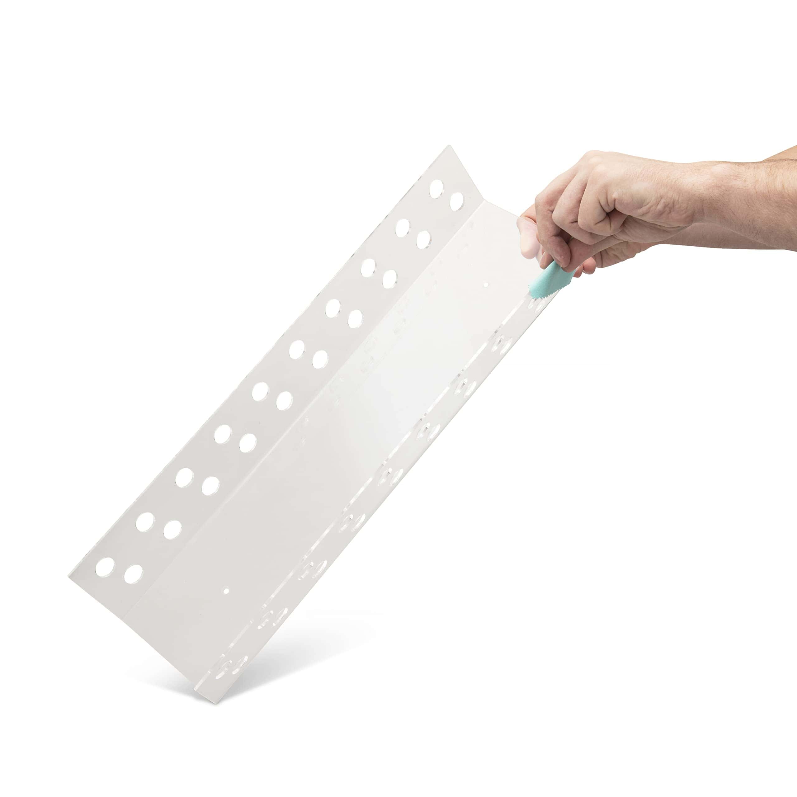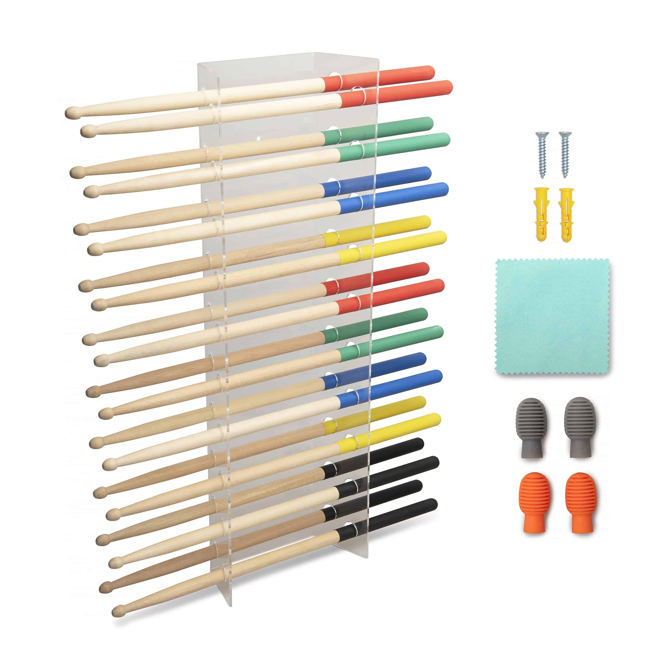 Soporte para baquetas de acrílico Qidaco Creek – Muestra 10 juegos de baquetas, amplia compatibilidad – Completo con amortiguadores de baquetas y paño para el polvo