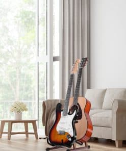 4. Ahorro de Espacio: En comparación con un trípode tradicional o soporte individual, este compacto soporte doble de guitarra puede acomodar 2 guitarras (guitarra acústica, eléctrica o baja) como máximo pero ocupa una huella más compacta, evitando que más guitarras se extiendan sobre los muebles o se apoyen contra las paredes. Elija este soporte de guitarra eléctrica y podrá lograr lo que se diseñó para: decir adiós al desorden de múltiples soportes de guitarra y dejar más espacio en el suelo abierto y organizado.