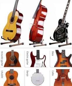 Este soporte de guitarra está especialmente diseñado para guitarras, bajos, violines, ukulele y otros instrumentos de cuerda. Está hecho de madera de nogal negro. El marco de madera es muy suave y el grano de madera es claro. No importa dónde se coloque, no se sentirá incómodo.