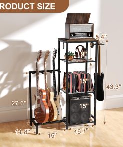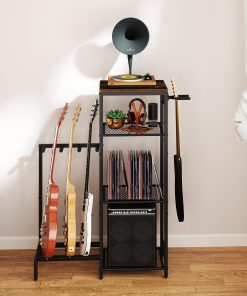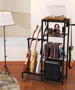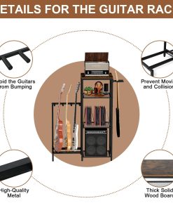 Soporte de guitarra múltiple resistente: El soporte para guitarra múltiple está hecho de tubos de metal de alta calidad y madera resistente, lo cual es robusto y duradero; La base está equipada con almohadillas antideslizantes ajustables para garantizar la estabilidad del soporte para guitarra multifuncional y proteger el piso de arañazos. Espuma para proteger los instrumentos musicales: Los tubos de metal en contacto con la guitarra están cubiertos con una espuma suave, que no dejará marcas en sus instrumentos musicales, evitará rayar sus instrumentos musicales y los protegerá mejor. Más espacio de almacenamiento: El soporte para guitarra múltiple Huyear tiene 4 capas de estanterías de almacenamiento para mejorar su espacio de almacenamiento. Puede almacenar más cosas como tocadiscos, discos, mezcladores de guitarra, amplificadores y accesorios, etc. Fácil de instalar: El soporte para guitarra múltiple tiene 2 combinaciones de instalación, los accesorios en los lados izquierdo y derecho se pueden intercambiar, ajustar en posición e instalar y quitar según las preferencias personales. Se incluyen dos instrucciones de instalación para diferentes combinaciones en el empaque, lo que hace que la instalación sea sencilla.