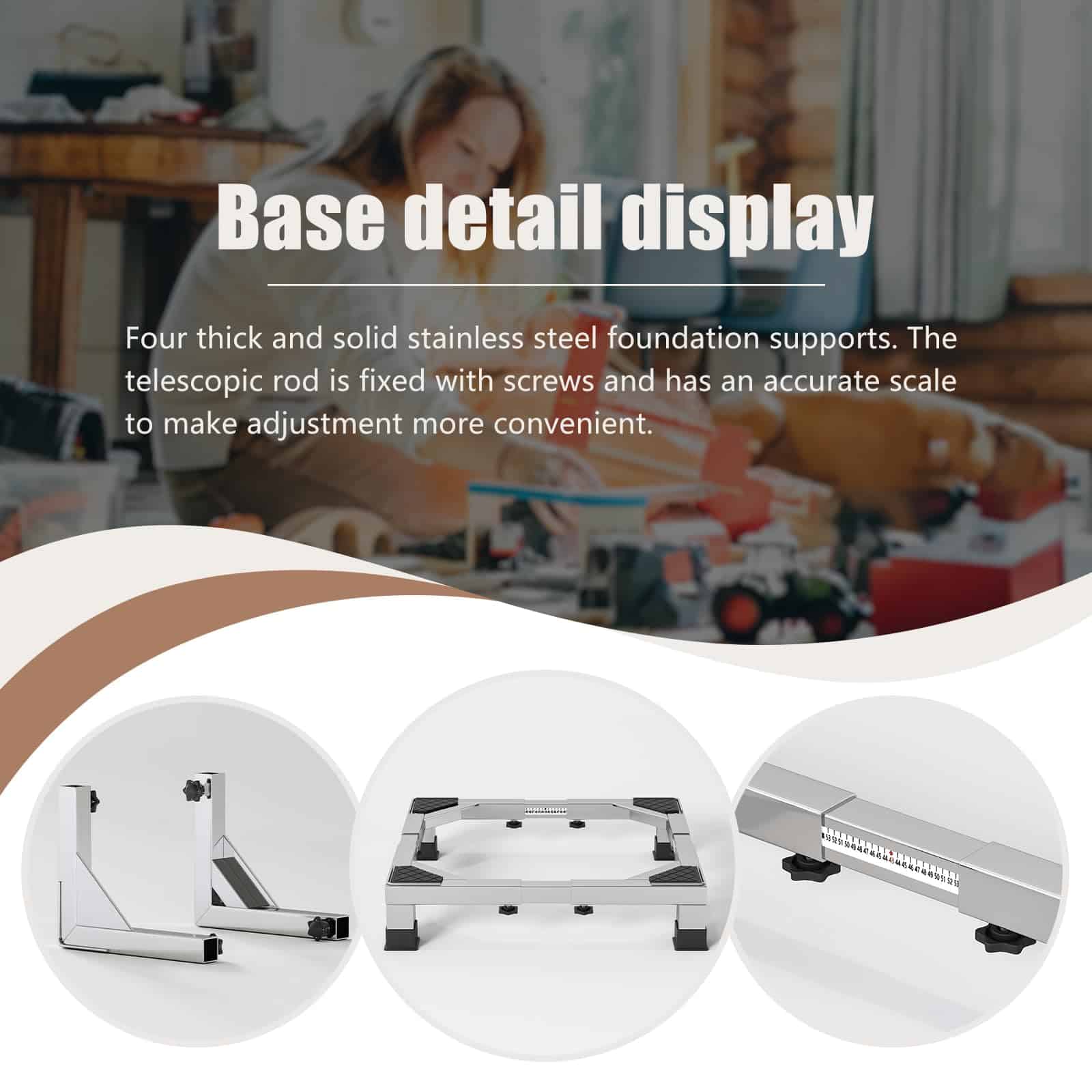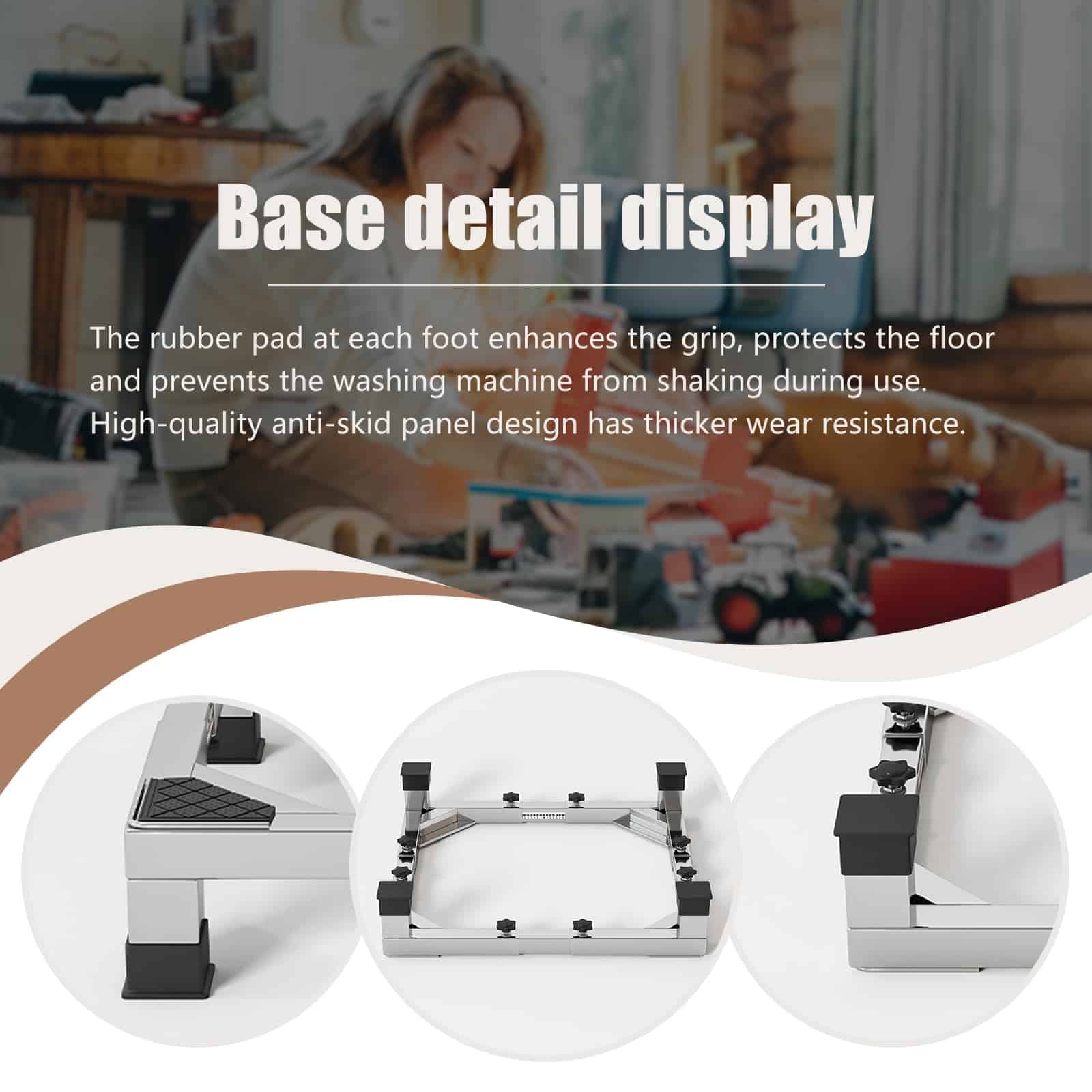 El soporte para lavadora y refrigeradora de acero inoxidable resistente Zsytbyyds es más resistente y un buen ayudante para tu familia. Con una capacidad de carga de hasta 1200 libras, es ideal como base para lavadoras portátiles, lavadoras y secadoras, refrigeradoras, mini-refrigeradoras u otros electrodomésticos del hogar. Puede ajustarse desde 23 pulgadas hasta 37-3/8 pulgadas de ancho, desde 19 pulgadas hasta 32-3/8 pulgadas de profundidad y 6 pulgadas de altura, adaptable a diferentes electrodomésticos y muebles. Fácil de armar, el soporte para refrigeradora es casi ensamblado, solo necesitas instalar la varilla de conexión. El diseño de enganche permite que una persona complete la instalación en 3 minutos. Este soporte para lavadora y refrigeradora puede ayudarte a fijar fácilmente pequeños electrodomésticos en tu hogar y dormitorio, como mini refrigeradoras, lavadoras, secadoras, refrigeradoras, etc.
