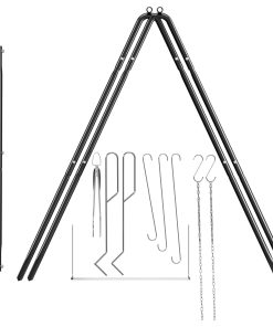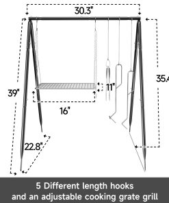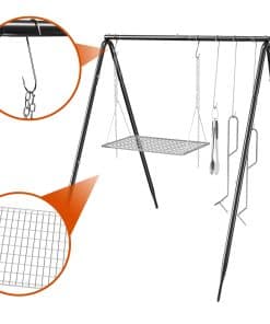 Este estante para parrilla es ligero y portátil, lo que facilita su transporte y almacenamiento. Su diseño ajustable con cadena y ganchos giratorios permite ajustar la altura de la rejilla según los ingredientes y las temperaturas de cocción deseadas. Además, viene con múltiples ganchos para colgar utensilios de cocina y accesorios de horno holandés.