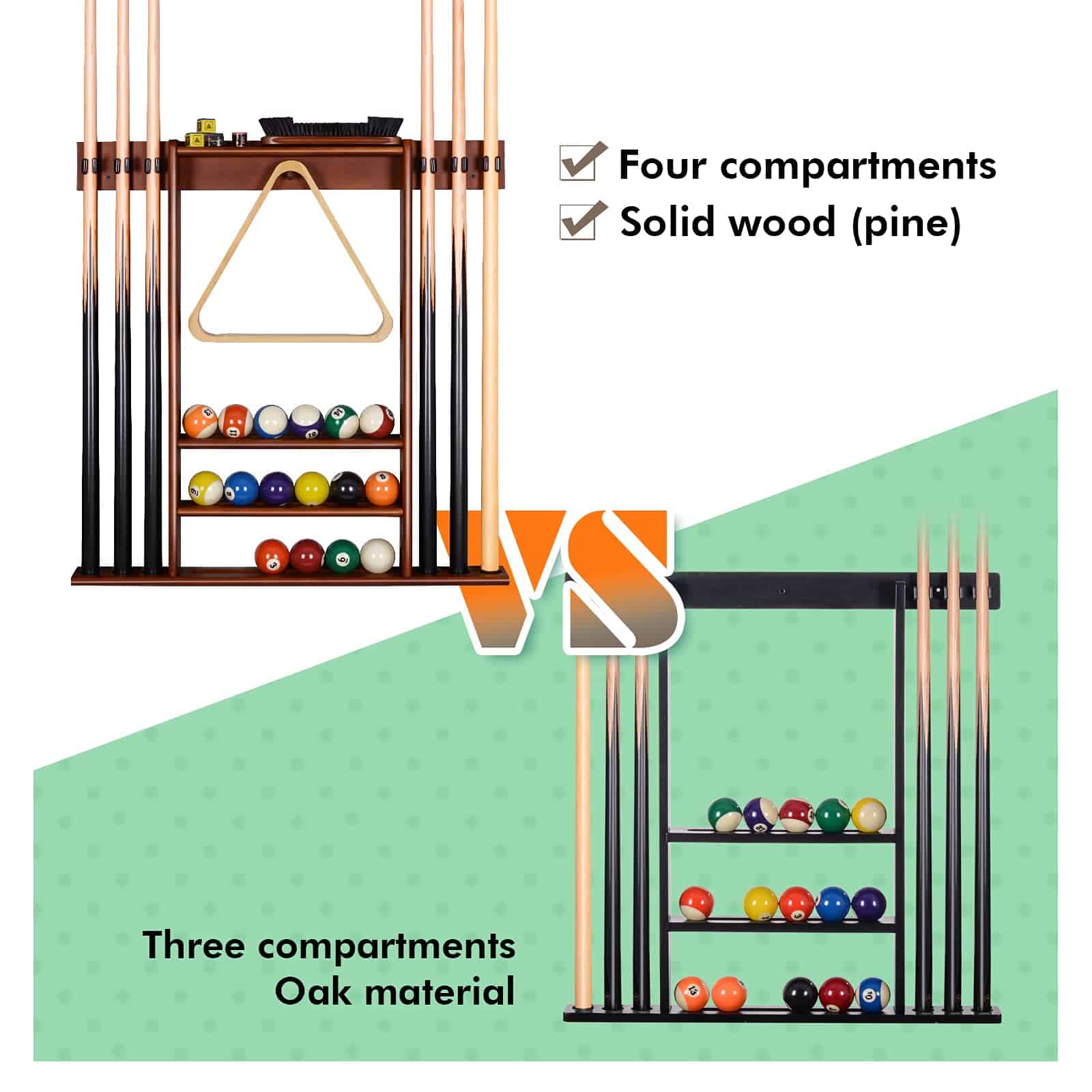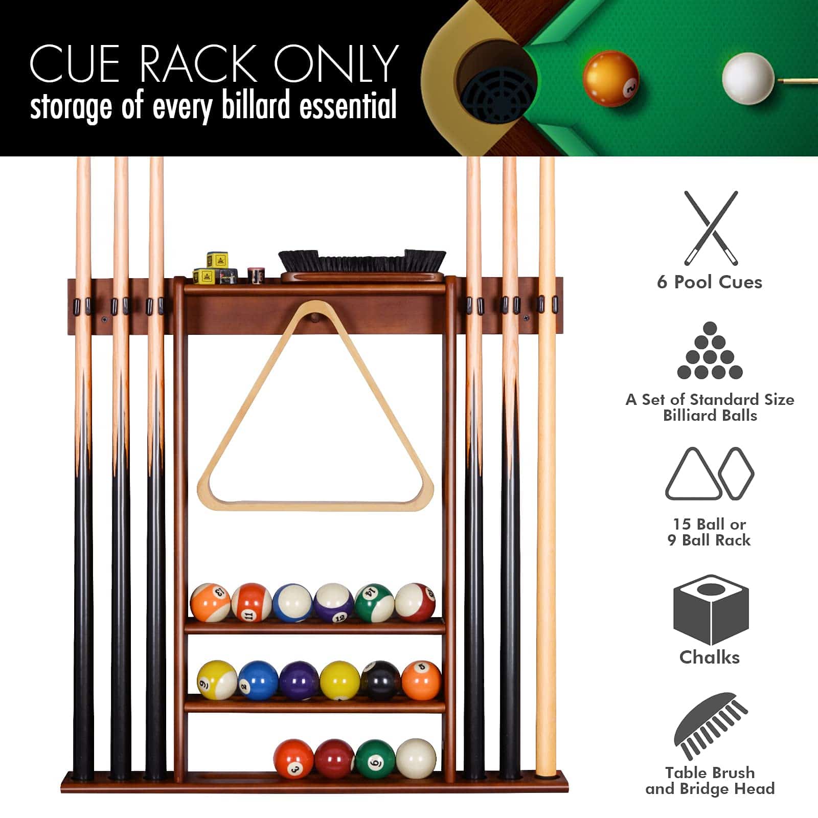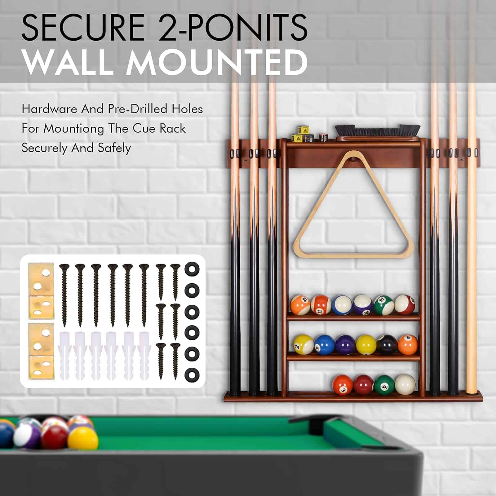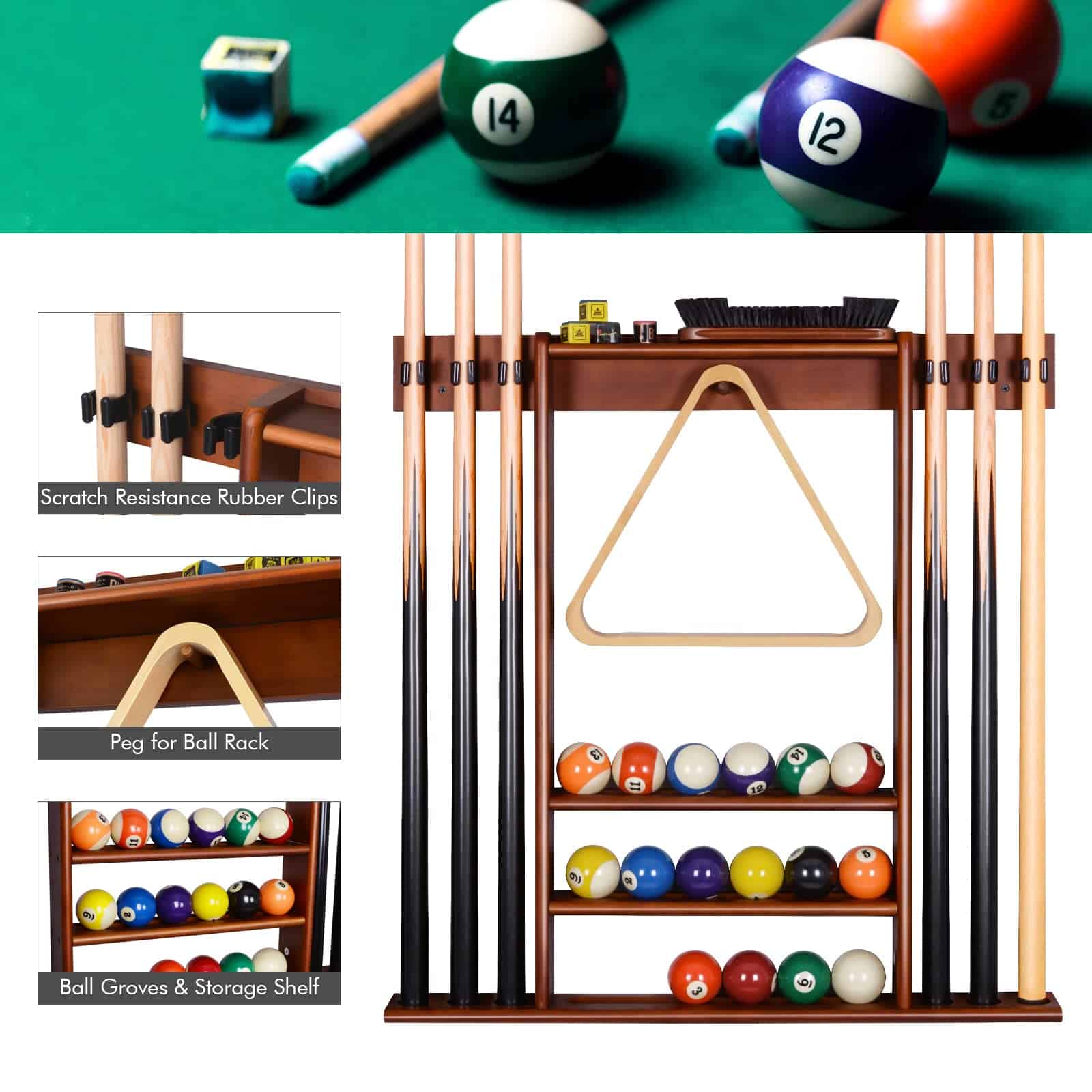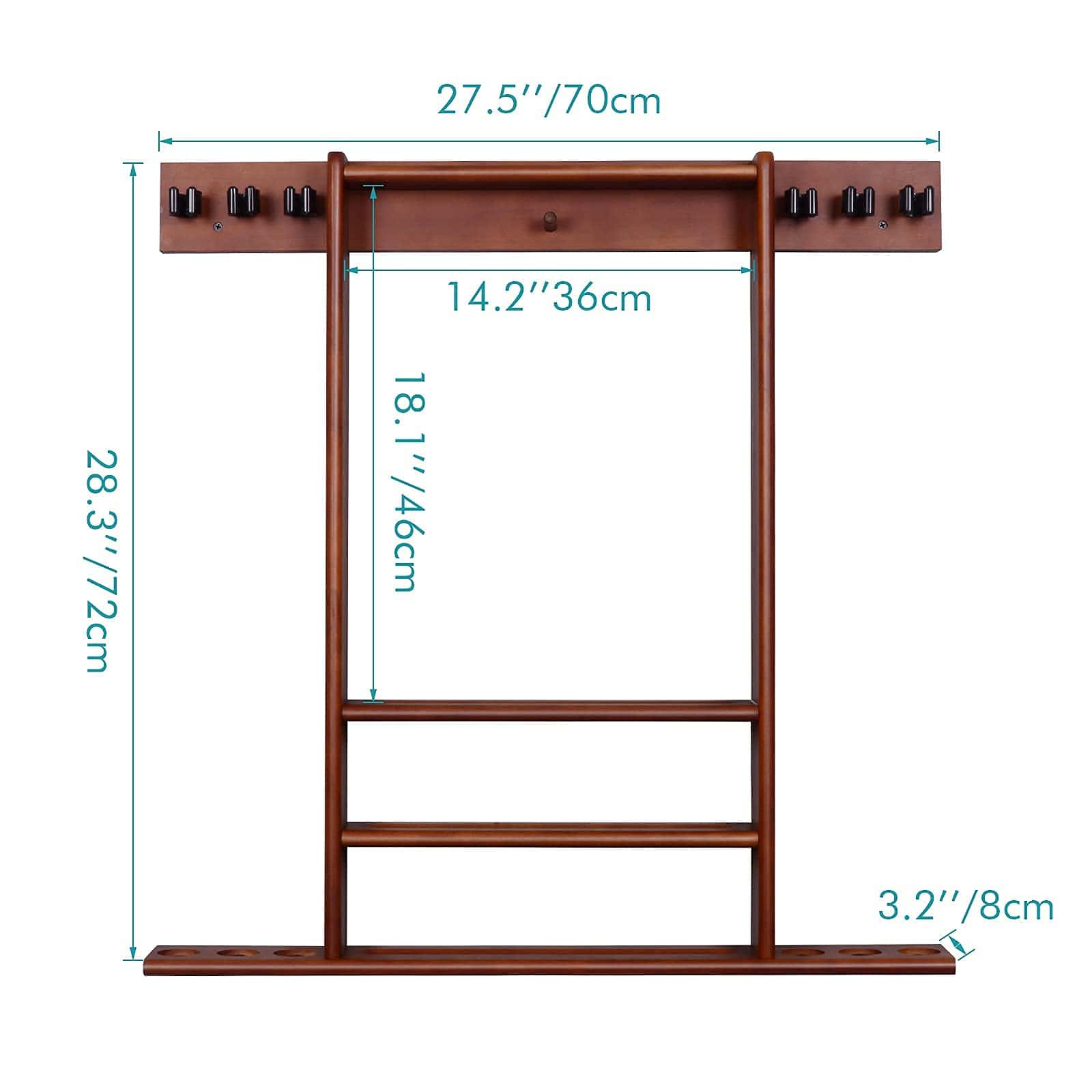 Soporte para palos de billar XCSOURCE, Soporte para palos de billar montado en la pared, 6 palos de billar + juego de bolas Soporte para tacos de billar, Accesorios de mesa de billar para salón de billar Hombre cueva, Cherry. Fabricado en madera maciza y de construcción robusta. Hecho de 100% madera de pino maciza y teñido con acabado en cerezo, este soporte para tacos de billar está construido de forma robusta y seguramente te durará mucho tiempo. Utilizar un soporte de pared montado para sostener tus tacos es una excelente manera de almacenar todos tus accesorios de billar sin ocupar espacio valioso en el suelo y mantener tu sala de juegos limpia y organizada. Los 6 tacos se mantienen uno al lado del otro, haciendo que sea fácil y conveniente acceder a los tacos cuando sea necesario mientras que las 3 hendiduras en el centro mantienen un juego de bolas de billar de tamaño estándar en su lugar. Y el clavija en el medio es para colgar el estante de bola de 15 bolas o 9 bolas. Los estantes en la parte superior están pensados para mantener otros accesorios de billar como tiza, cepillo de mesa o puente. Este estante de madera para tacos de billar satisface todas tus necesidades para jugar al billar y aporta carácter a la sala de juegos. Con un acabado clásico, encajará perfectamente con cualquier decoración. El estante de tacos de billar es fácil de configurar e instalar. Se incluyen todas las instrucciones de ensamblaje, hardware de montaje e instrucciones detalladas con imágenes. Nota: Los tacos, bolas, estante de bolas, tiza, cepillo y puente no están incluidos.