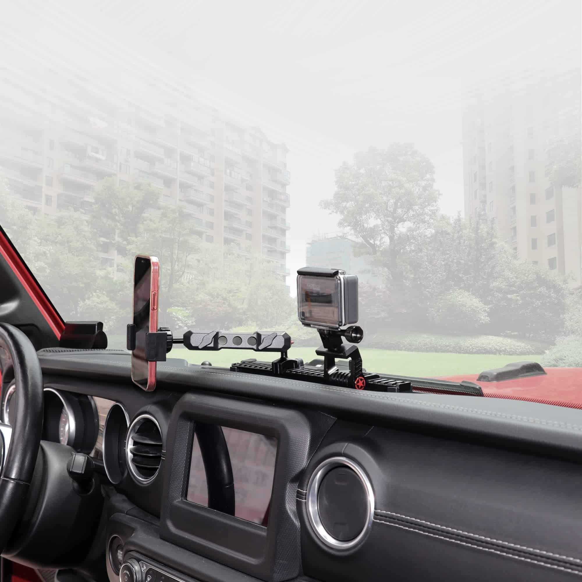 Soporte para teléfono móvil con rieles deslizantes para Jeep Wrangler JL 2018-2022, compatible con GoPro y teléfonos inteligentes. Este práctico soporte te permite ajustar la posición del soporte de izquierda a derecha, ahorrando espacio en el tablero. Fabricado en aleación de aluminio y ABS, este soporte es resistente y duradero, perfecto incluso para caminos irregulares. Además, la posibilidad de cambiar el soporte de la cámara por un soporte de teléfono móvil te brinda una mayor versatilidad. Si necesitas asistencia, nuestro equipo de atención al cliente está disponible para ayudarte en cualquier momento. ¡Haz que cada viaje en tu Jeep sea más cómodo y práctico con este innovador soporte para teléfono móvil!