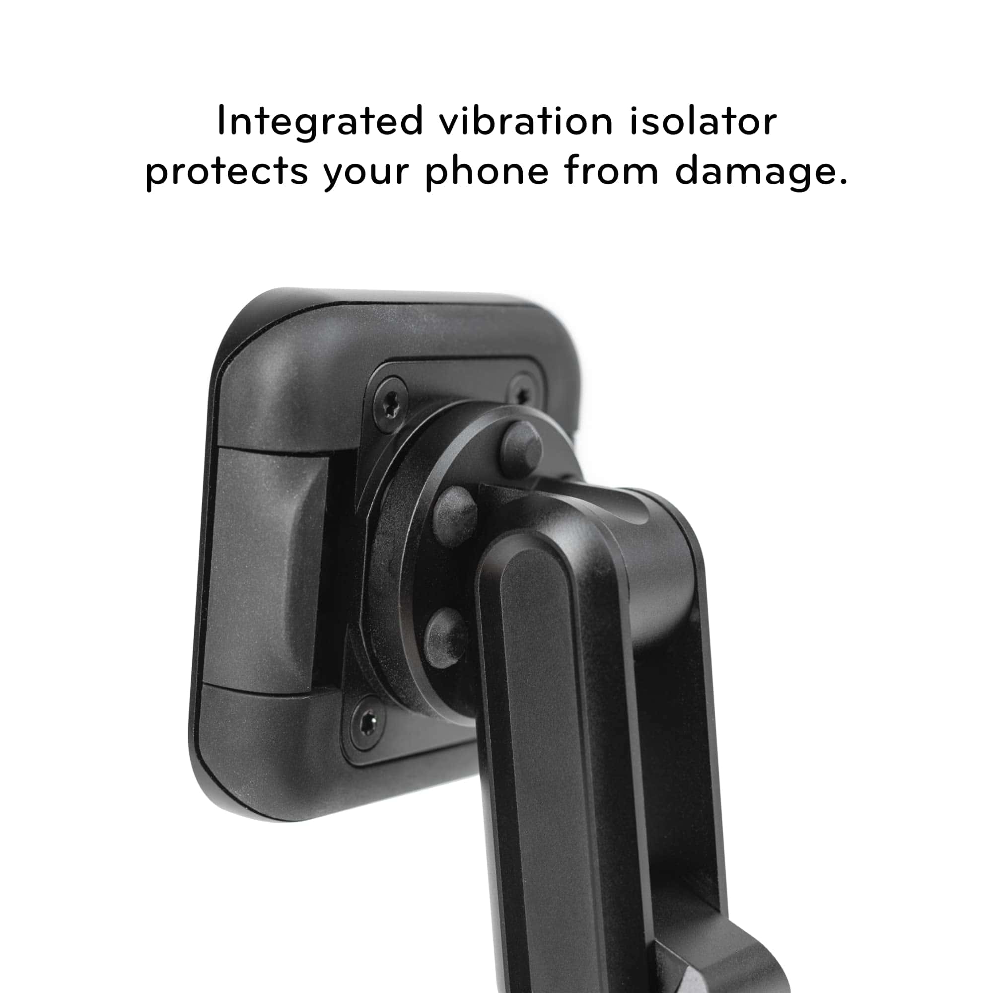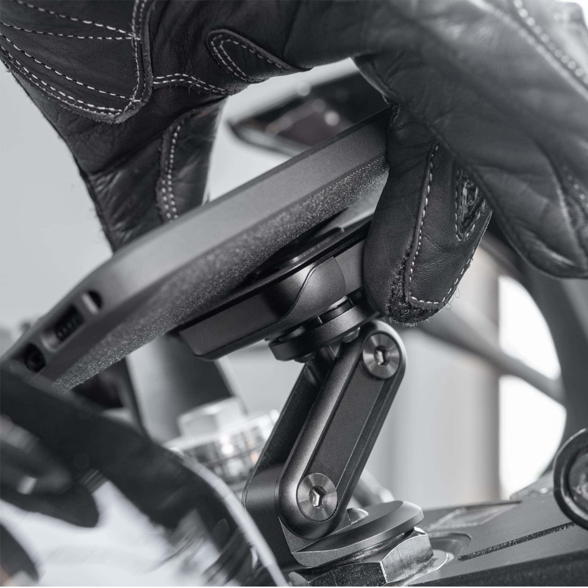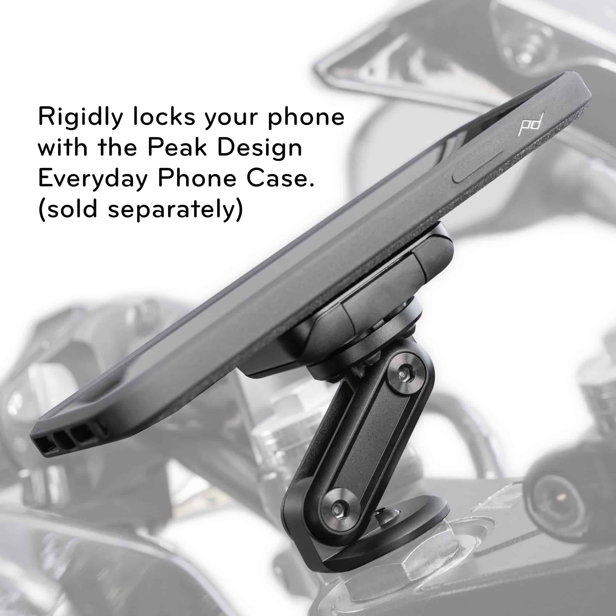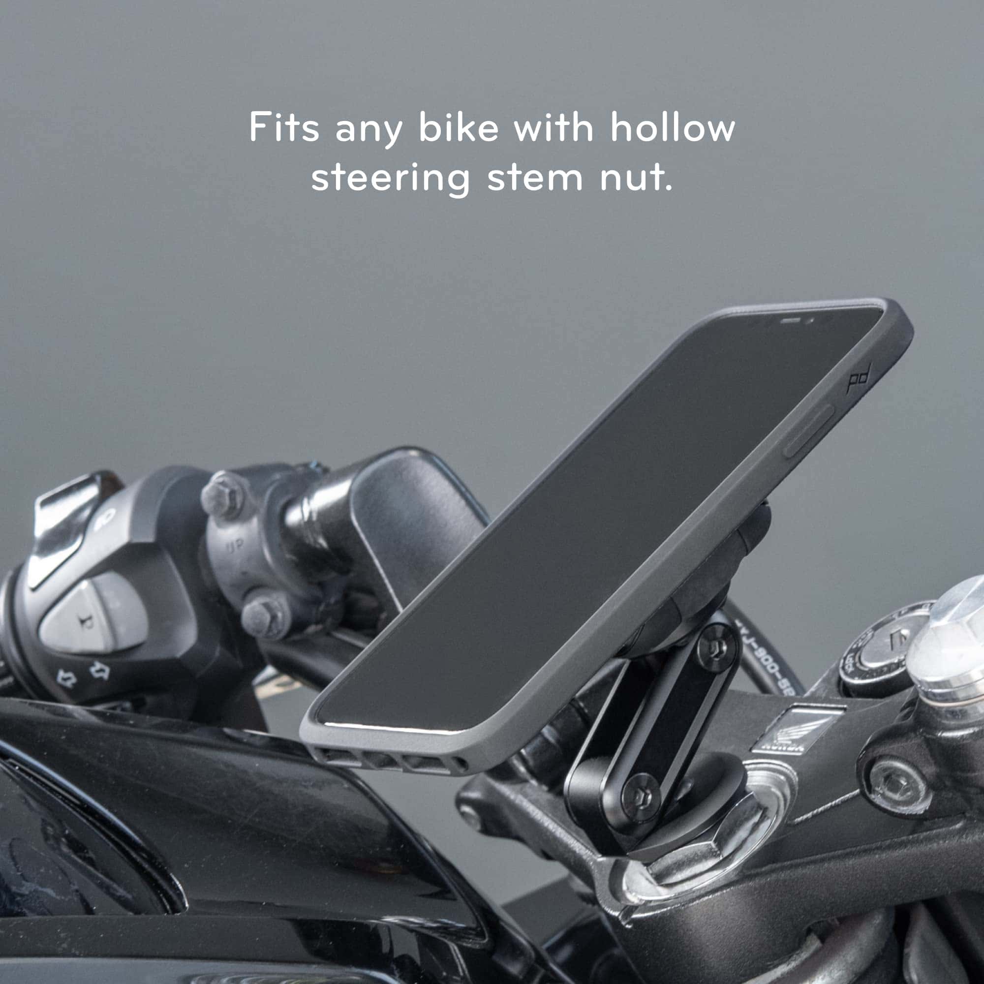 1. Monte de forma segura y rígida su teléfono en motocicletas deportivas o de calle con manillares de estilo clip-on. 2. Se adapta a cualquier motocicleta que tenga (o pueda ser equipada con) una tuerca de vástago de dirección hueca (diámetro interior 13mm-26mm). 3. Sujeta el teléfono en modo vertical u horizontal. 4. La tecnología de bloqueo magnético (llamada SlimLink) es ultra segura y se siente como magia. 5. Construcción de aluminio resistente a la intemperie y duradera.