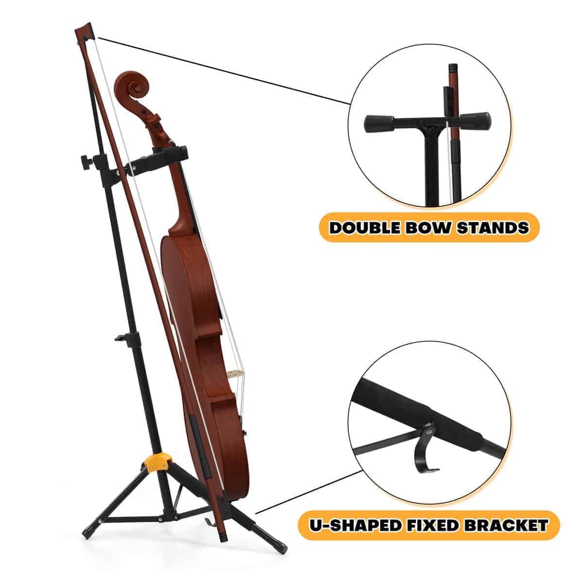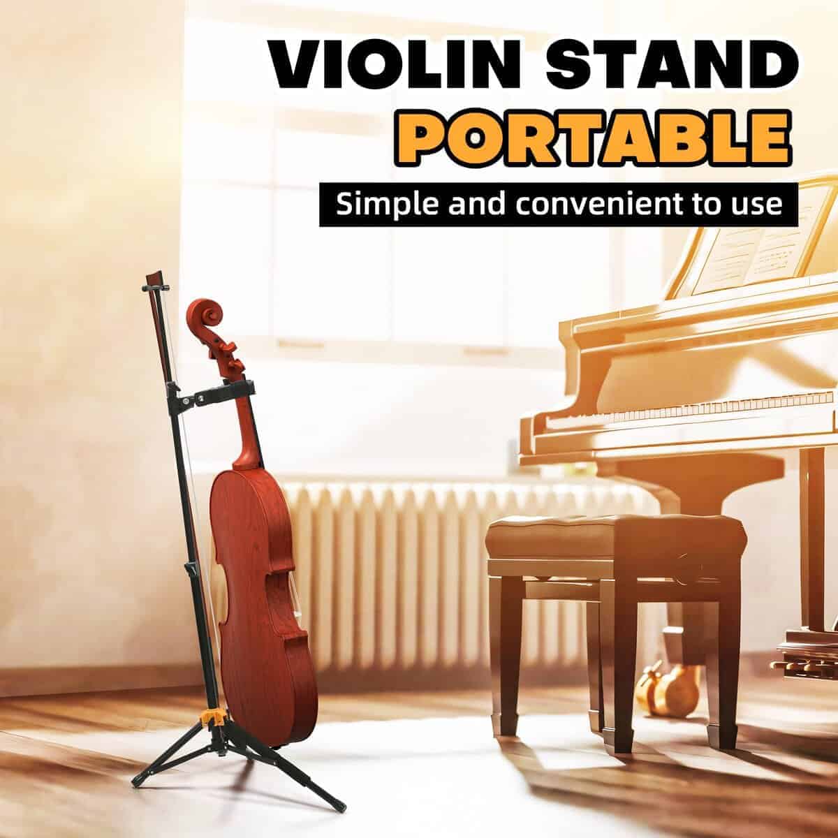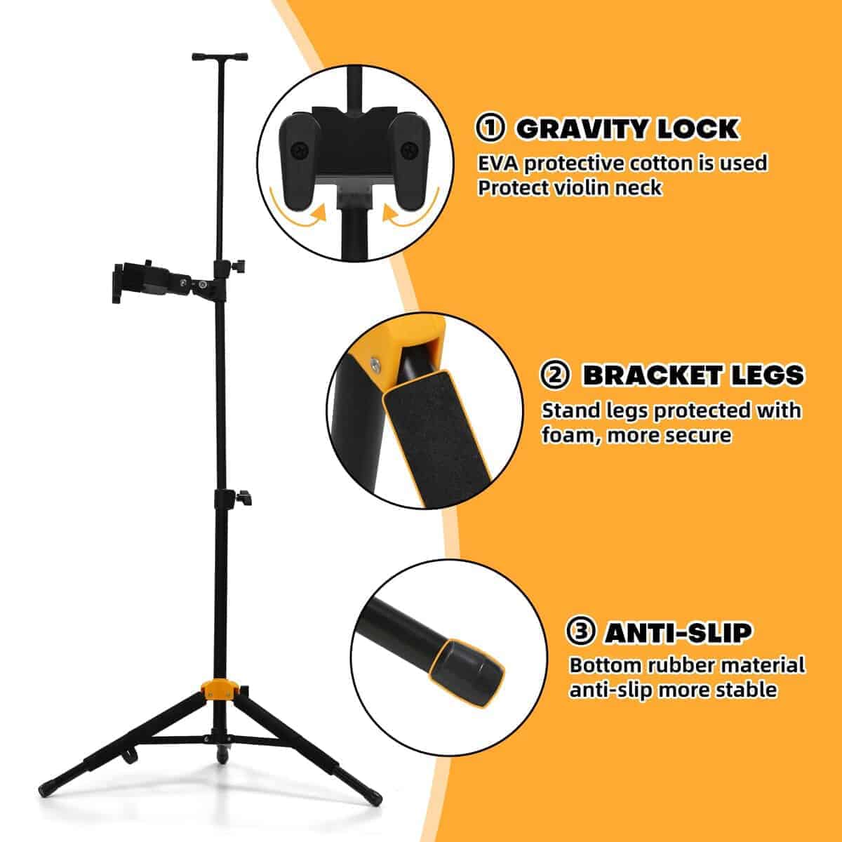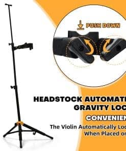 1. Bloqueo por Gravedad Automático: El cabezal de nuestro soporte para violín adopta el diseño de bloqueo por gravedad automático. Después de colocar el violín, el cabezal se bloqueará automáticamente y asegurará el violín. Es conveniente y rápido sin ajuste manual. La base del soporte para violín con soporte para arco adopta un diseño triangular, lo que proporciona una mayor estabilidad. 2. Protección Integral: La parte donde el soporte para violín contacta con el mástil del violín está hecha de espuma suave y cómoda para asegurar que su violín no se raye. La parte donde las patas del soporte para violín están en contacto con el violín tiene espuma cómoda para protegerlo. El instrumento proporciona protección integral y está equipado con almohadillas de goma antideslizantes, lo que aumenta la estabilidad y seguridad del suelo del soporte de guitarra. 3. Tamaño Ajustable: El soporte para violín tiene tres perillas ajustables en todo el cuerpo para ajustar la altura según sus propias necesidades. Puede soportar la colocación de un arco de hasta 37.8IN, y la distancia máxima desde el suelo es de 37.4IN; hay un área en forma de U debajo para el soporte de ukulele. El arco no se balancea de izquierda a derecha cuando está en reposo; los accesorios para violín solo tienen 18.9IN después de plegarse, lo que lo hace muy conveniente de llevar. 4. Material de Alta Calidad: El soporte para violín con soporte para arco está hecho de materiales compuestos de alta calidad, que son impermeables, resistentes a la corrosión y duraderos. Las partes en contacto con el soporte para violín están envueltas en espuma suave, proporcionando a su violín protección integral. 5. Elección de Regalo Ideal: Nuestro soporte para ukulele puede mostrar su ukulele y violín en el estudio de música, la sala de estar y la tienda de pianos; puede elegir este soporte para violín con soporte para arco como regalo para aquellos que poseen ukuleles y violines u otros instrumentos musicales pequeños como regalos de Navidad/Año Nuevo/Día de Acción de Gracias para amigos o familiares.