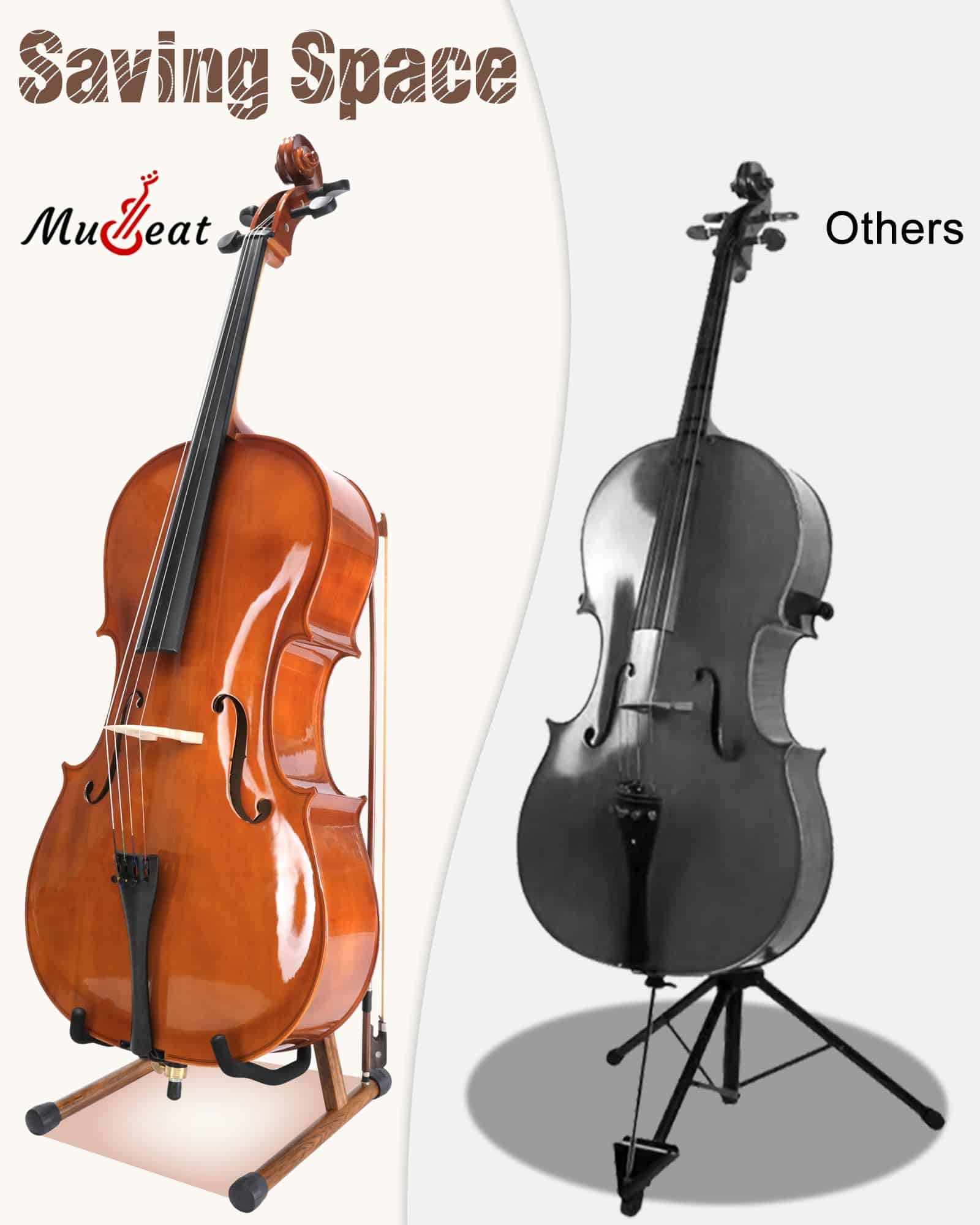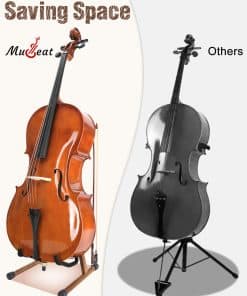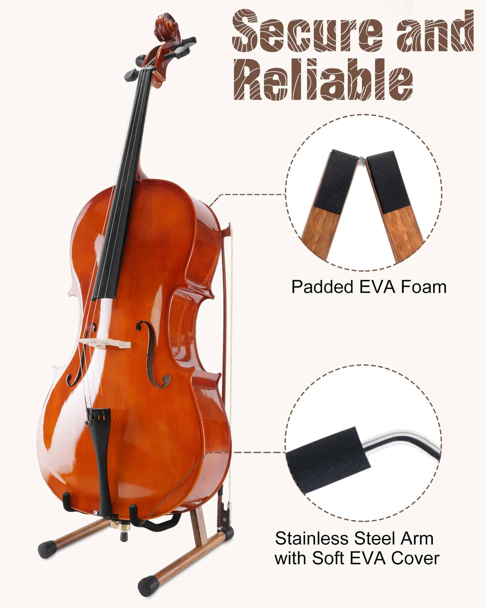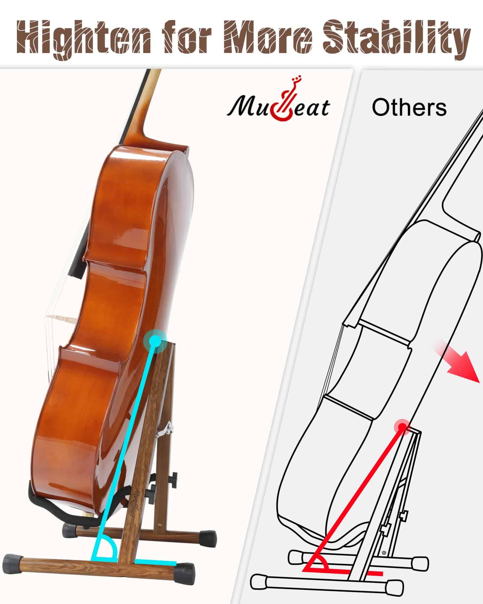 1. Más Estabilidad: Si te preocupa que tu violonchelo se caiga por un estornudo o una brisa, es hora de considerar el resistente soporte para violonchelo de Musbeat. A diferencia de otros soportes de metal ligero, el estable soporte para violonchelo de Musbeat cuenta con una barra de apoyo más larga y pesada, ofreciendo una huella más amplia y una estabilidad mejorada para tu instrumento. Con este sólido soporte de violonchelo de madera, puedes colocar tu violonchelo con confianza sin preocuparte de que se caiga.