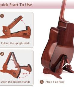 1. Madera real ecológica: todos están hechos de madera natural, puedes elegir nogal negro, bambú o cebra. El aspecto es suave y de calidad premium, no te preocupes por oxidarse como el hierro. 2. Diseño único de animal: este diseño en forma de conejo es patentado. No es necesario ensamblar, es estable y se dobla fácilmente. Muy conveniente y seguro para llevar en cualquier momento. 3. Detalle de seguridad: con espuma EVA suave antideslizante en 2 brazos y almohadillas para proteger tu guitarra de arañazos. 4. Para guitarras versátiles: este soporte para guitarra se puede utilizar para colocar guitarras acústicas, guitarras eléctricas, violín, ukelele, bajo, banjo y otros instrumentos. 5. Regalos para amantes de instrumentos musicales: este soporte es imprescindible para los guitarristas. Si estás buscando un regalo para un músico, este producto será una elección ideal.