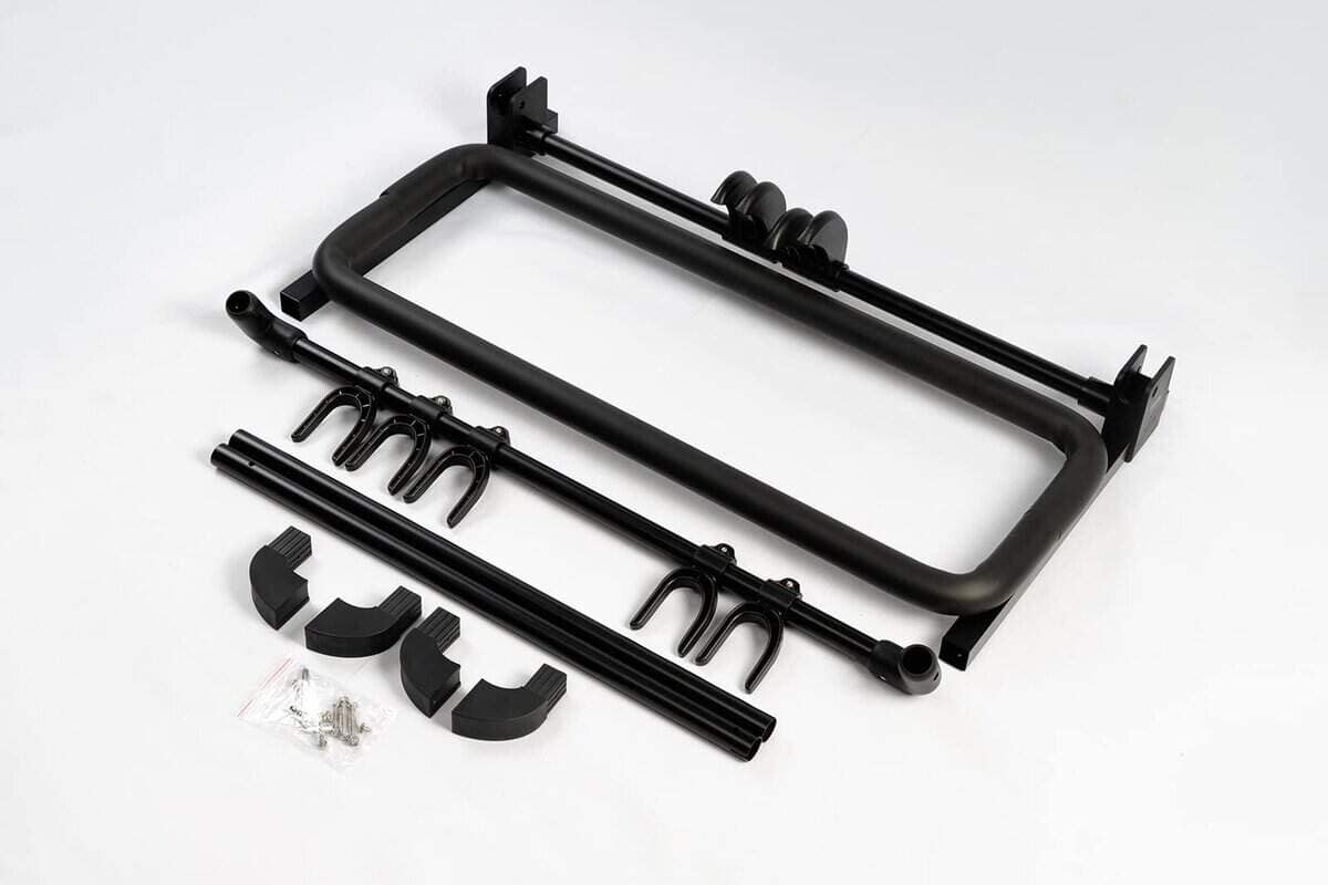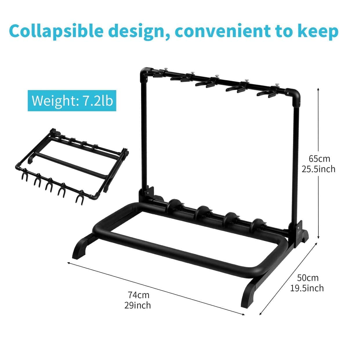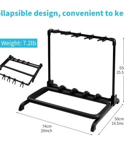 El rack de guitarra autoajustable GGS-07 tiene capacidad para 5 guitarras. En comparación con los racks de guitarra tradicionales, el GGS-07 presenta posiciones ajustables para las guitarras, para protegerlas de daños o rayones con otros instrumentos en el rack. Además, el plástico flexible evita rayones. Diseño plegable, conveniente para guardar. El GGS-07 está hecho de poliamida de alta intensidad y tubos de acero, puede soportar 30kg con facilidad. Características: 1. Posiciones ajustables para guitarras, ahorro de espacio y fácil de usar. 2. El plástico flexible protege tu guitarra de rayones. 3. Diseño plegable, conveniente de guardar. 4. Hecho de poliamida de alta intensidad y tubos de acero, firme y duradero. 5. Rack de guitarra de cinco espacios. 6. Adecuado para: guitarra eléctrica, guitarra acústica, Bajo y más. 7. Color: negro. 8. Dimensiones: 74x50x65 cm (cuando está desplegado). 9. Peso: 3.5kg.