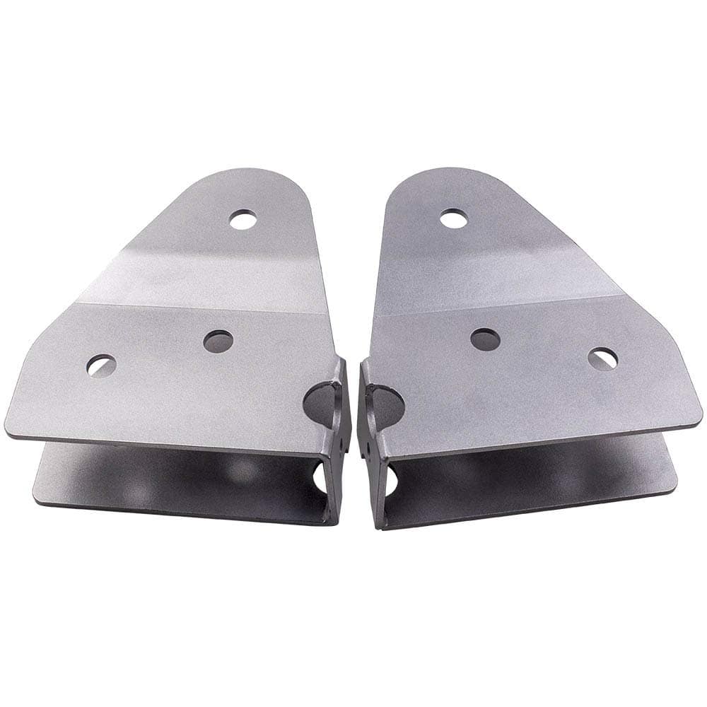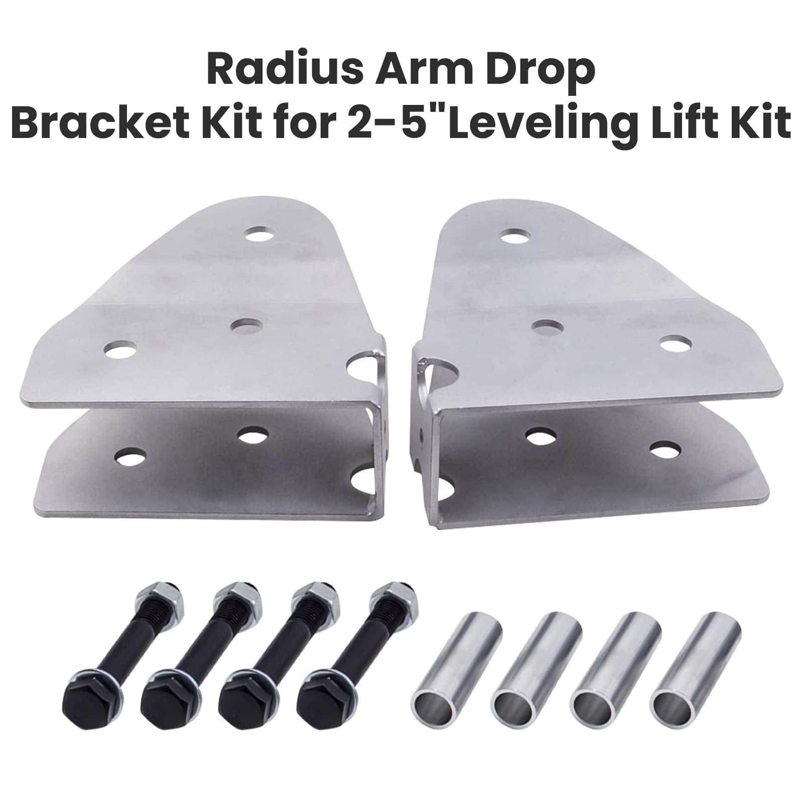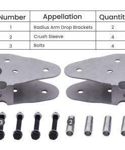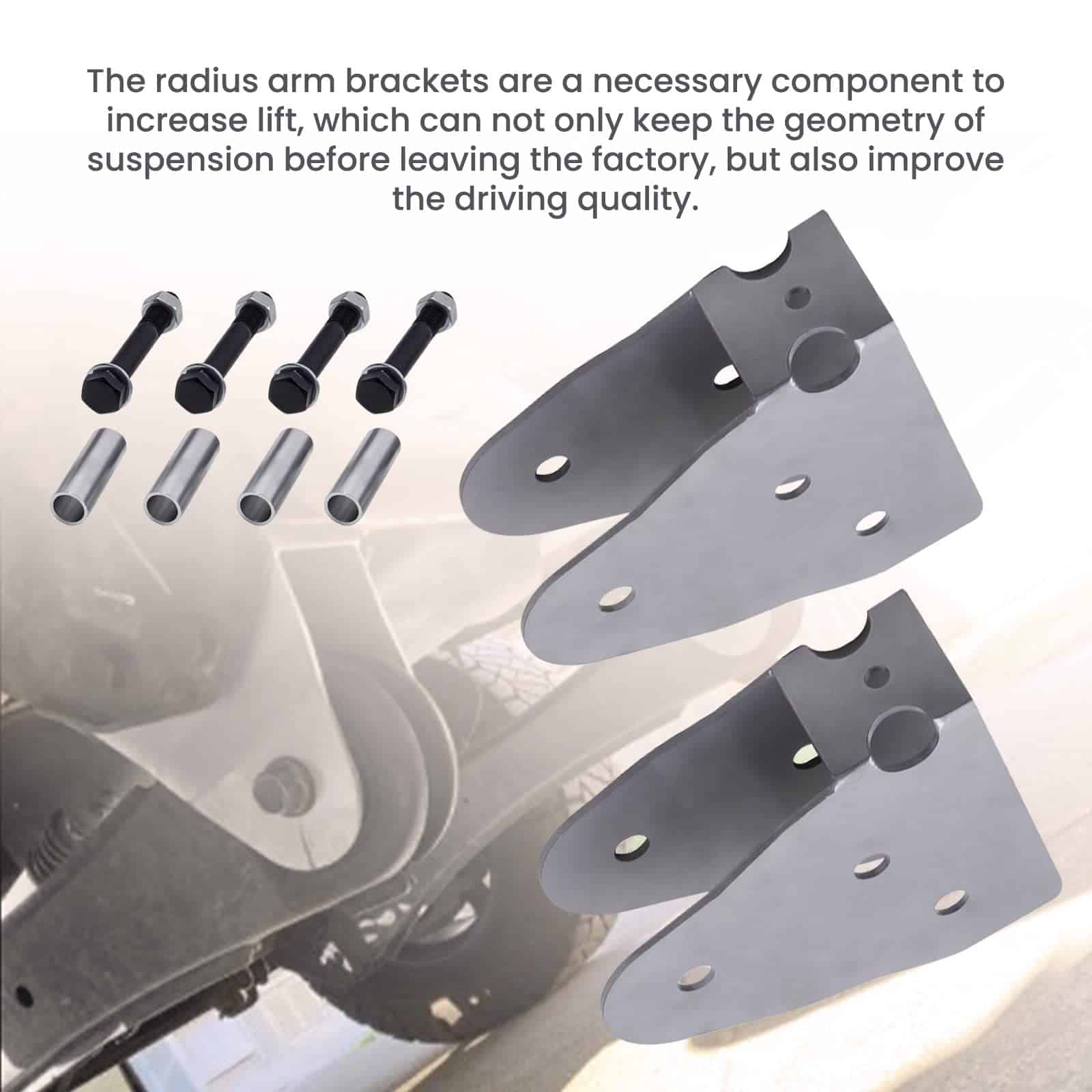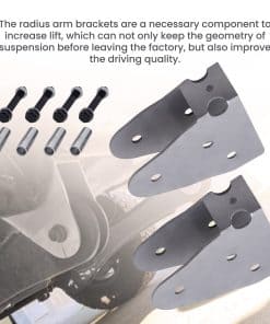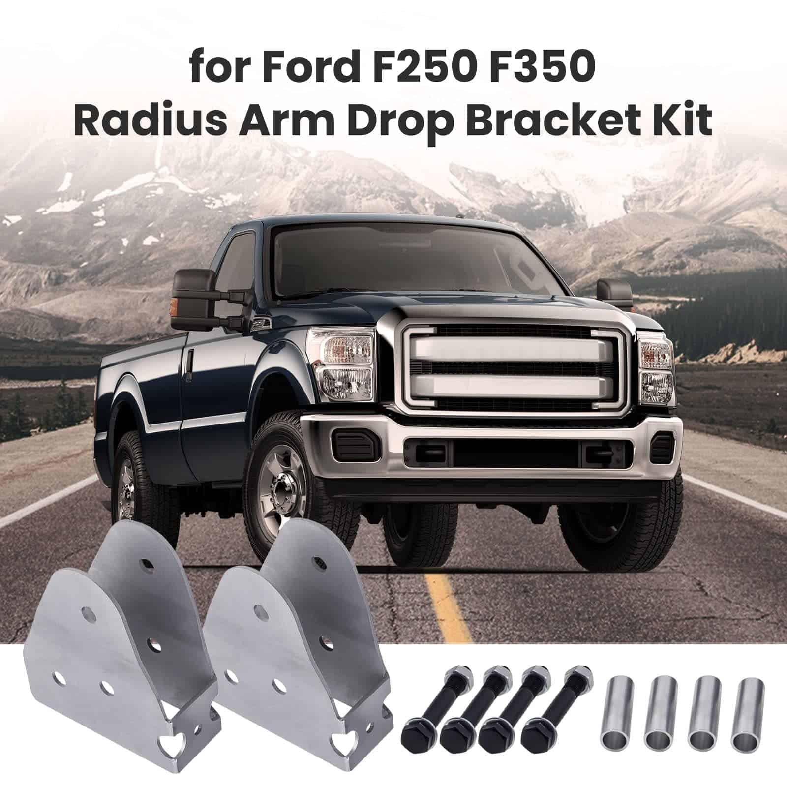 Soportes de Brazo de Radio para Camionetas Elevadas de 2-5″ APLICACIONES: 2005-2018 Para Ford F250 F3504WD 2005-2018 Para Ford F250 F350 Super Duty 4WD CARACTERÍSTICAS: – Estabilice sus camionetas elevadas: ¿Ha experimentado tambaleo de llantas después de elevar su camioneta? Este juego de soportes de brazo de radio puede mejorar la estabilidad y reducir efectivamente el desgaste desigual de las llantas – Actualice la Suspensión Elevada o Nivelada: El juego de soportes de brazo de radio reposiciona los brazos de radio de fábrica, restaura el ángulo de caster de fábrica, corrige la alineación y la geometría de la suspensión mientras mantiene una suave conducción de fábrica – Fabricado en Acero Resistente: Los soportes de brazo de radio utilizan material de acero premium, soldado a máquina para una resistencia superior, con recubrimiento de polvo para resistencia a la corrosión – Instalación Fácil: El paquete incluye espaciadores resistentes a la compresión que evitan la deformación del marco; Los agujeros están perforados con precisión y encajarán perfectamente en su vehículo CONTENIDO DEL PAQUETE: 2 x Soportes de Brazo de Radio 1 x Kit de Hardware NOTAS: No se incluye instrucciones, se recomienda una instalación profesional. Si necesita la guía de instalación, contáctenos