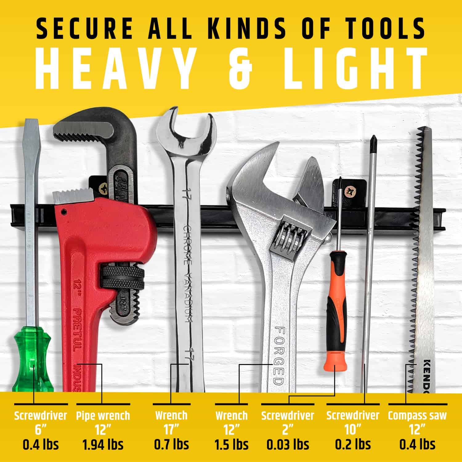 2. ASEGURA CUALQUIER TIPO DE HERRAMIENTA (48 pulgadas de espacio) – Estas tiras magnéticas de herramientas están diseñadas específicamente para sostener CUALQUIER JUEGO DE HERRAMIENTAS firmemente, sin deslizamientos ni movimientos. Nuestras barras magnéticas están calibradas para sostener de manera segura herramientas de diversos pesos con facilidad. Estamos encantados de ofrecer un almacenamiento sin preocupaciones y seguro para martillos, alicates, llaves, cortadores de alambre, destornilladores, cintas métricas, hachas y CUALQUIER otra herramienta que puedas tener, desde las más grandes y pesadas hasta las más pequeñas y ligeras.