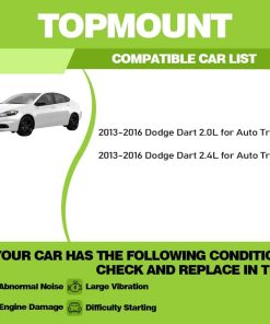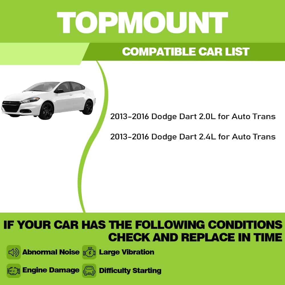 1. Compatible con Dodge Dart 2.0L y 2.4L (2013-2016): Este soporte de motor de repuesto de alta calidad encaja perfectamente, asegurando que su motor esté montado de forma segura para un rendimiento óptimo, ofreciendo una solución de reemplazo sin complicaciones.